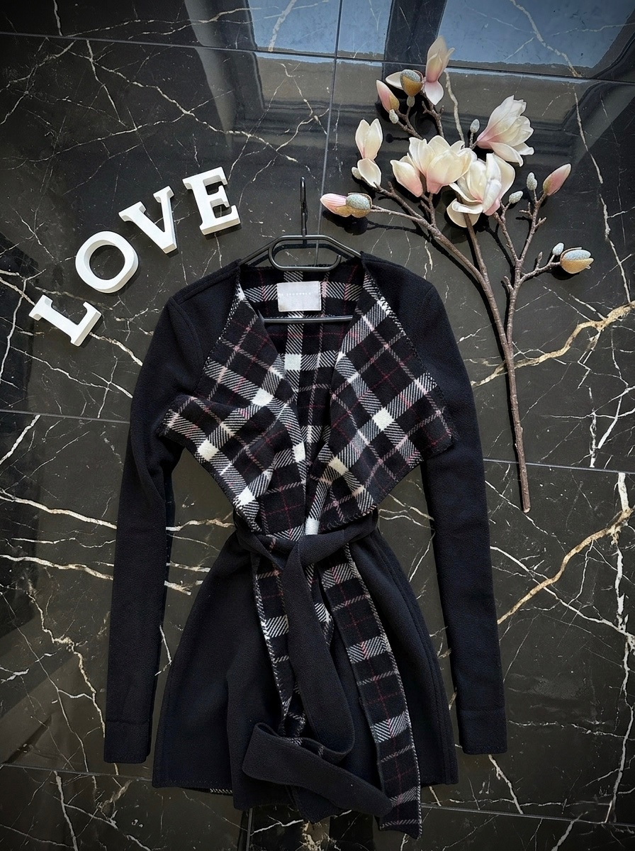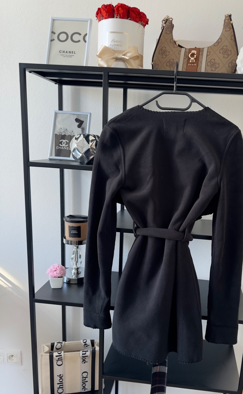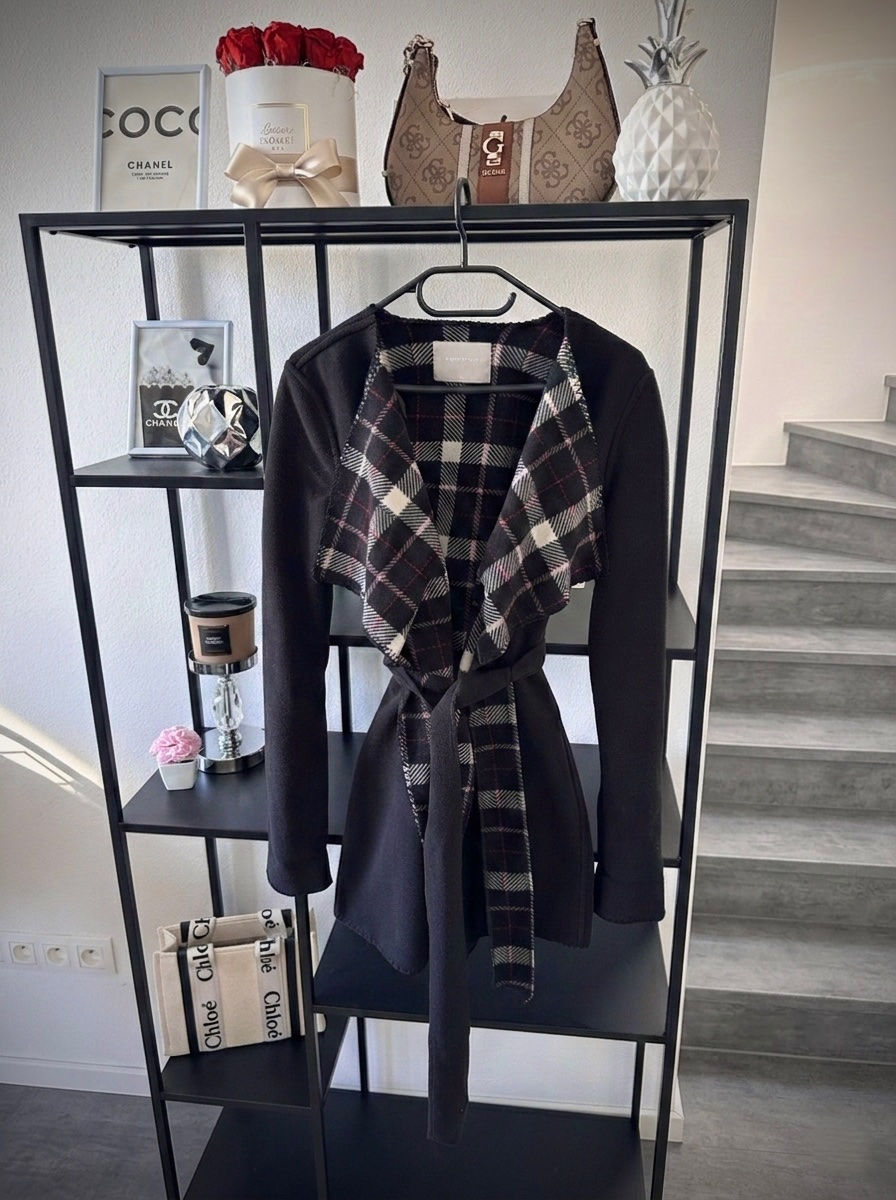 Prechodný kabát čiernej farby s káro podšívkou, s opaskom na viazanie, nosený málo, super stav bez poškodení.