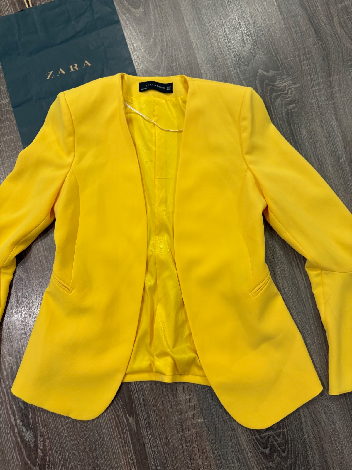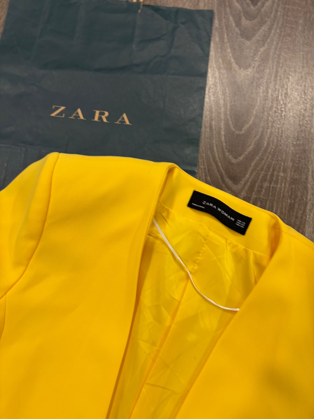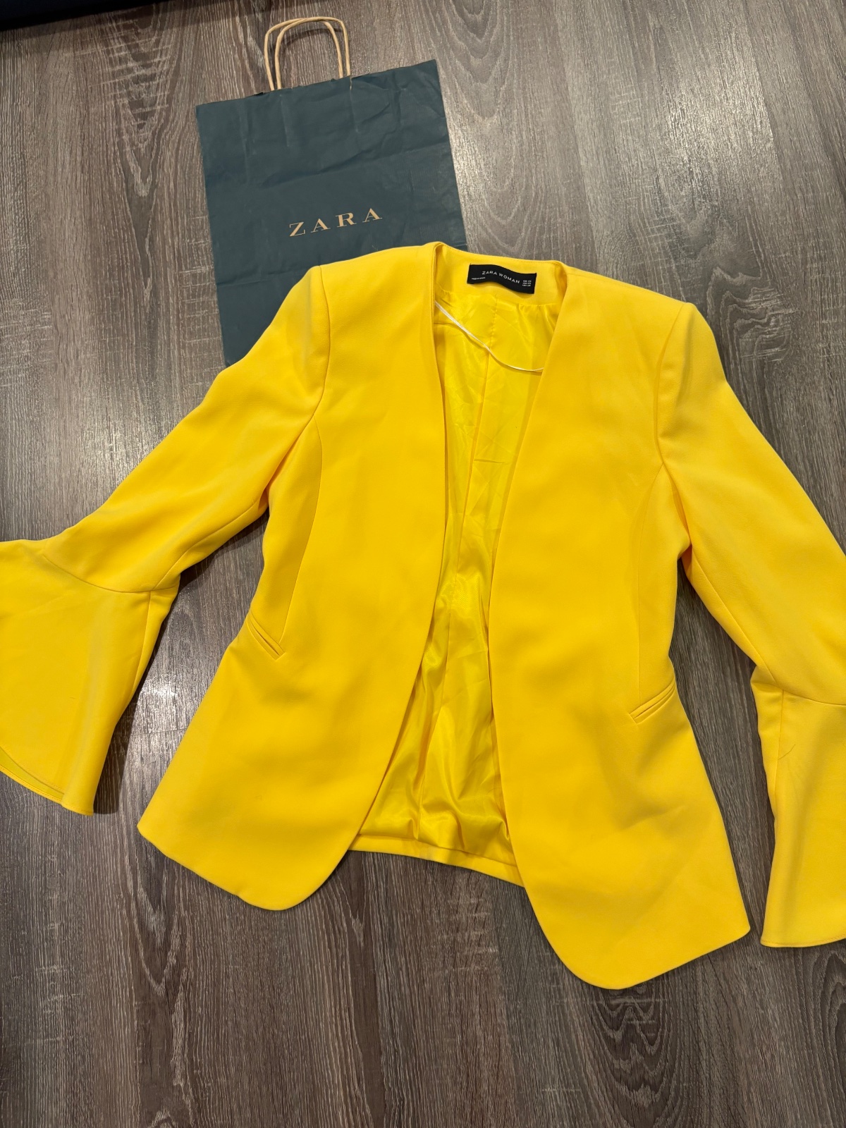 012.Zara krasne damske sako, v štylovej žiarivo žltej farbe.Velkost XS , dlzka je 68cm ,dlzka rukava od krku je 71cm a sirka v podpazusi je cca 42x2cm