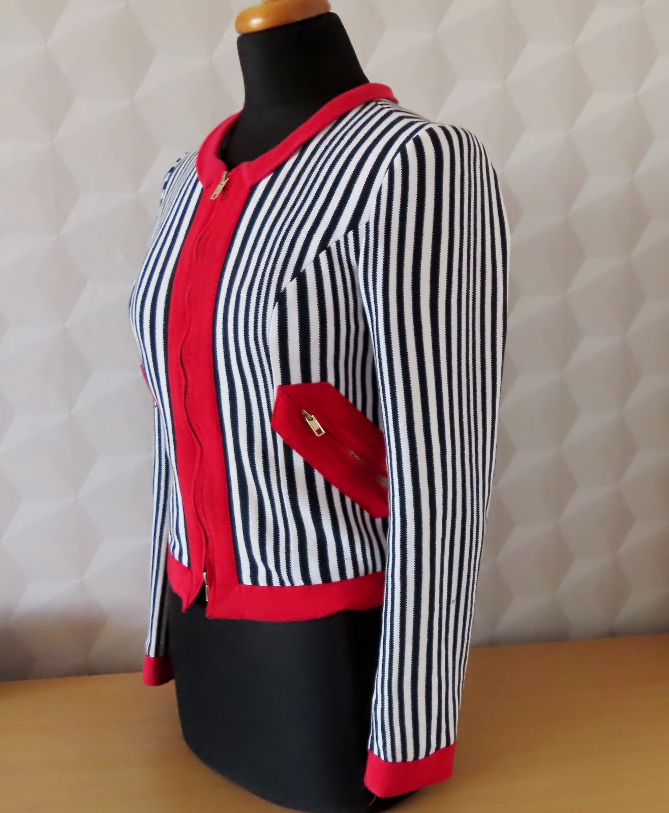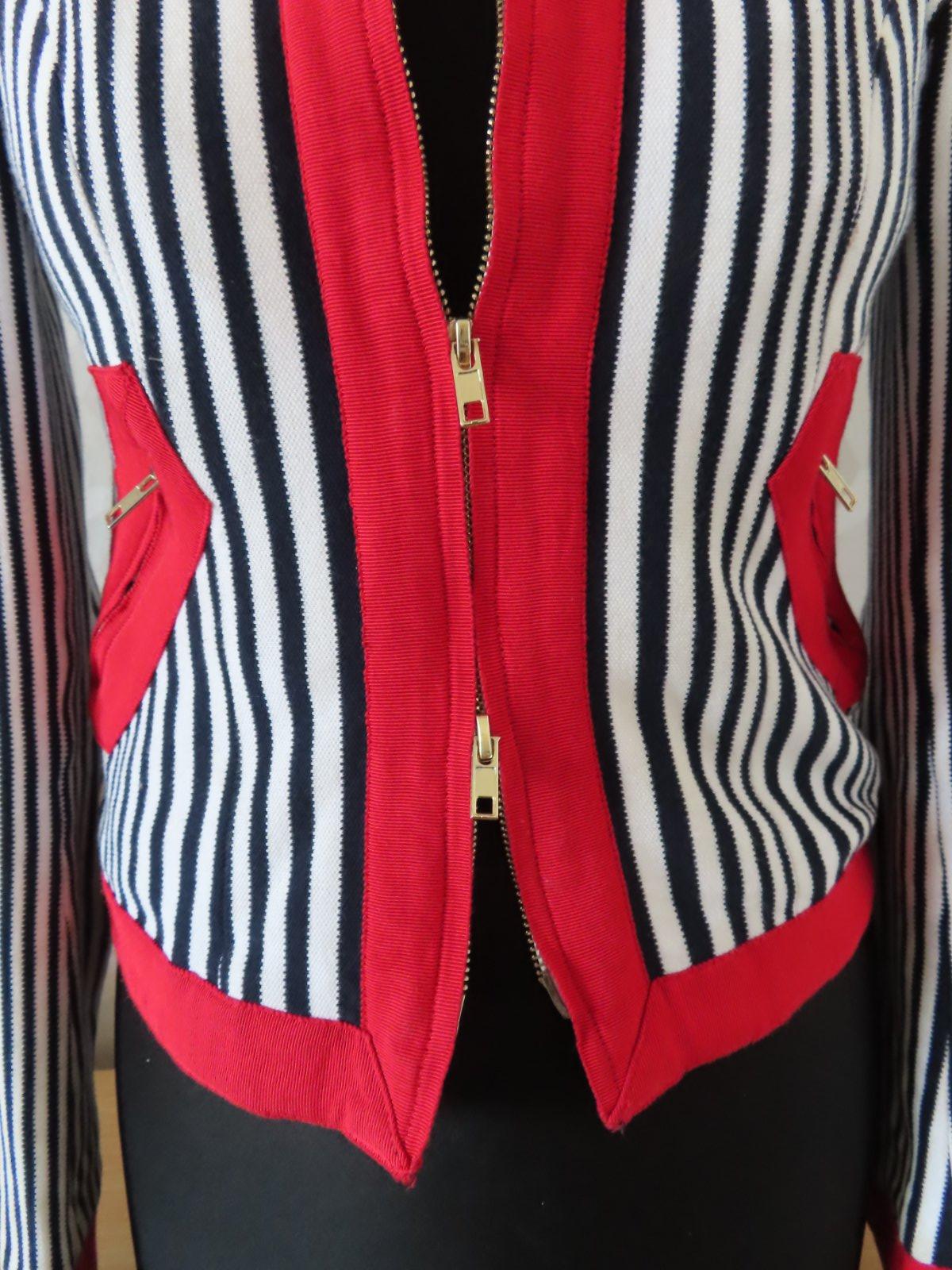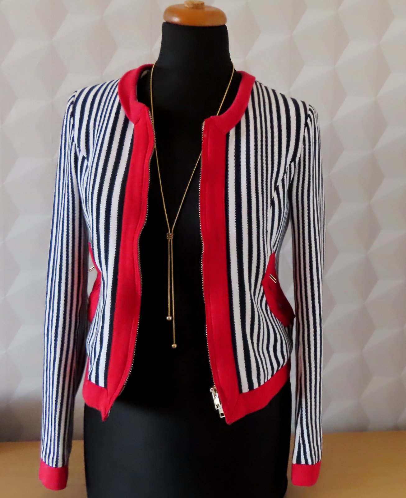 Zapínanie na zips, čierno-biele pruhy lemované červeným obšitím.