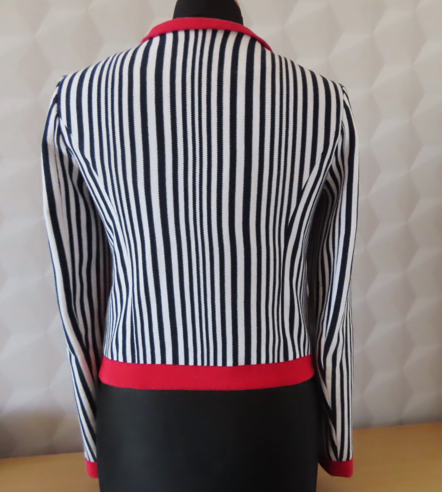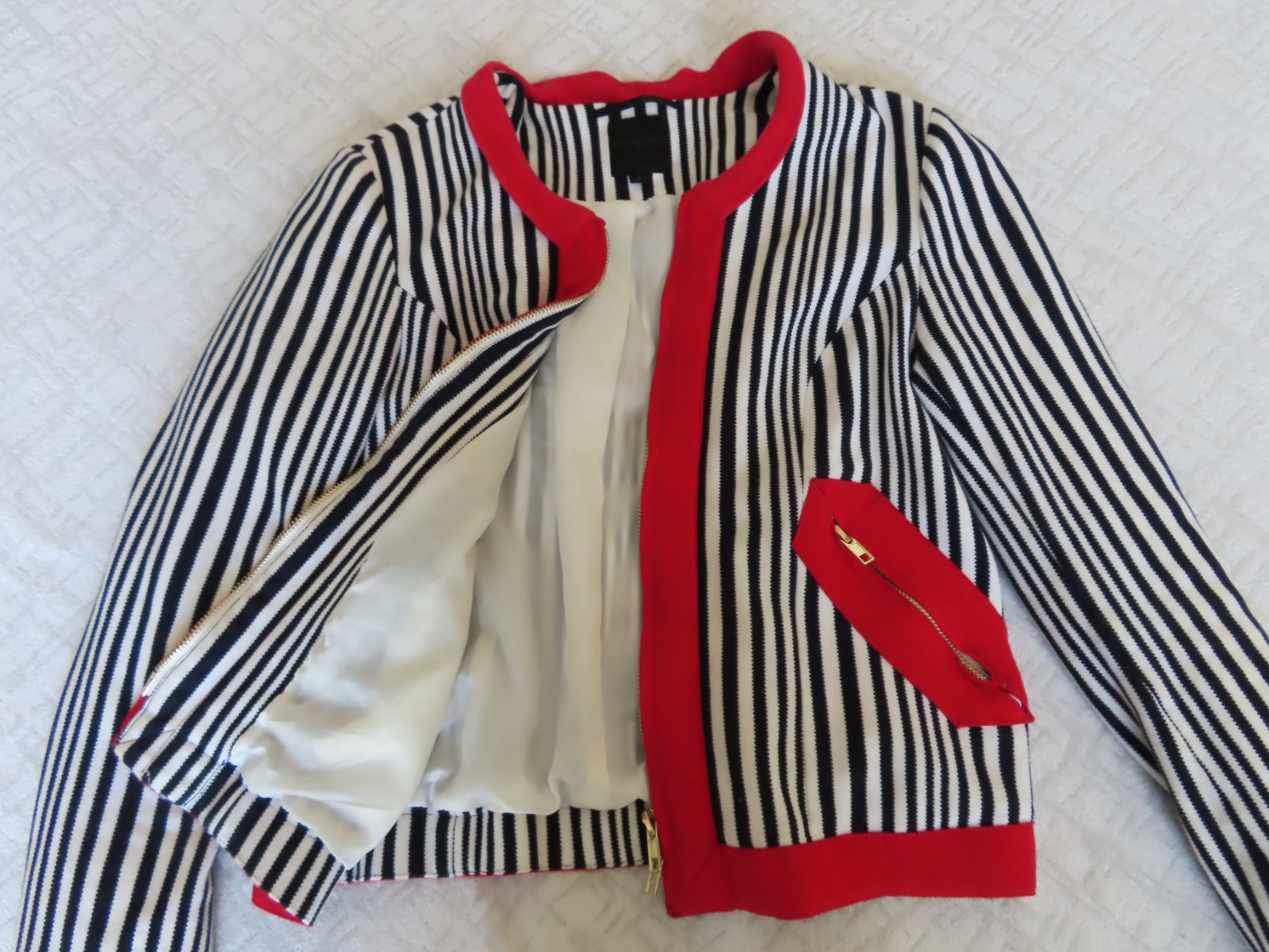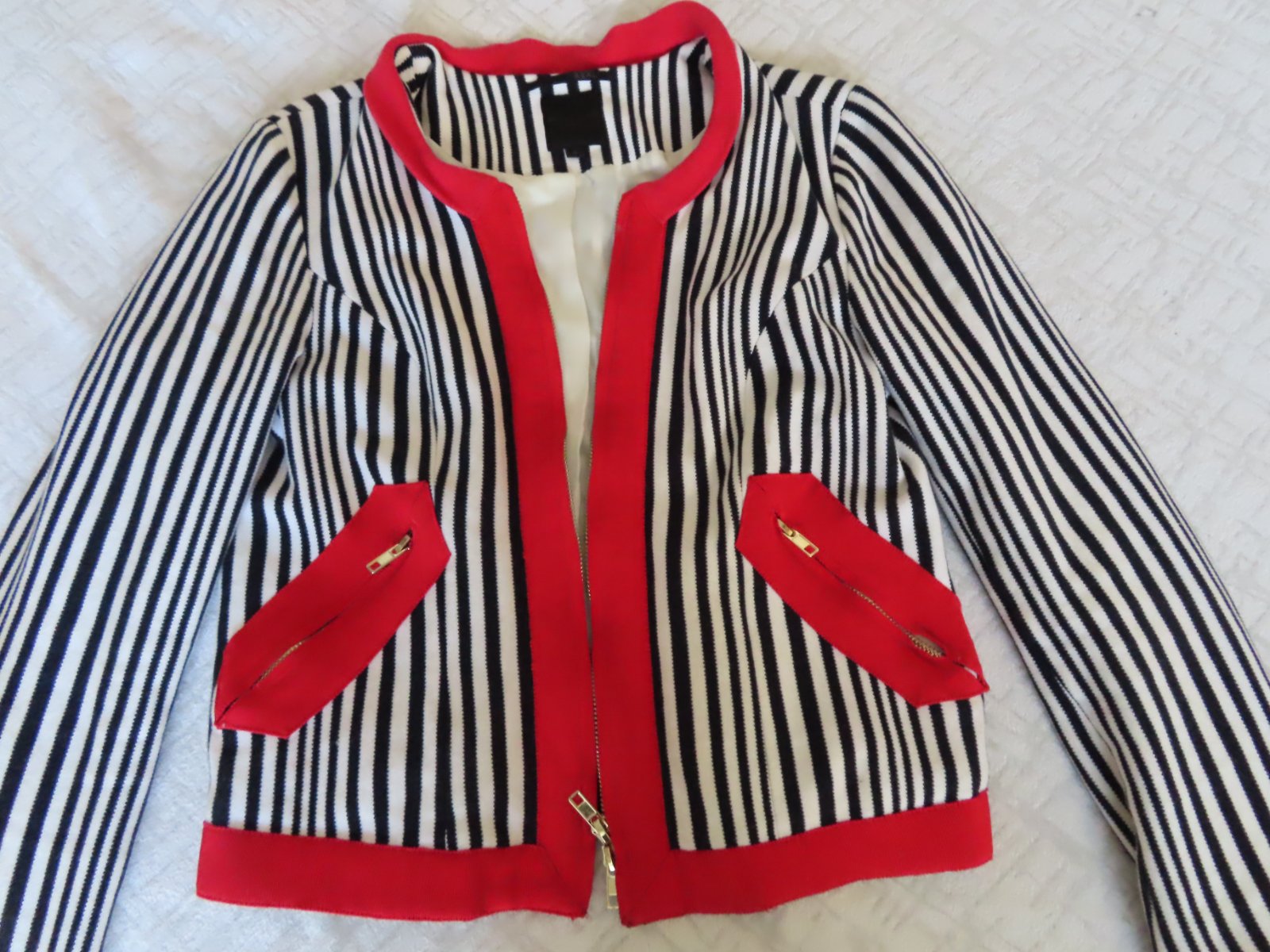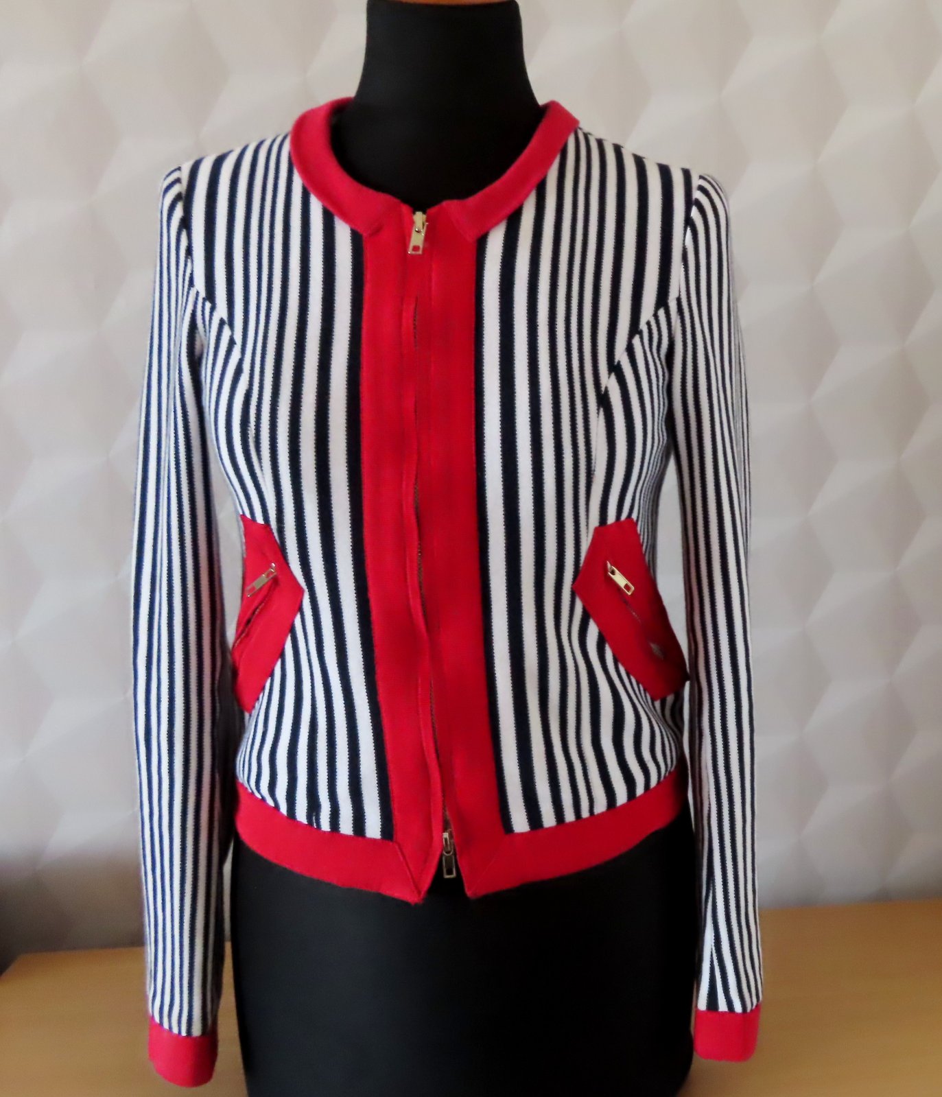 Zapínanie na zips, čierno-biele pruhy lemované červeným obšitím.