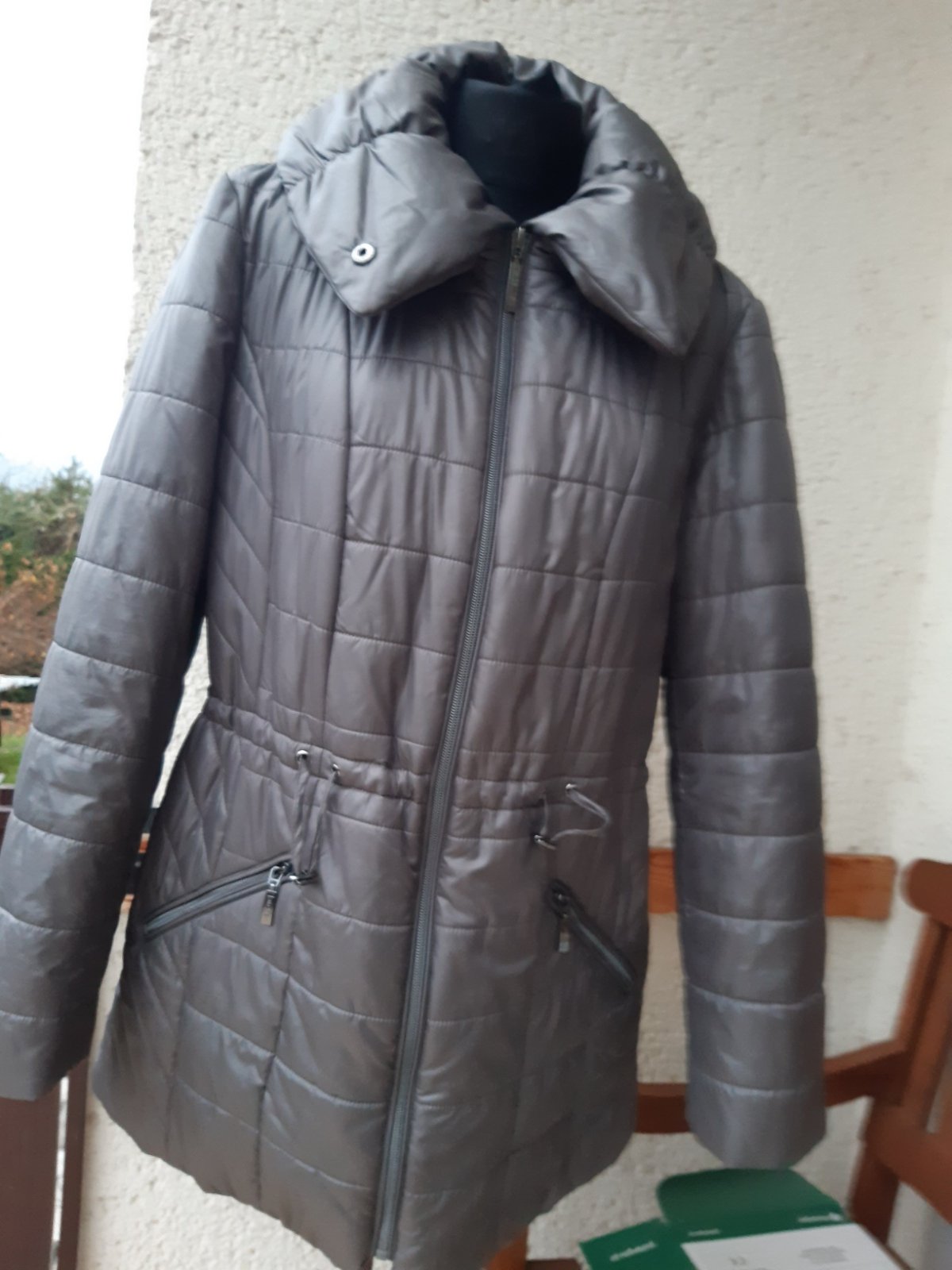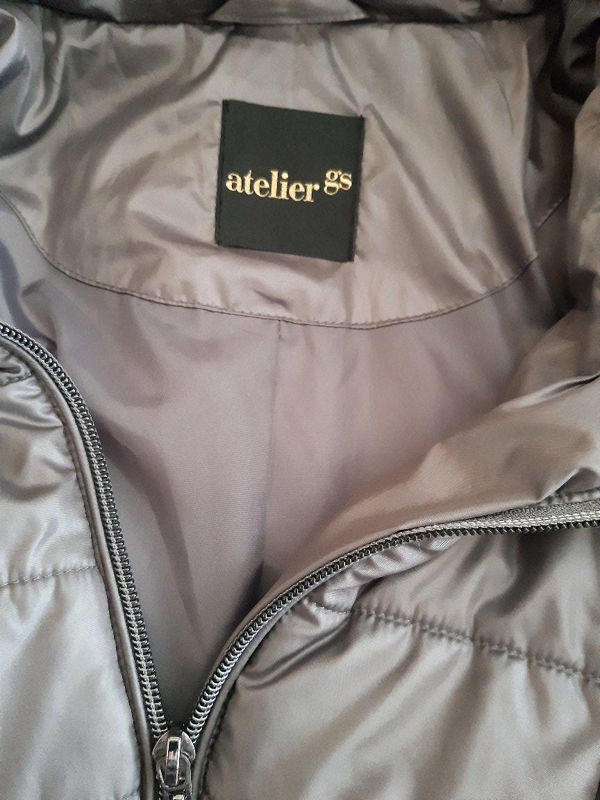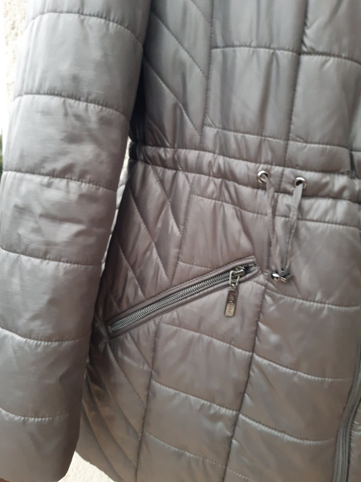 Zateplená bunda, nie veľmi hrubá, vhodná na miernejšiu až teplú zimu, stredne šedej farby. Značka atelier. Bunda je vo výbornom stave, bez známok použitia. Dl. 78 cm, dl. rukáva62 cm, šírka v podpáži 56x2 cm, boky 57x2 cm. Farba je pekná, ale zle sa mi fotilo, vyzerá na fotkách do hnedej farby, kaki, mení sa.