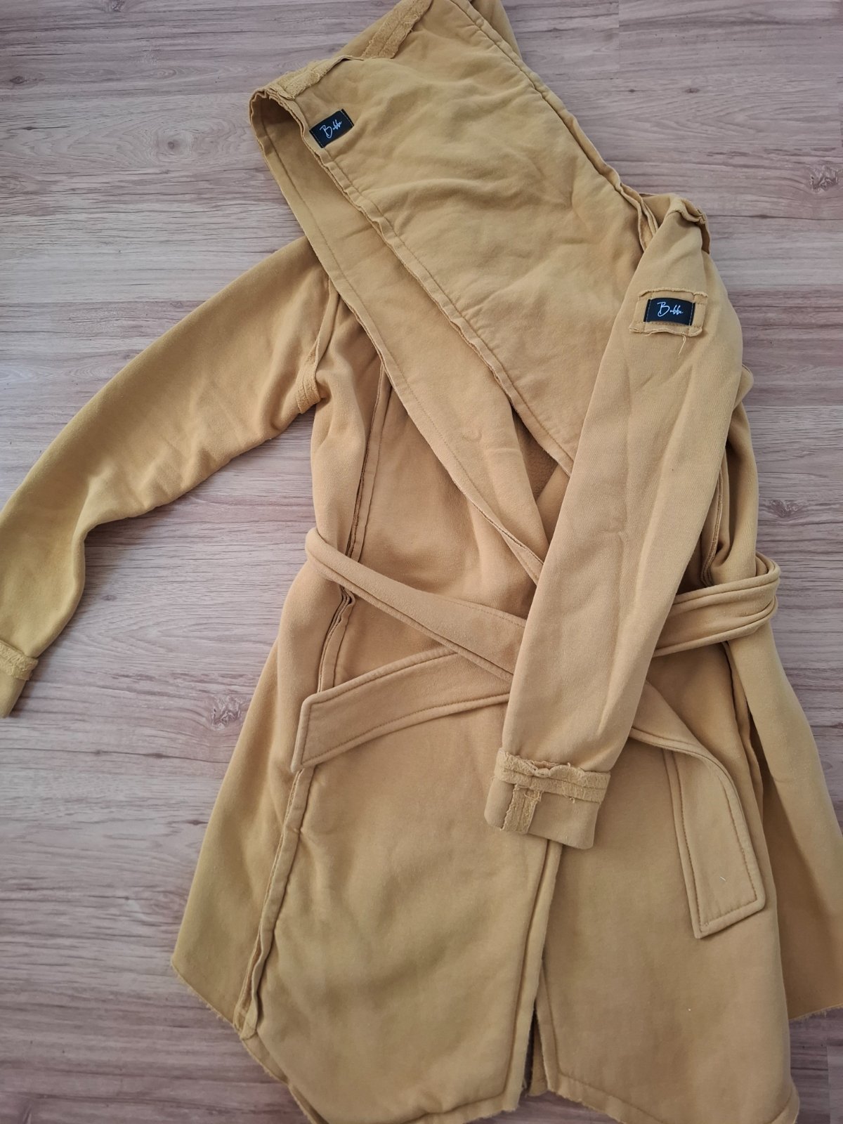 Prechodný jarný jesenný horcicovy kabát veľkosť 40. Kabat ma na sebe žmolky, inak nemá žiadne poškodenie. Preto posuvam za symbolickú cenu.