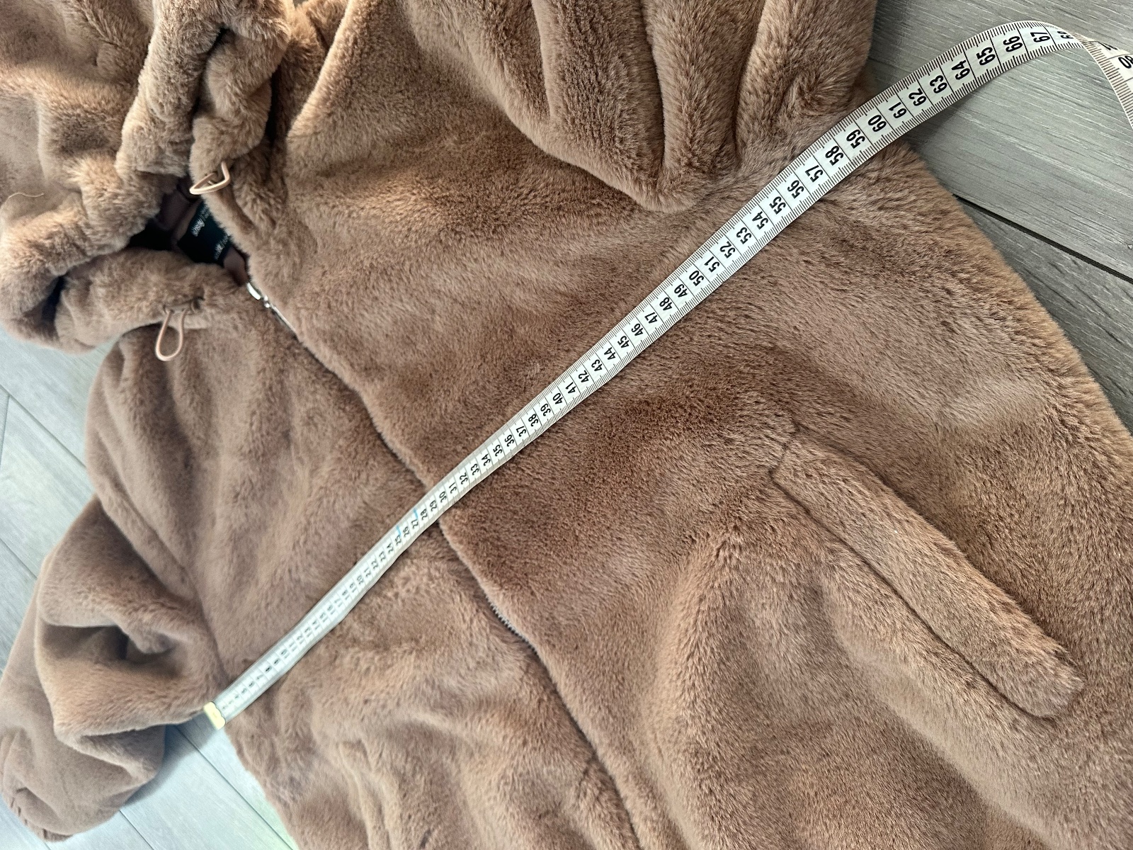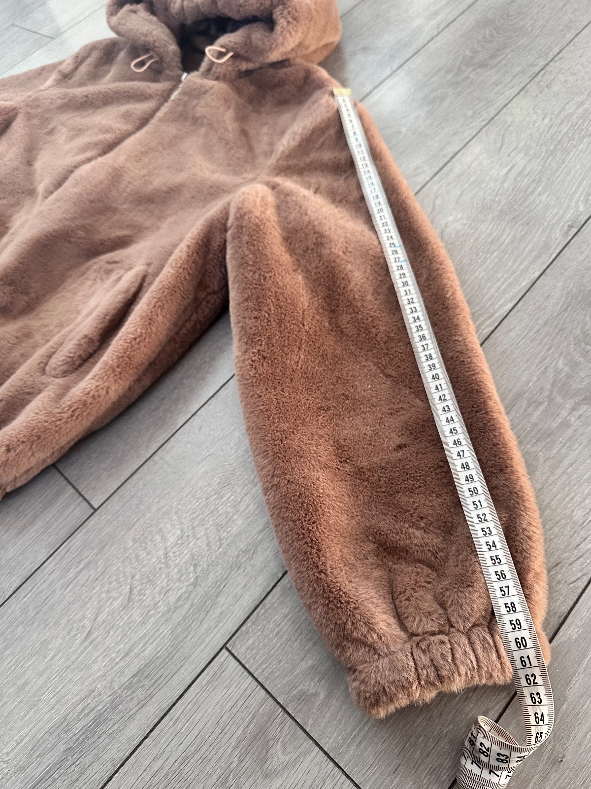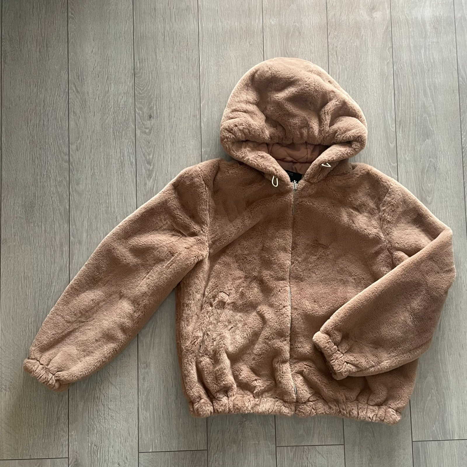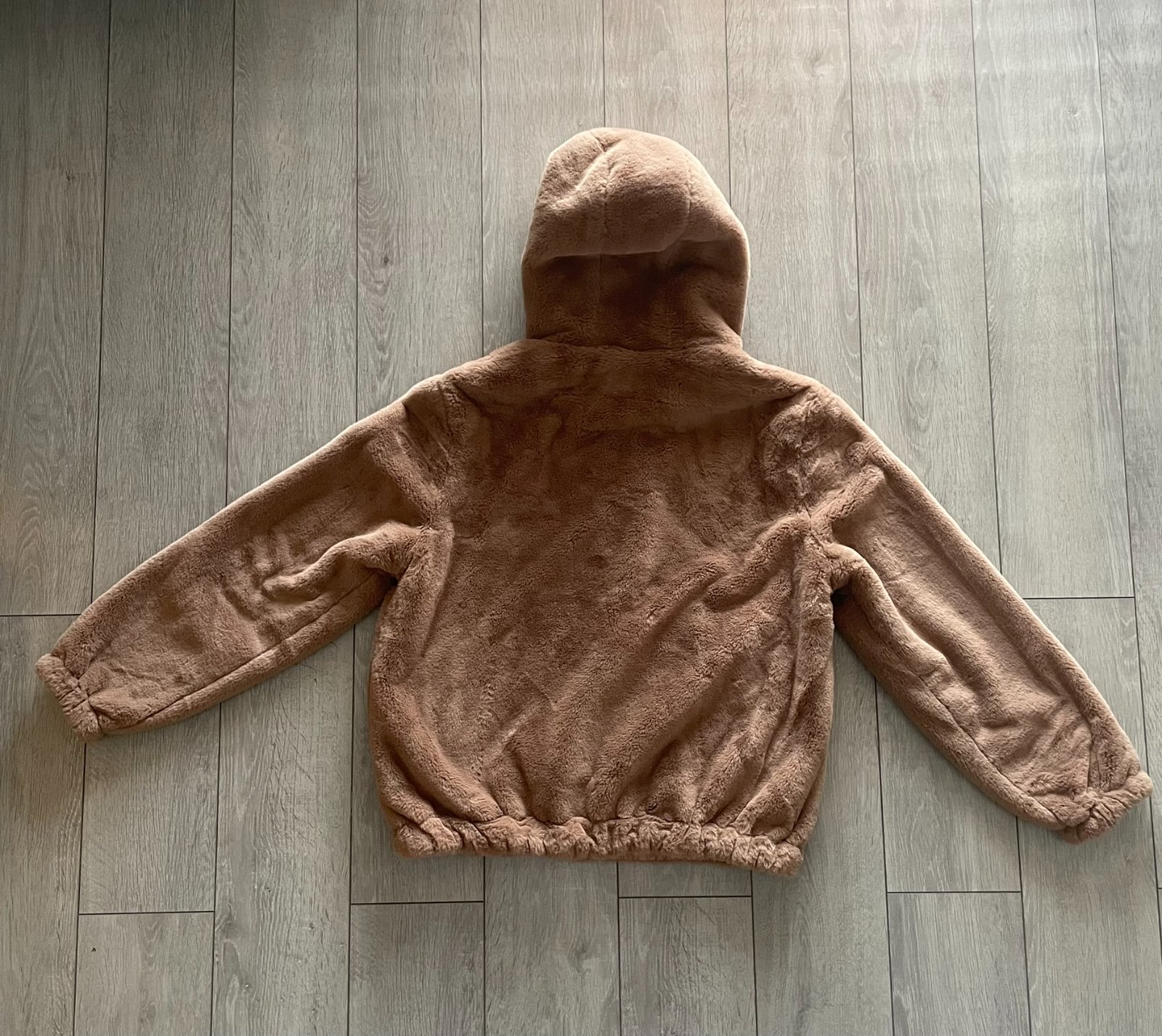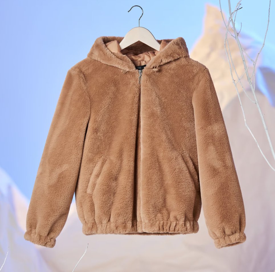 Huňatá hnedá bunda s kapucňou, kožuch, kožúšok.