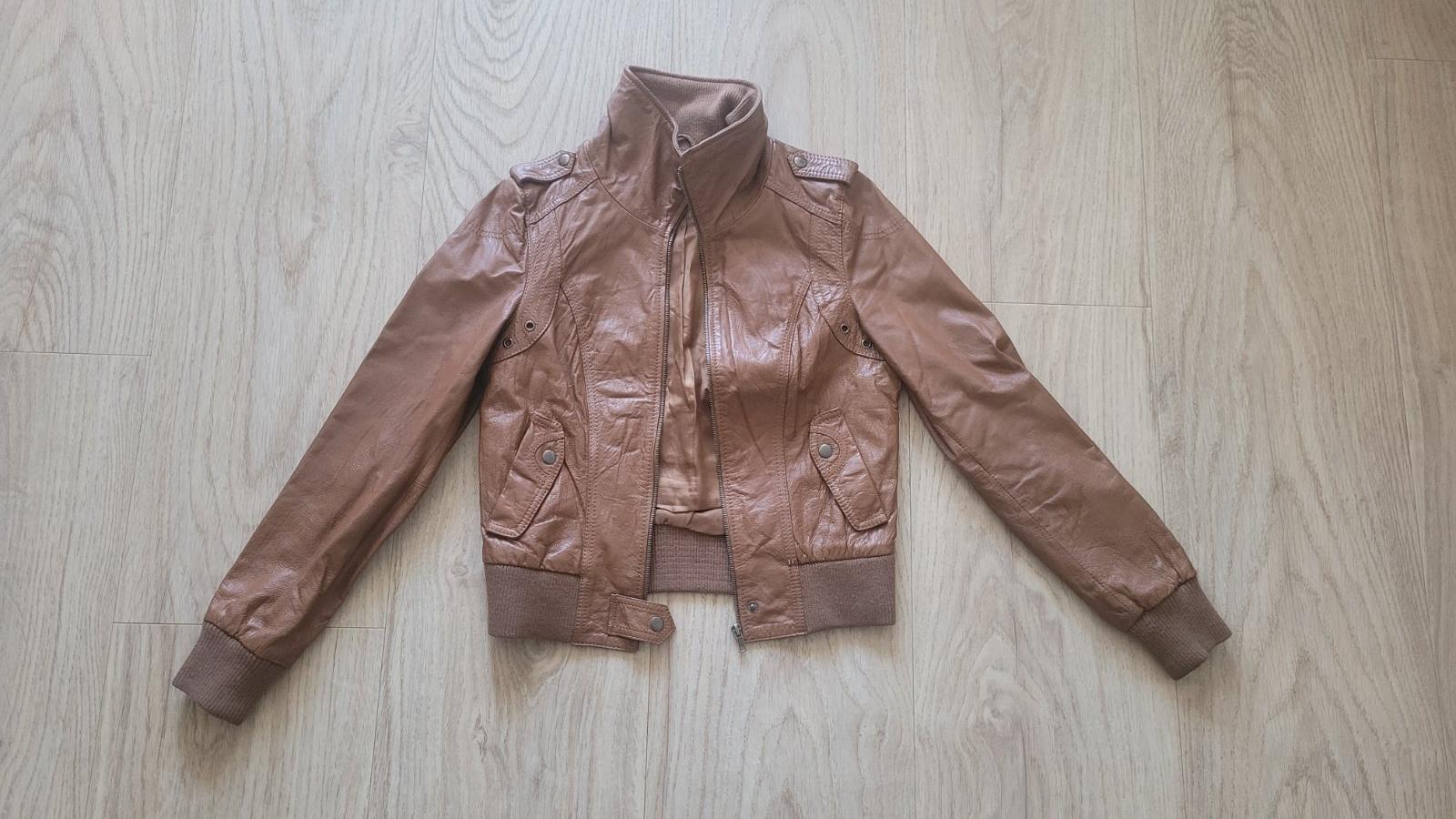 Kožená tmavohnedá bunda zn Only, z pevnej kvalitnej kože, kovový pevný zips, vhodné i na motorku. Miery: dlzka 55, prsia 50, pás 43, rukav 65cm