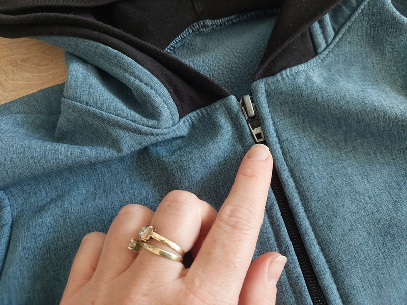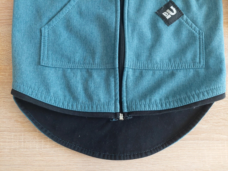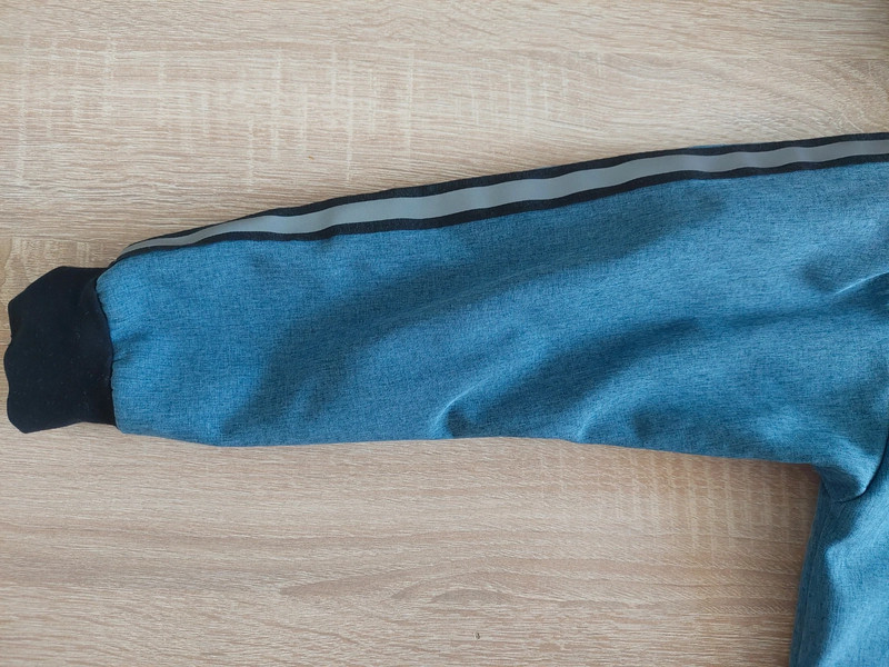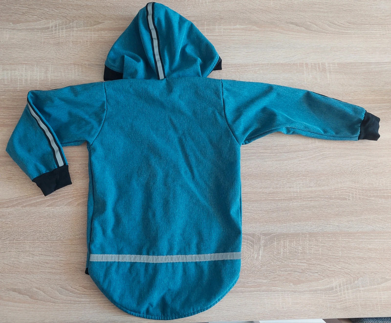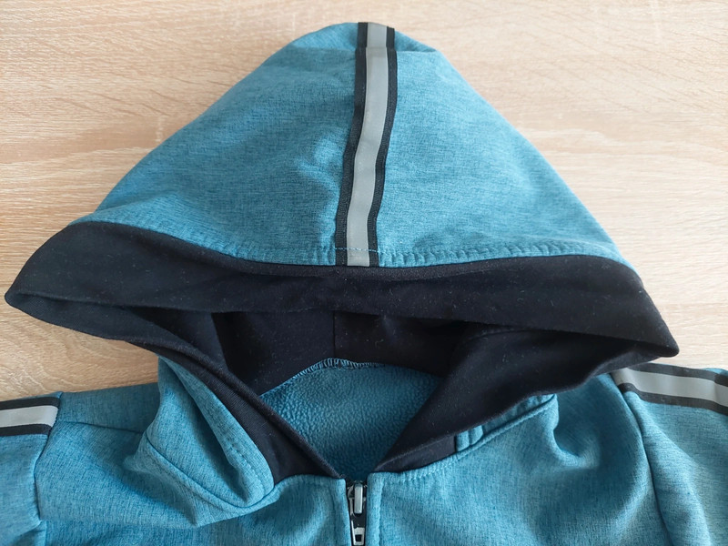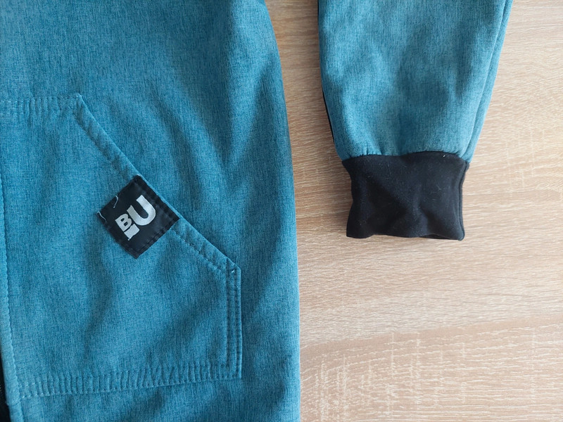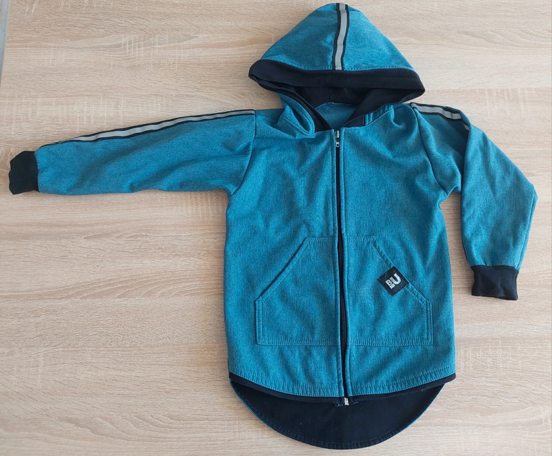 top stav, ošúchaný bežec na zipse a na patentoch na rukáve dve drobné dierky (syn mal obdobie okusávania); inak bez poškodení. Nosená len 3 týždne v jeseni a už nám je malá. Softshellová bunda petrolejovo modrej farby, z vnútornej strany zateplená fleesom. Vhodná na jar a jeseň. Bunda má predĺžený strih (zadný diel je dlhší) a reflexné prvky na kapucni.