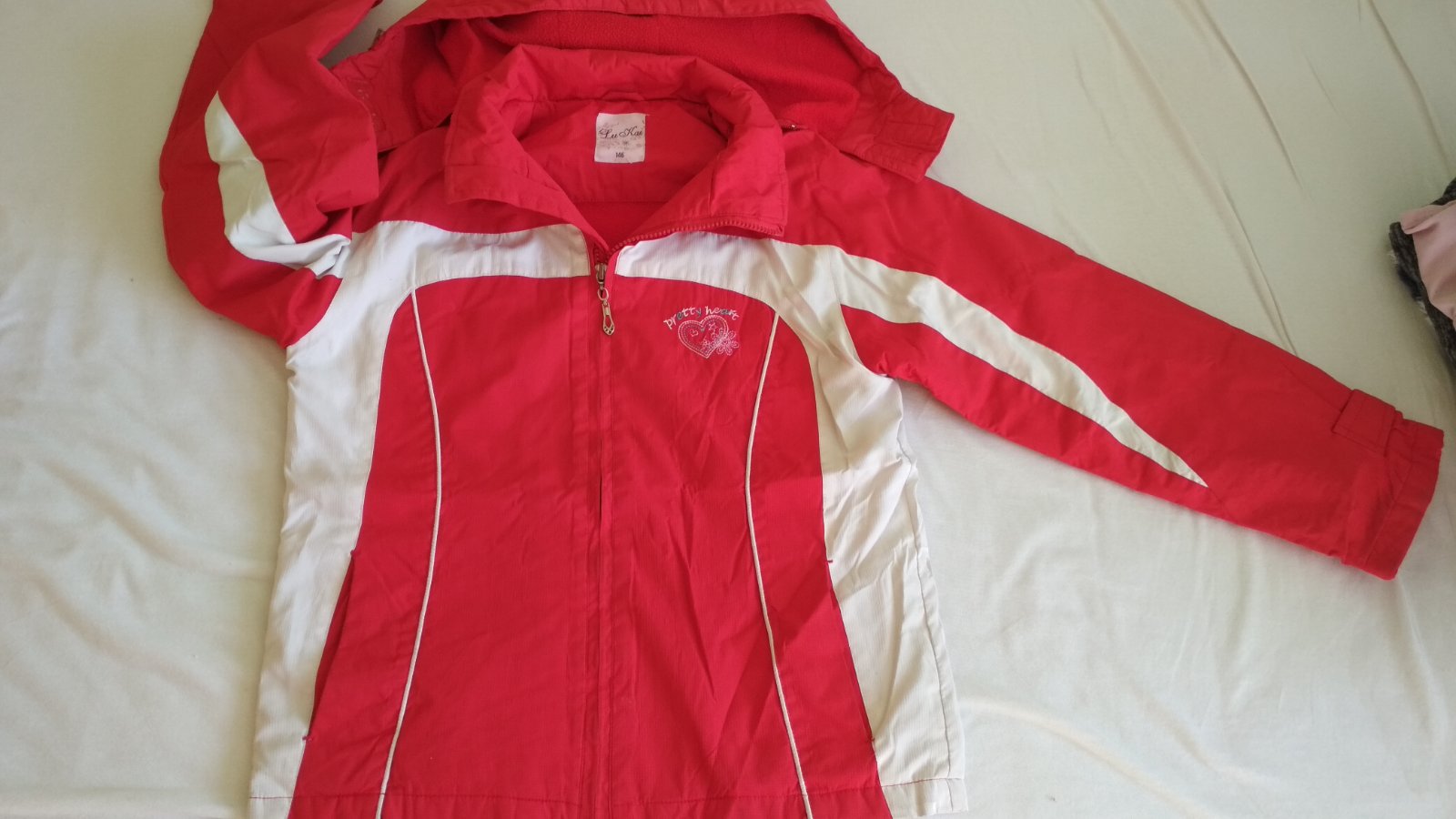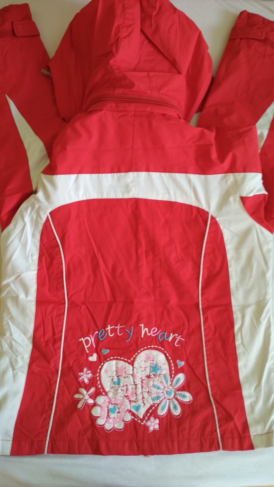 Dievčenská outdoorová vetrovka - farba: ružovo-červená - zn. HEAD - veľ. 140-146 - v dolnej časti stiahnuteľná gumičkou, kapucňa tiež stiahnuteľná gumičkou - dĺžka zadného dielu: cca 65cm, šírja pr...