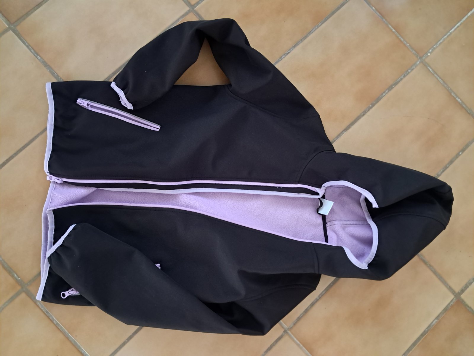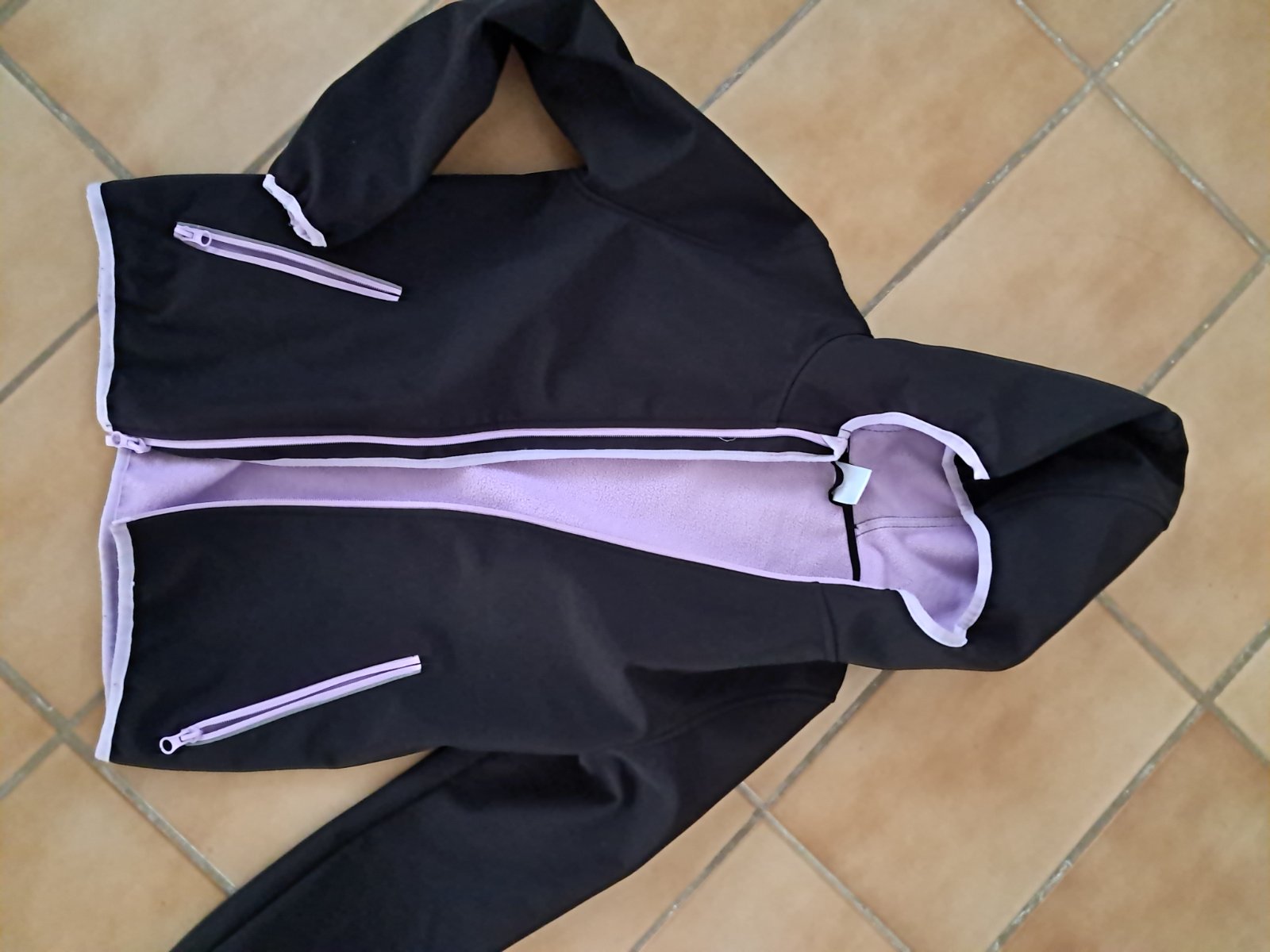 Čierna softshelová vetrovka s fialovým vnútrajškom, veľkost 134/140.