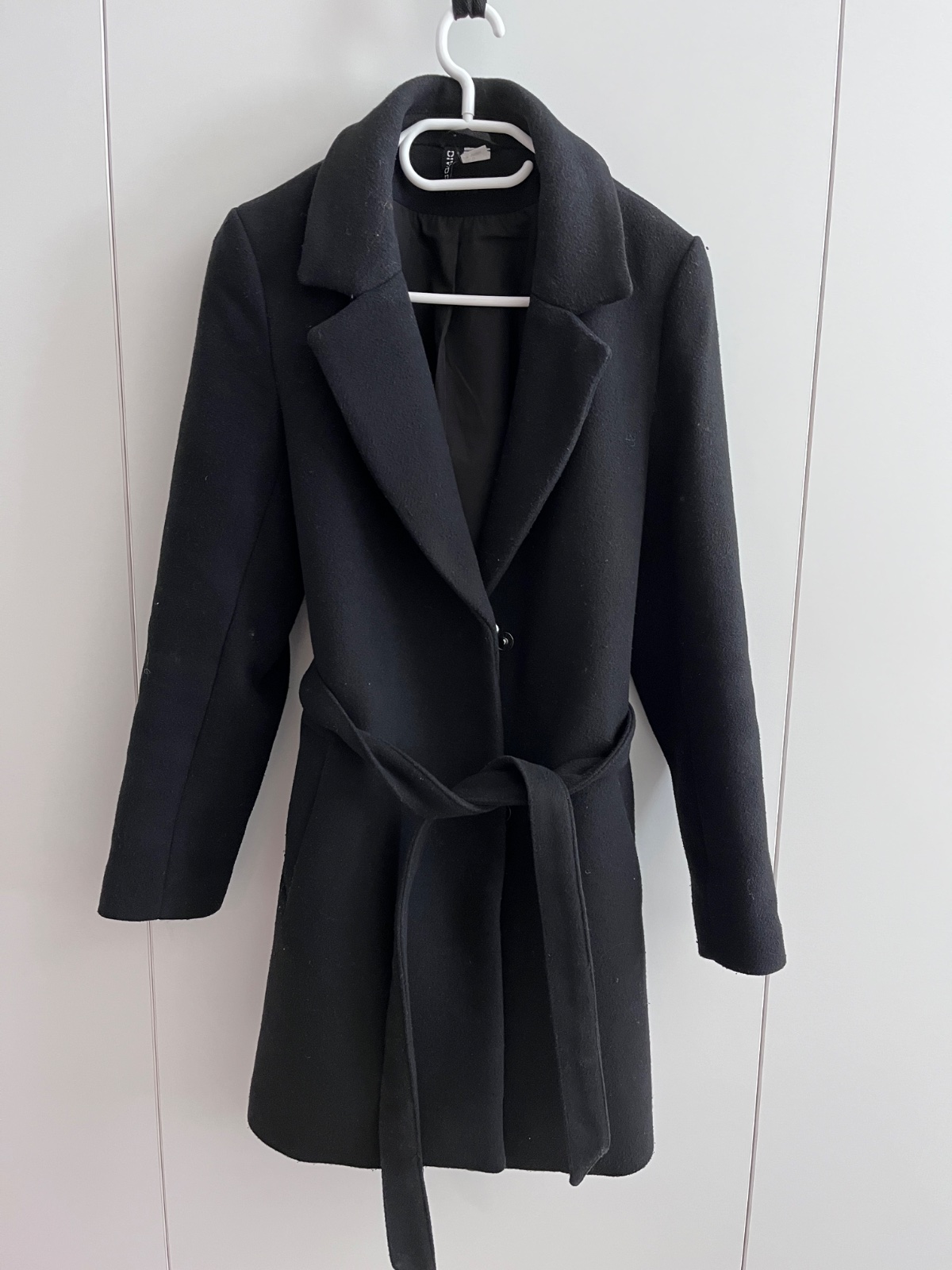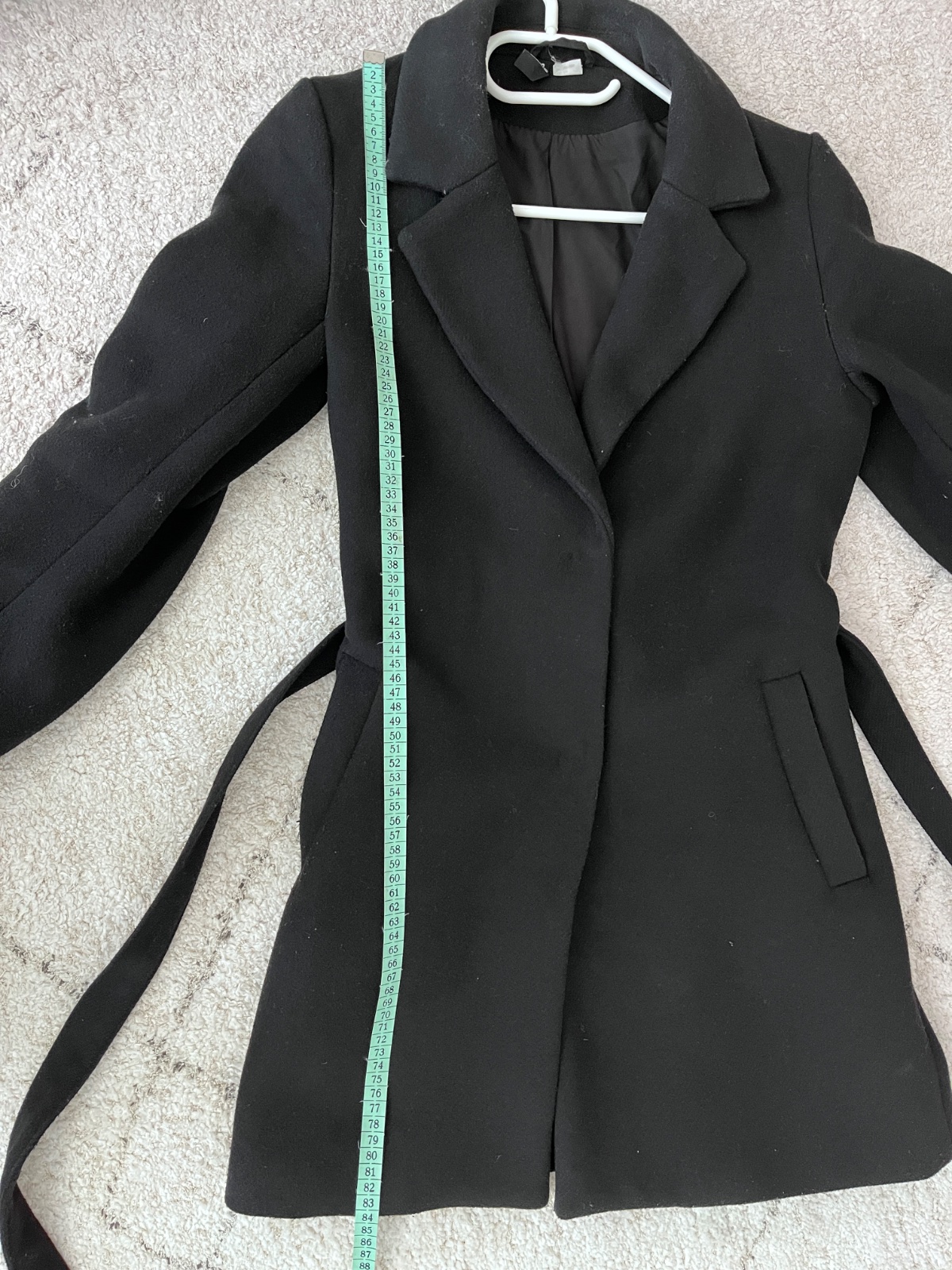 H&M krasny zimný kabatik bez poškodení, čierna farba,velkost je S, dlžka je 66cm, dlžka rukáva od krku je 72cm a širka v podpazuší je cca 42x2cm. zapínanie na gombiky a v páse sa da stiahnut s opa...