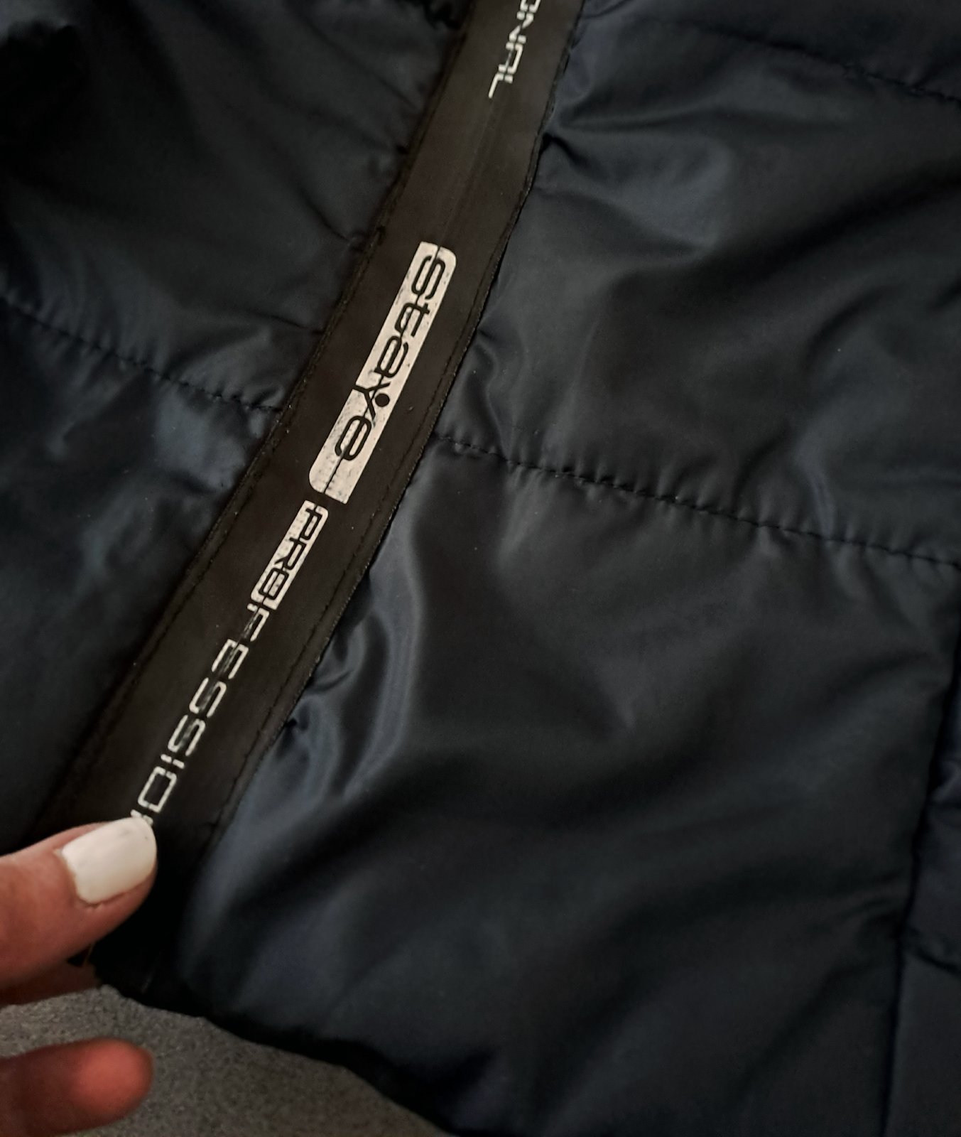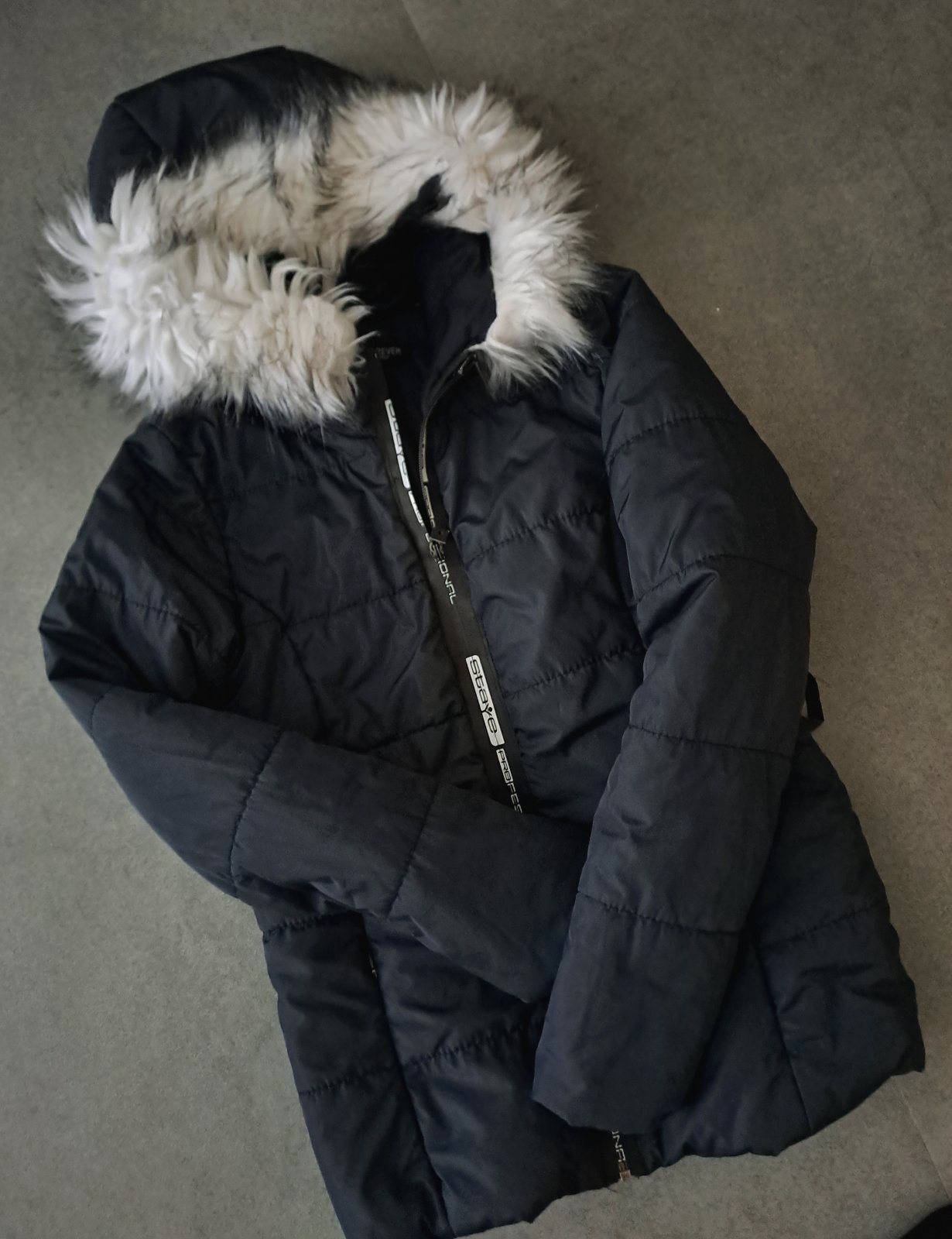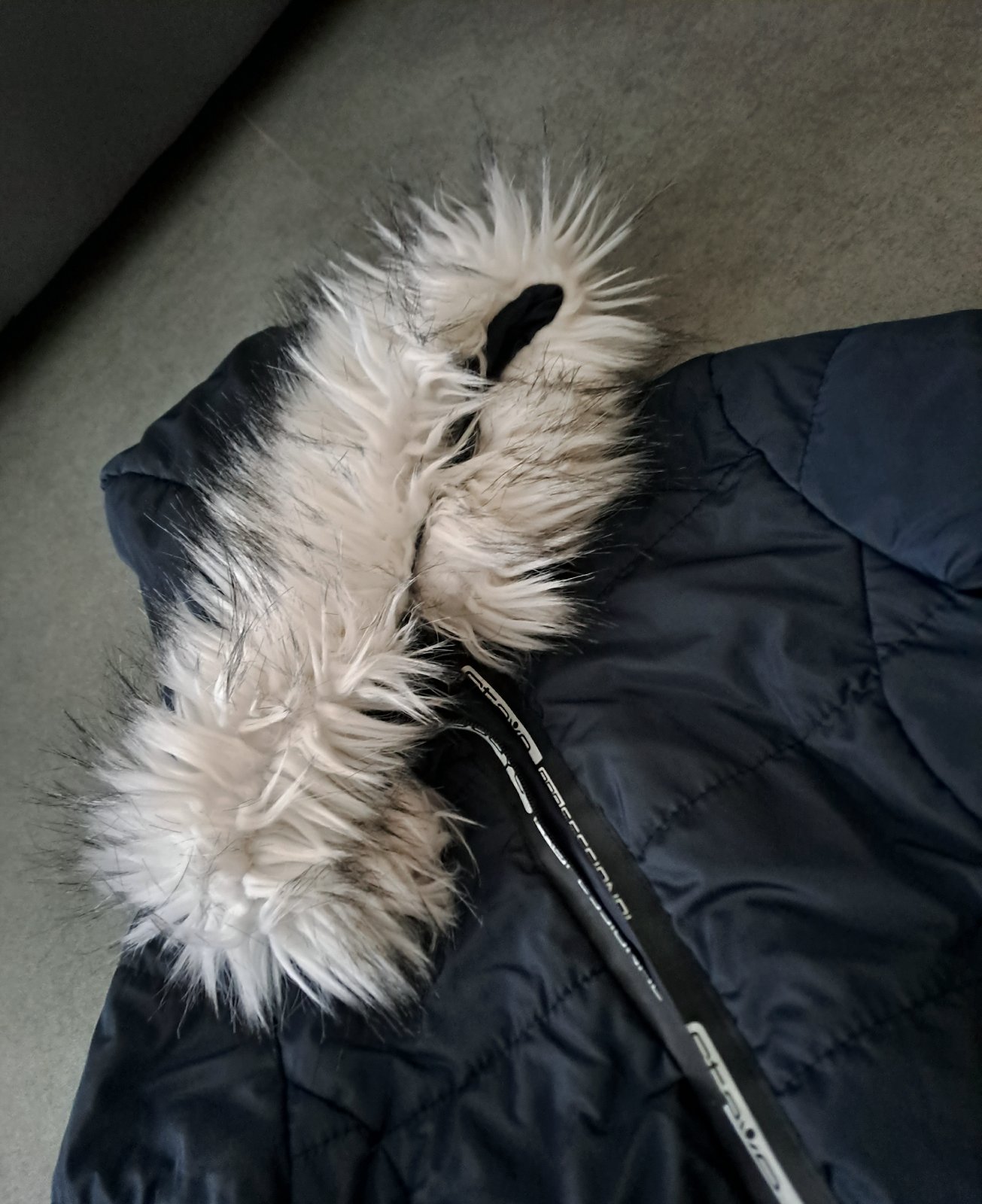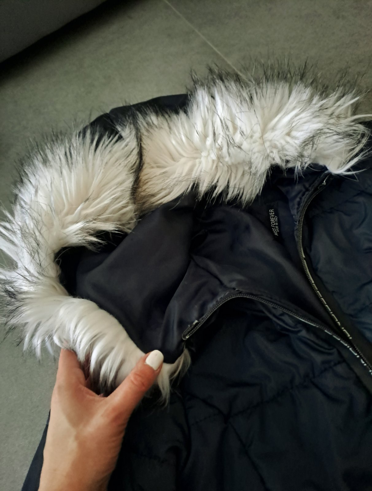 S bielou kožušinkou. Kožušina nejde dole ne všitá na kapucni. Zips pevny funguje kvalitne. Vacky orovizorne iba na ruky.Nosená sezónu pár krát na striedačku sadne aj na číslo 164 ci xs treba premerať šírka pod pazcuhami 48cm dĺžka na foto 65cm