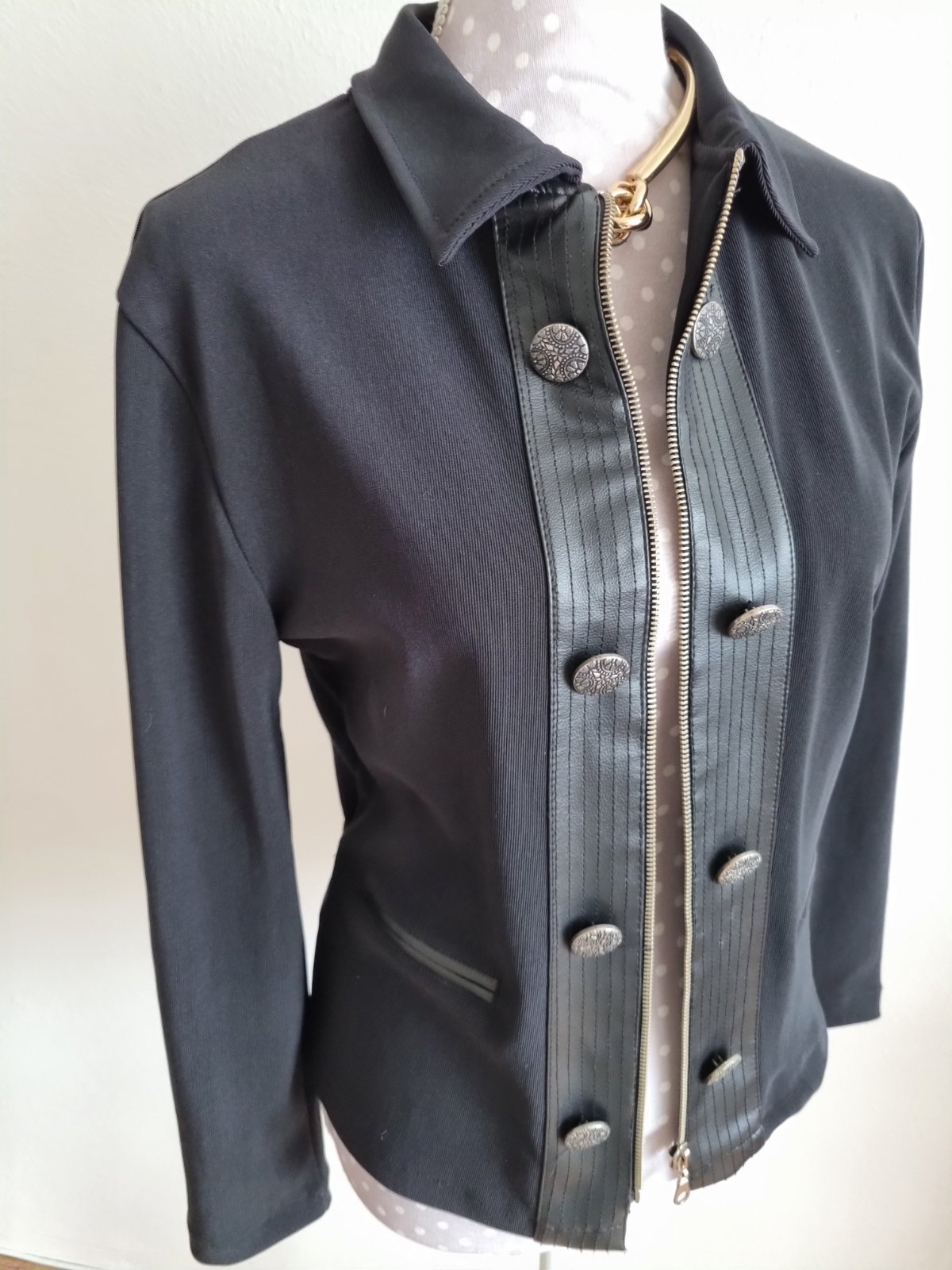 Elastické, oblečené asi 2x..úplet syntetický so štruktúrou pásikov v kombinované s koženkou...dlžka 58, rukáv od krku 70, vez prsia 2x46 v kľude...ešte sa natiahne