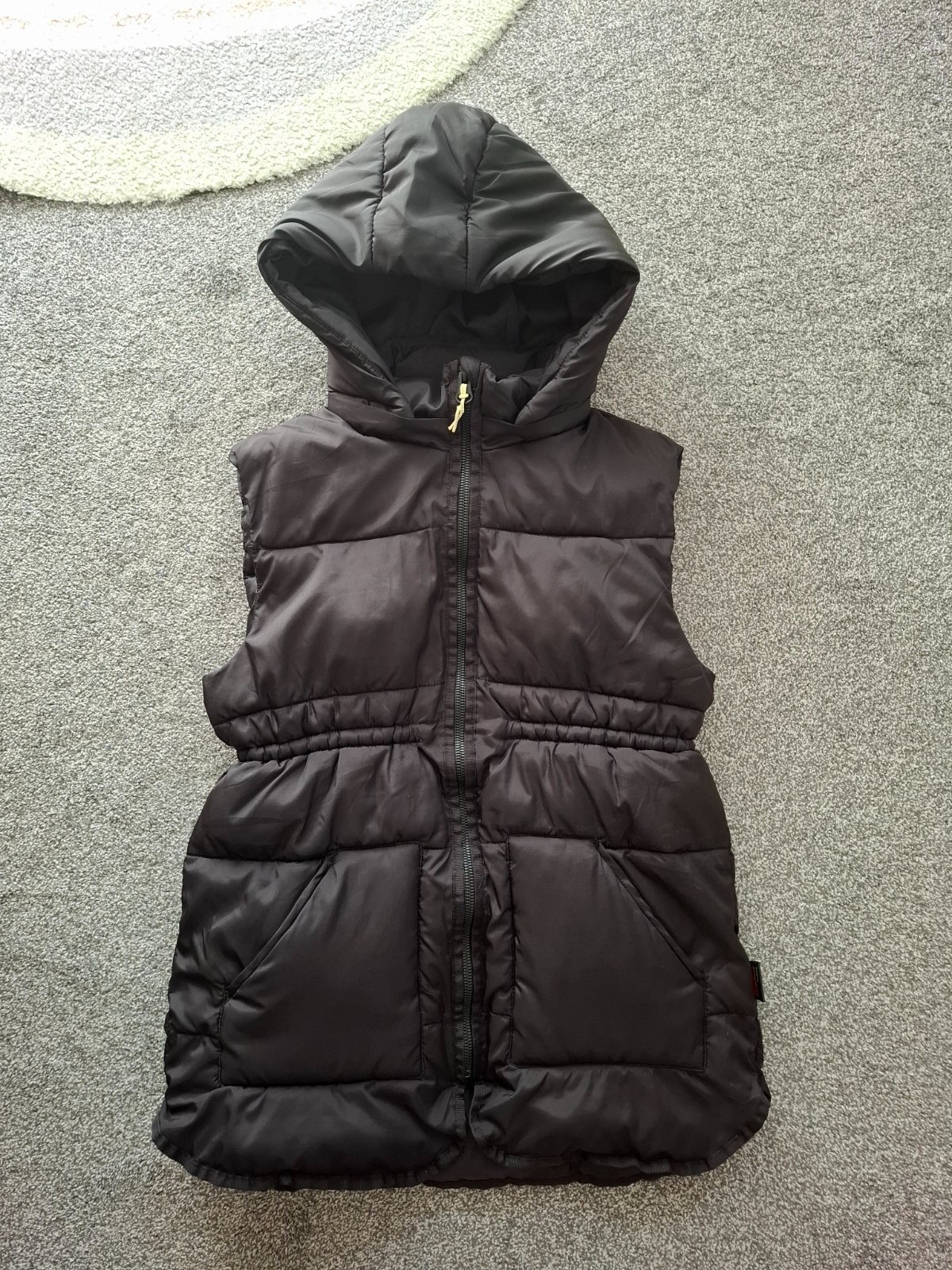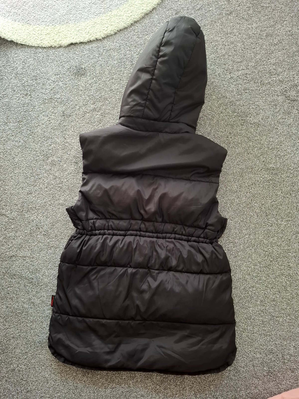 Dievčenská vesta s odnímateľnou kapucňou, sťahovaním v páse a s dvomi bočnými vreckami. Bez poškodenia. Farba je pekná čierna. Nie je vyblednutá. Len na fotke tak vyzerá. Veľmi málo nosená.