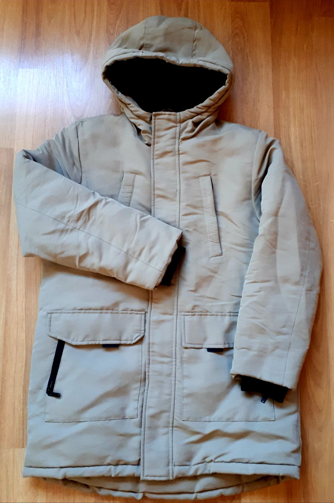 Nie je prilis hruby, vhodny na bratislavsku zimu, nepremokavy, ma odopinatelnu kozusinku, je kavovej farby - tak ako je na uvodnom obrazku z predajne, PC bola 35e, noseny jednu sezonu