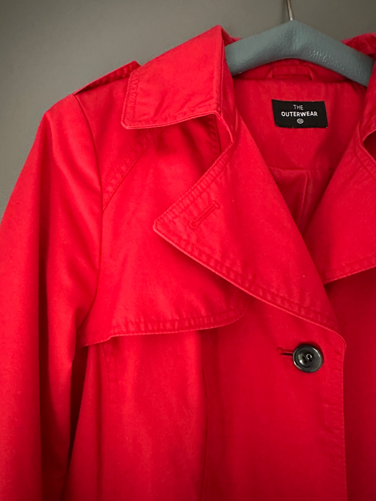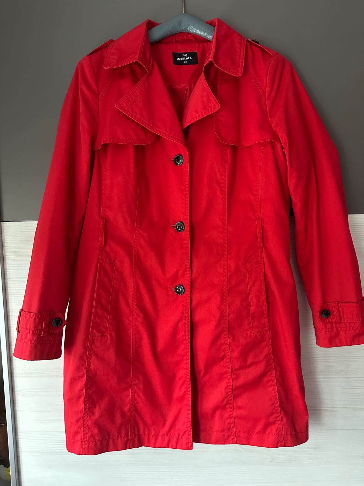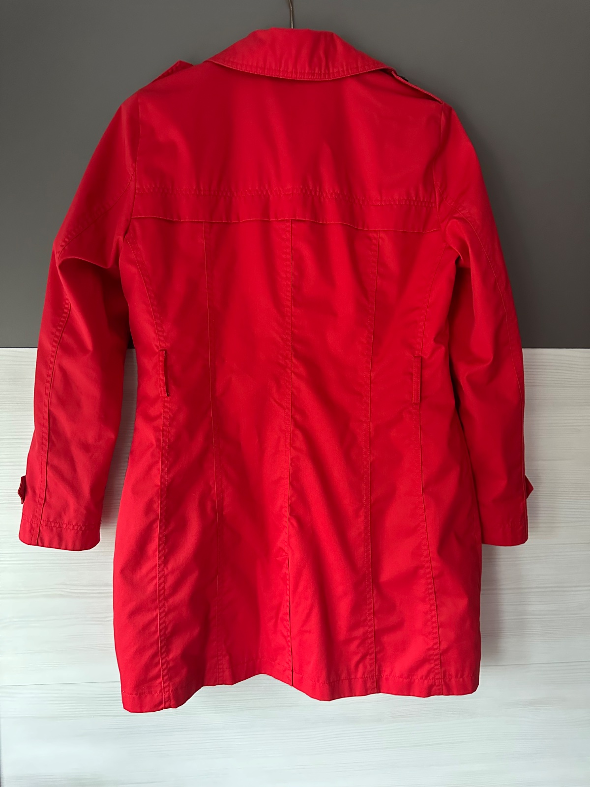 Ponúkam na predaj červený trenčkot, je výrazný, veľ. 42.