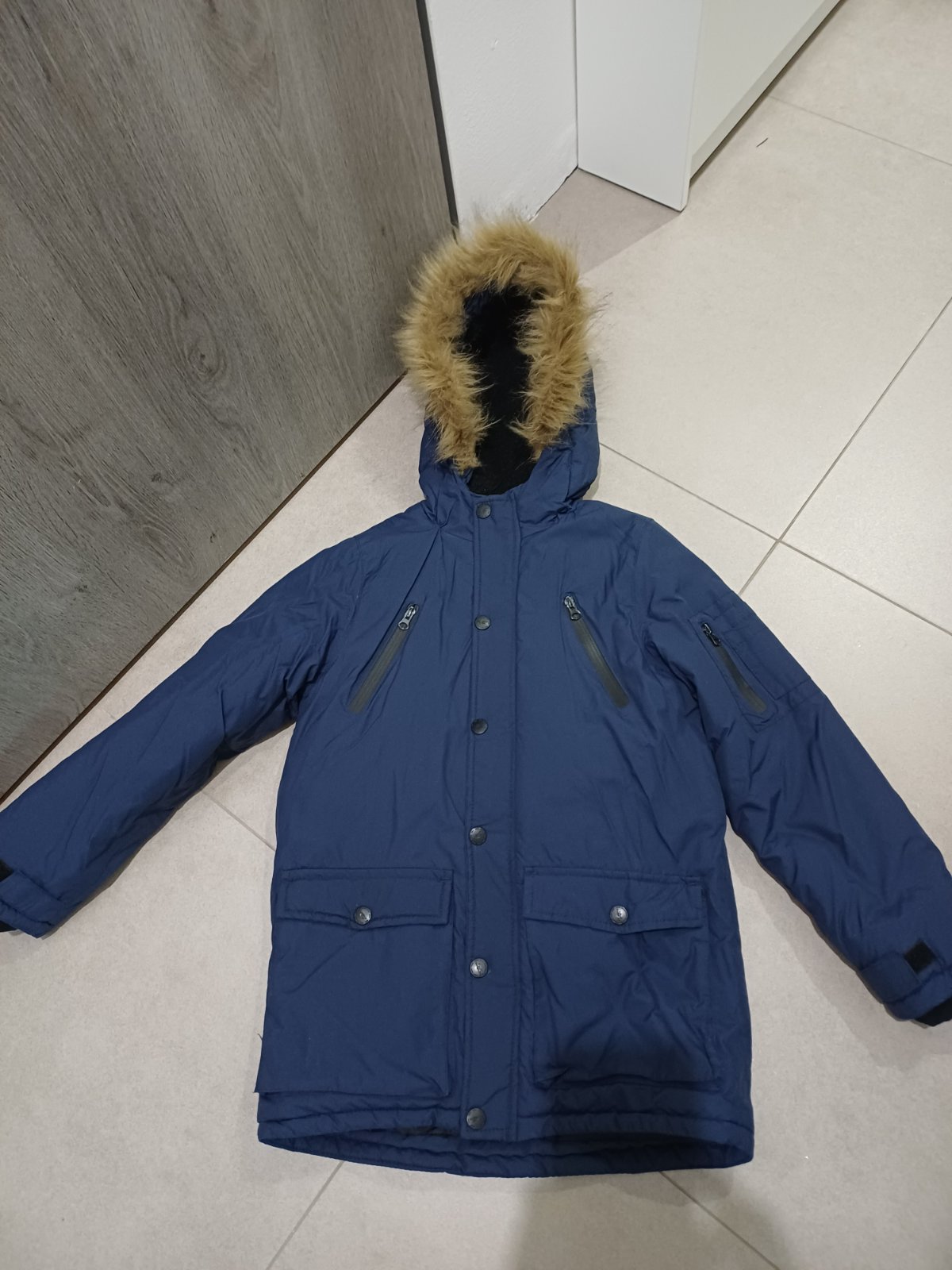 prekrytý ochranou s patentnými gombíkmi, na kapucni je odopínateľná kožušinka, má vonkajšie a vnútorné vrecká, vnútro na trupe a kapucni zateplené kožušinkou, na chrbte reflexný prvok. Uvedená veľkosť 146. Rozmery: dĺžka 65,5cm vpredu, 68cm vzadu, šírka pod pazuchami 47cm, rukáv od kapucne 62,5cm + 2cm patent. Pekná sýta farba - nedarilo sa mi to pekne odfotiť, asi najautentickejšia na fotke rukáva. Na vnútornej kožušinke sú jemné žmolky a na boku pod pazuchou je kožušinka trochu vyšúchaná - nie je tam diera, len je to vizuálne svetlejšie (nachádza sa to zvnútra, na málo viditeľnom mieste, pri bežnom nosení nie je vidieť - píšem pre korektnosť). Inak je bunda vo veľmi dobrom stave.