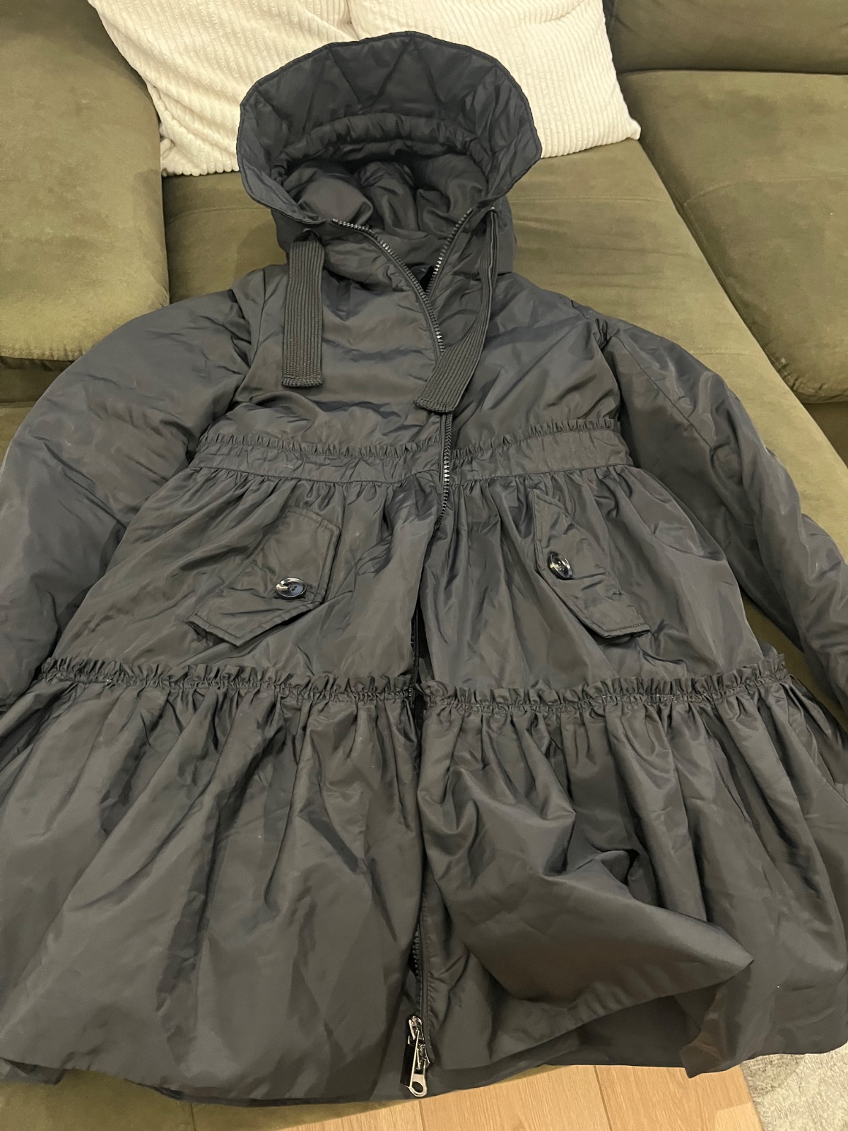 Nosena ale vo vybornom stave. Velkost M. Paperova. Odopinatelna kozusinka. Vrecka vpredu, zapinanie zhora, ale daju sa dat ruky do vrecka aj zboku. PC150 libier. Cena plus postovne