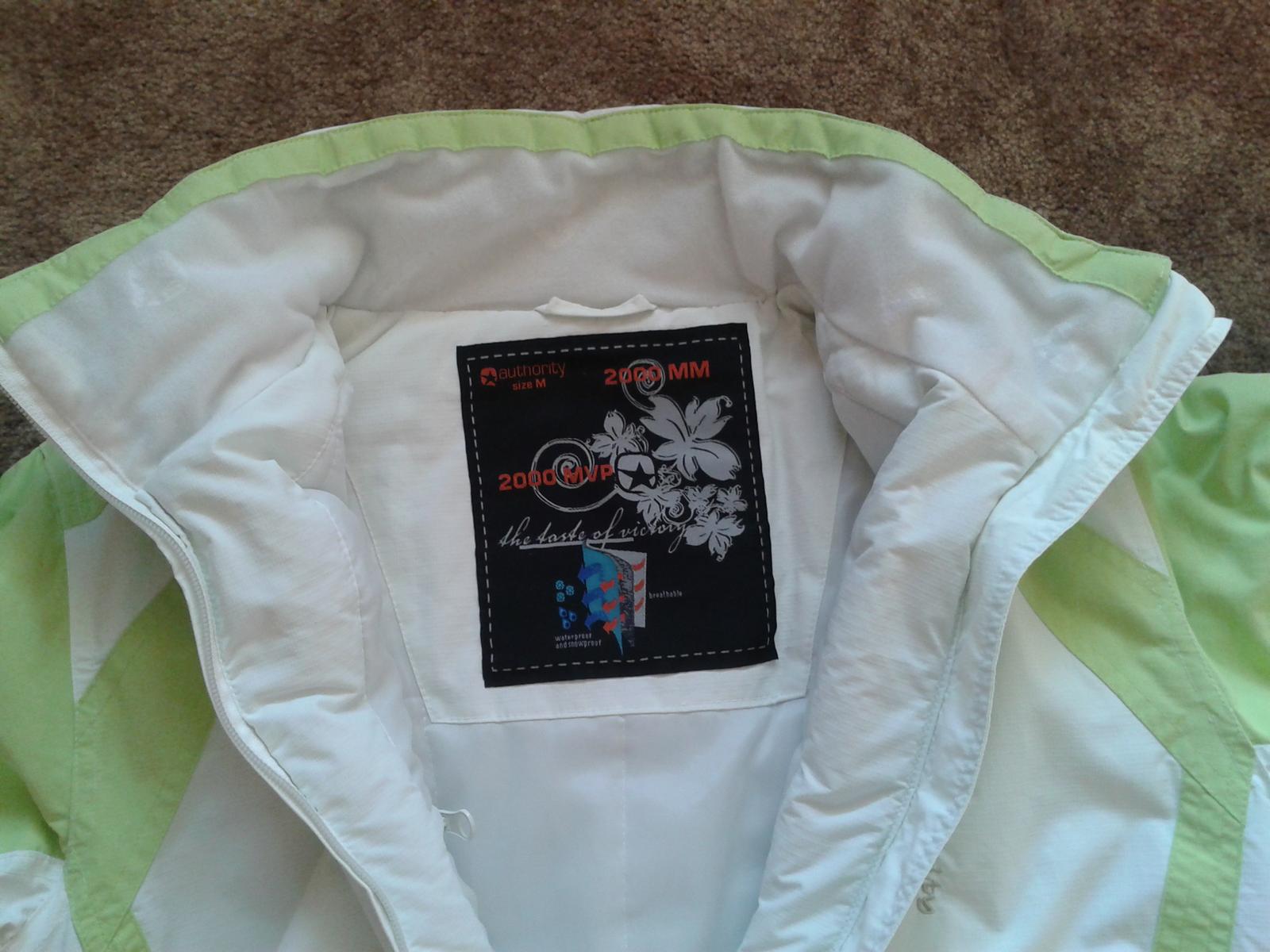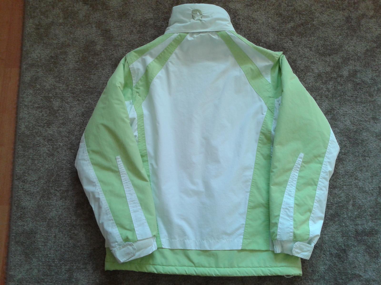 Bielo- zelená, 2x nosená, žiaľ chýba snežný pás, inak bezchybná. Pevný nepremokavý materiál, skrytá kapucňa, pod pazuchami zazipsované prieduchy proti zapoteniu. Miery: rukáv od krku77, š. v páse 52, š. pod pazuchou a dolu 56, d. 69 cm. Teda mierne tvarovaná. Lyžiarske rukavice ako darček.