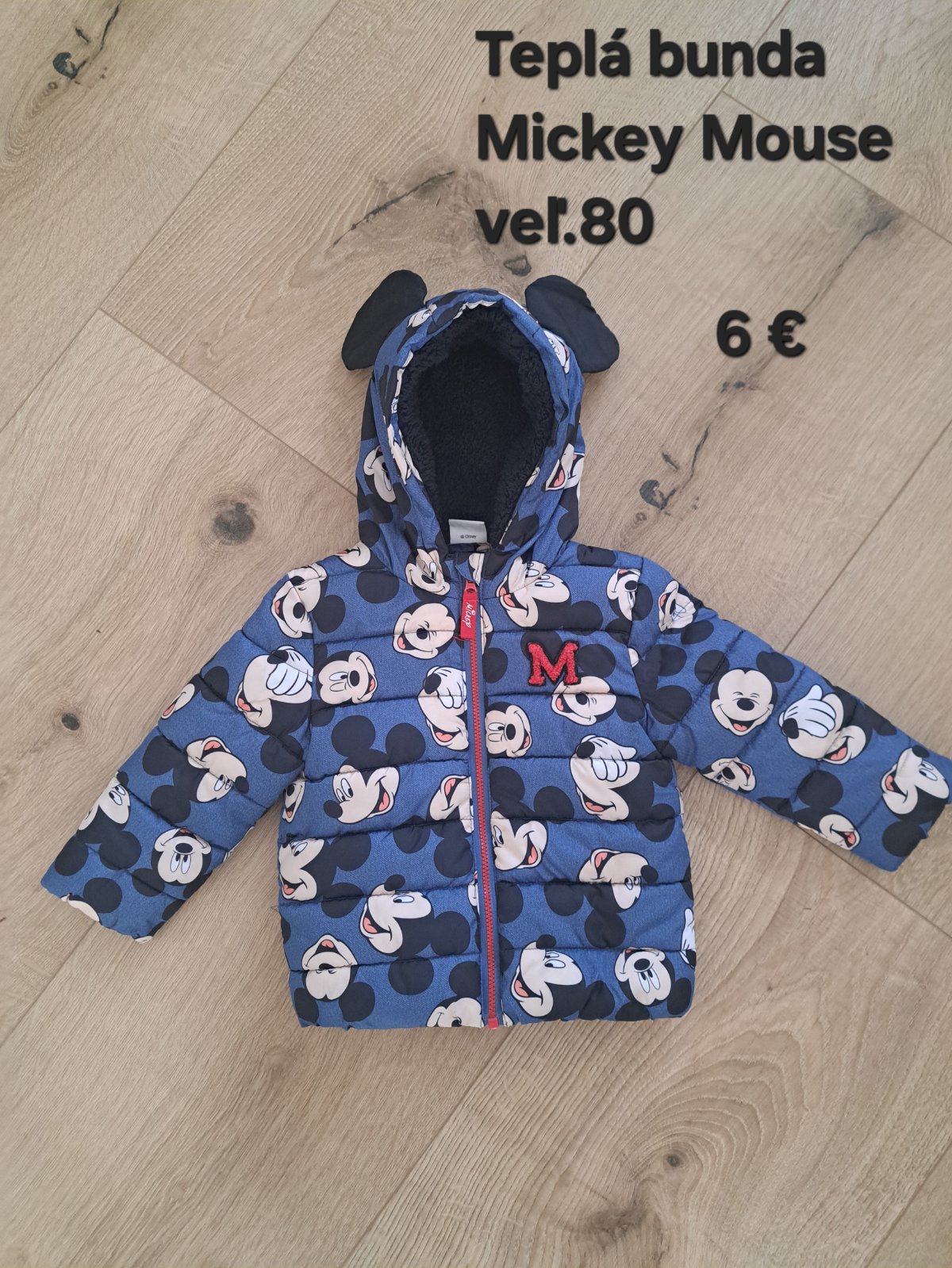 Teplá bundička Mickey Mouse, veľkosť 80 ( môže sa nosiť už aj pri veľkosti 74 ), pekný stav, nosená na striedačku s inými.