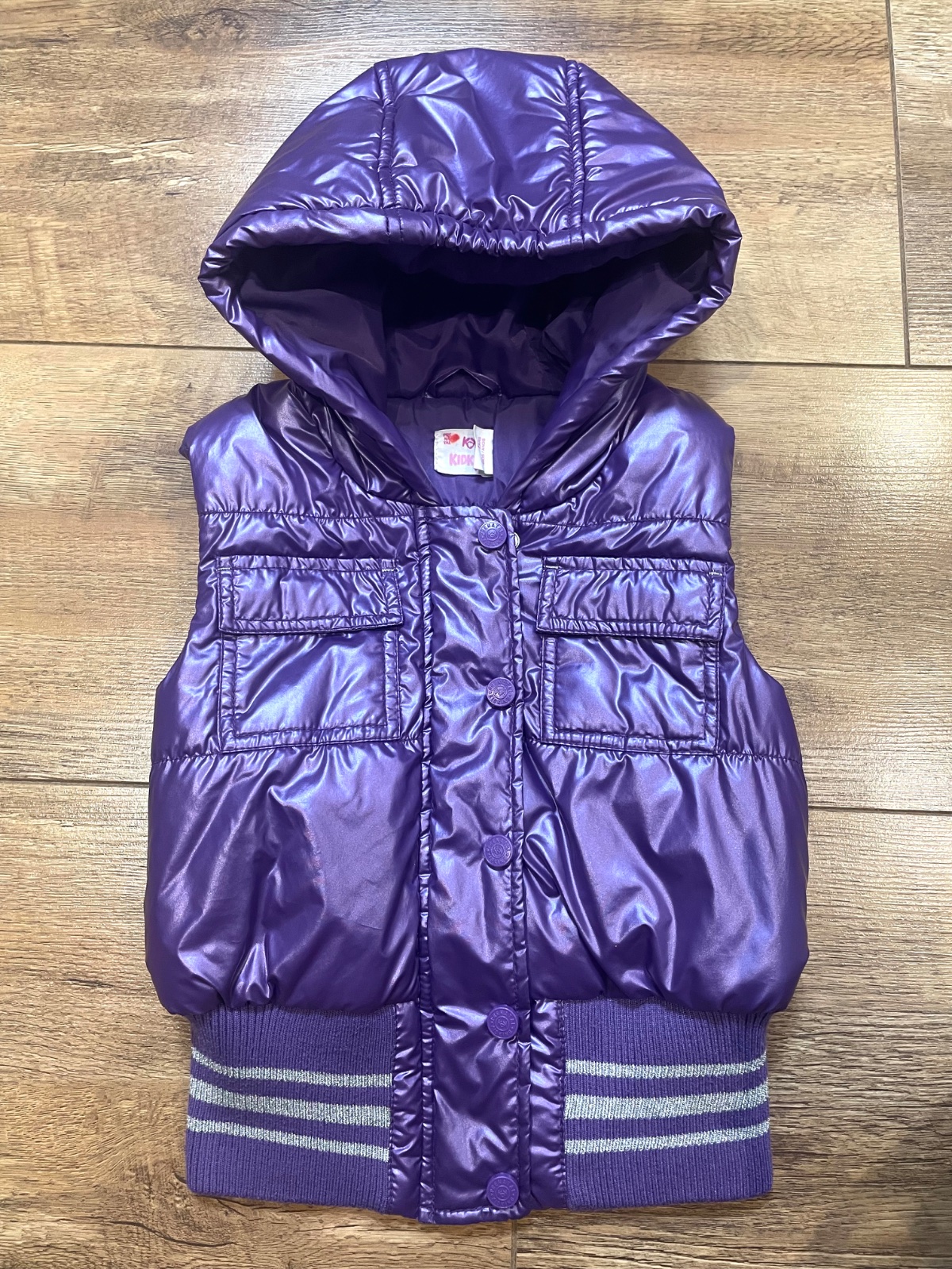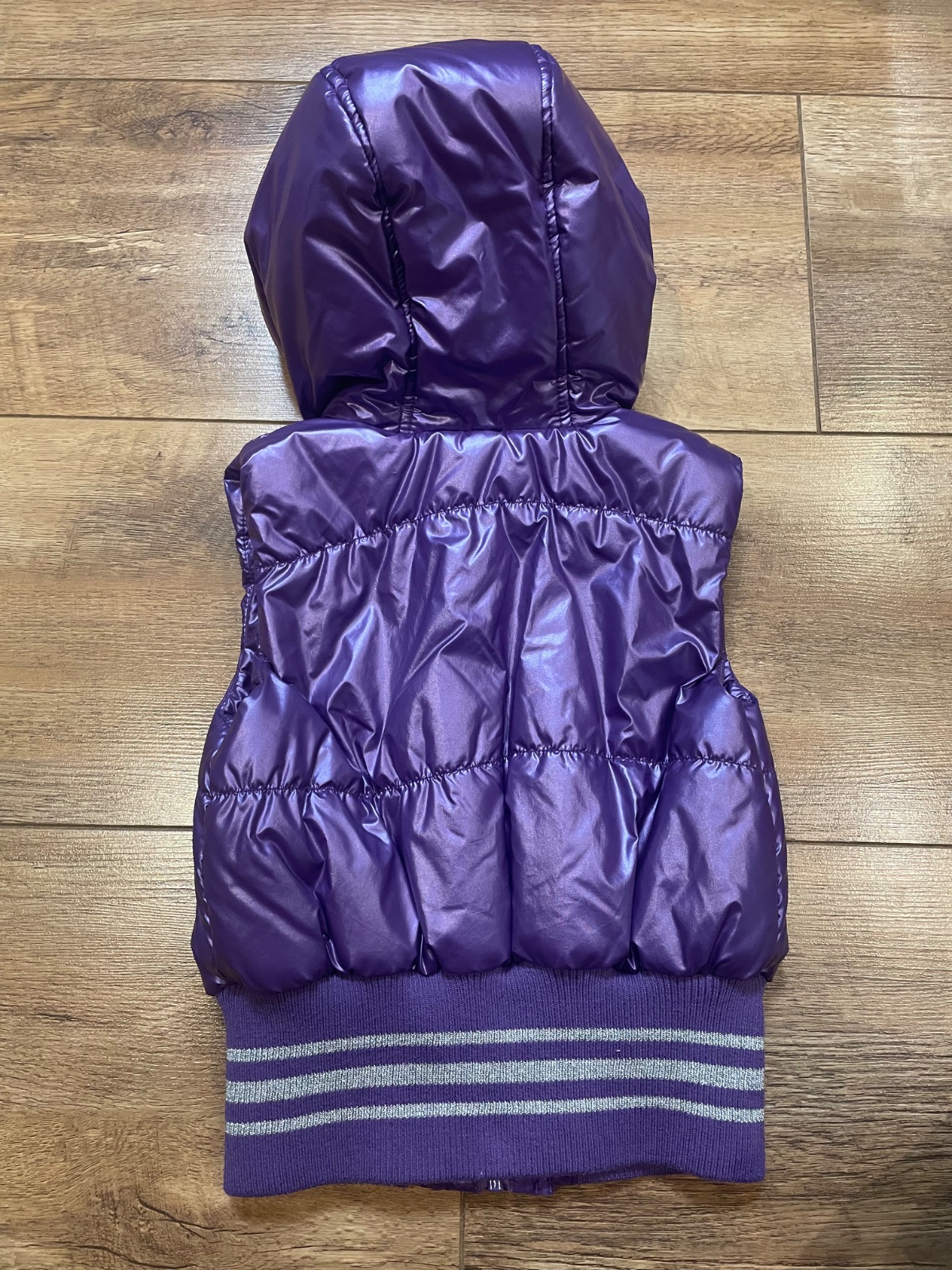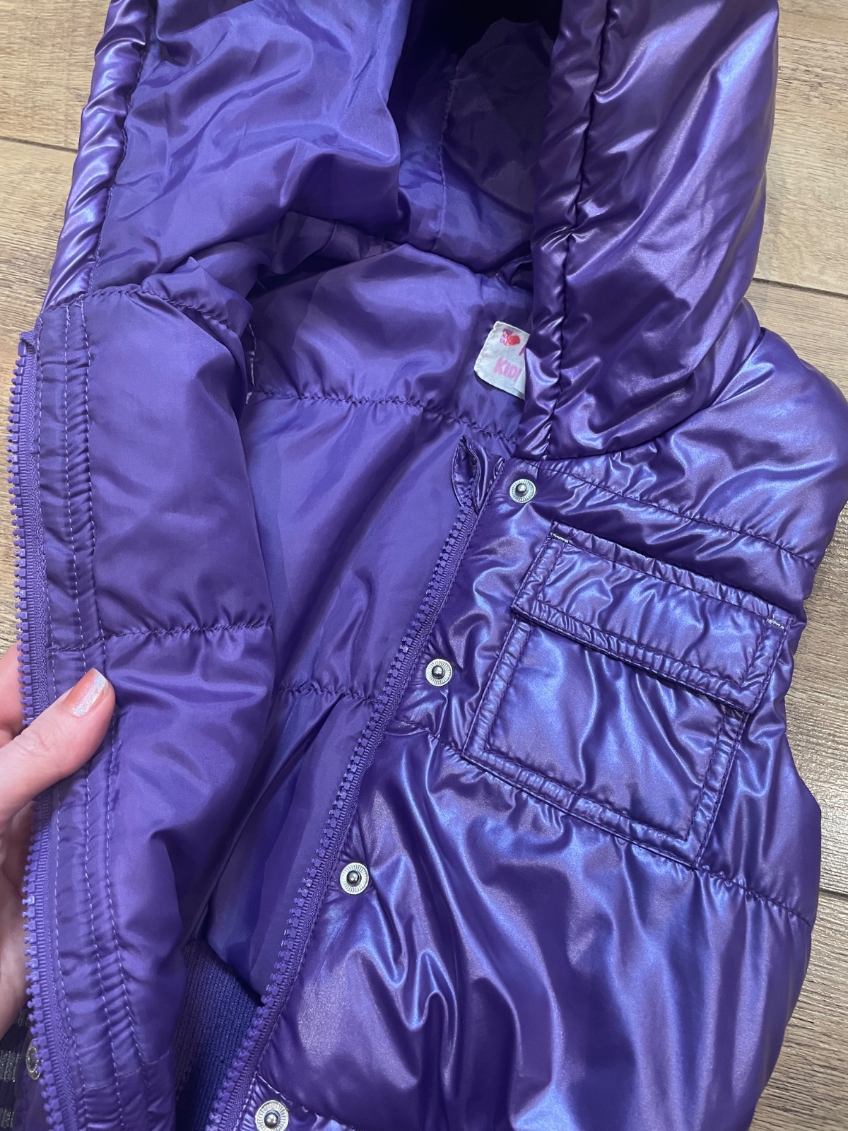Lesklá fialová bundička pre malú štýlovú slečnu. Málo nosená, ako nová. Na vnútornom štítku je zaznačená bodka. Zakúpená v Taliansku, veľkosť 107/113cm.