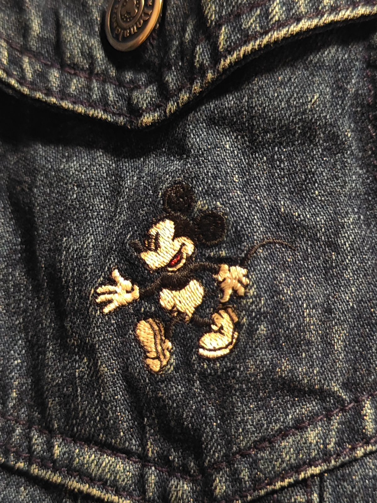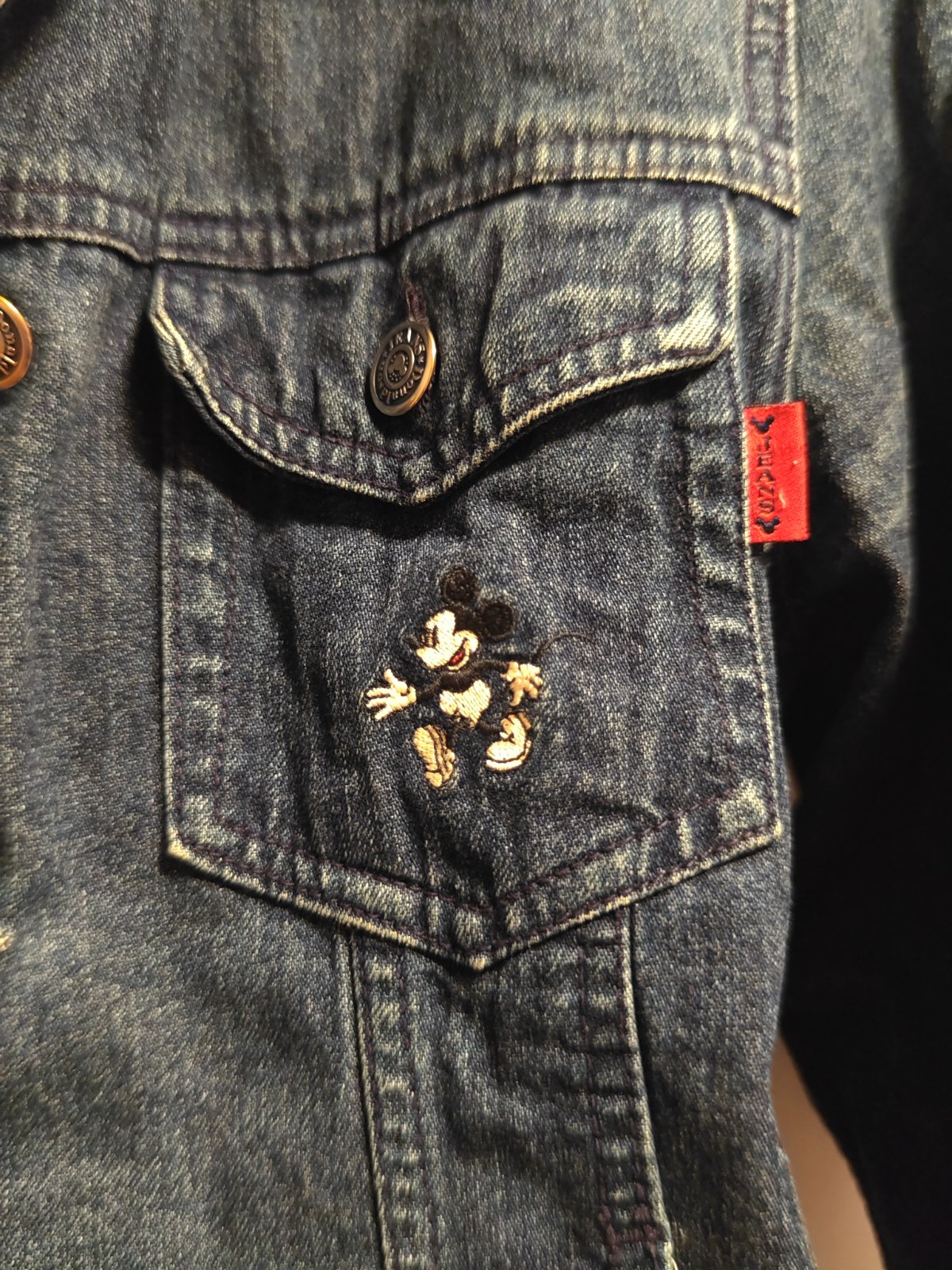 Original donaldson štýlová moderná a trendy rifľová bunda, 2 náprsné vrecká, na jednom z nich vyšívaný mickej detailne vypracovaná kvalitná mäkučká dovezená z USA, veľkosť M