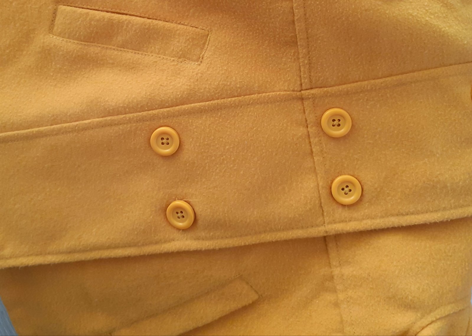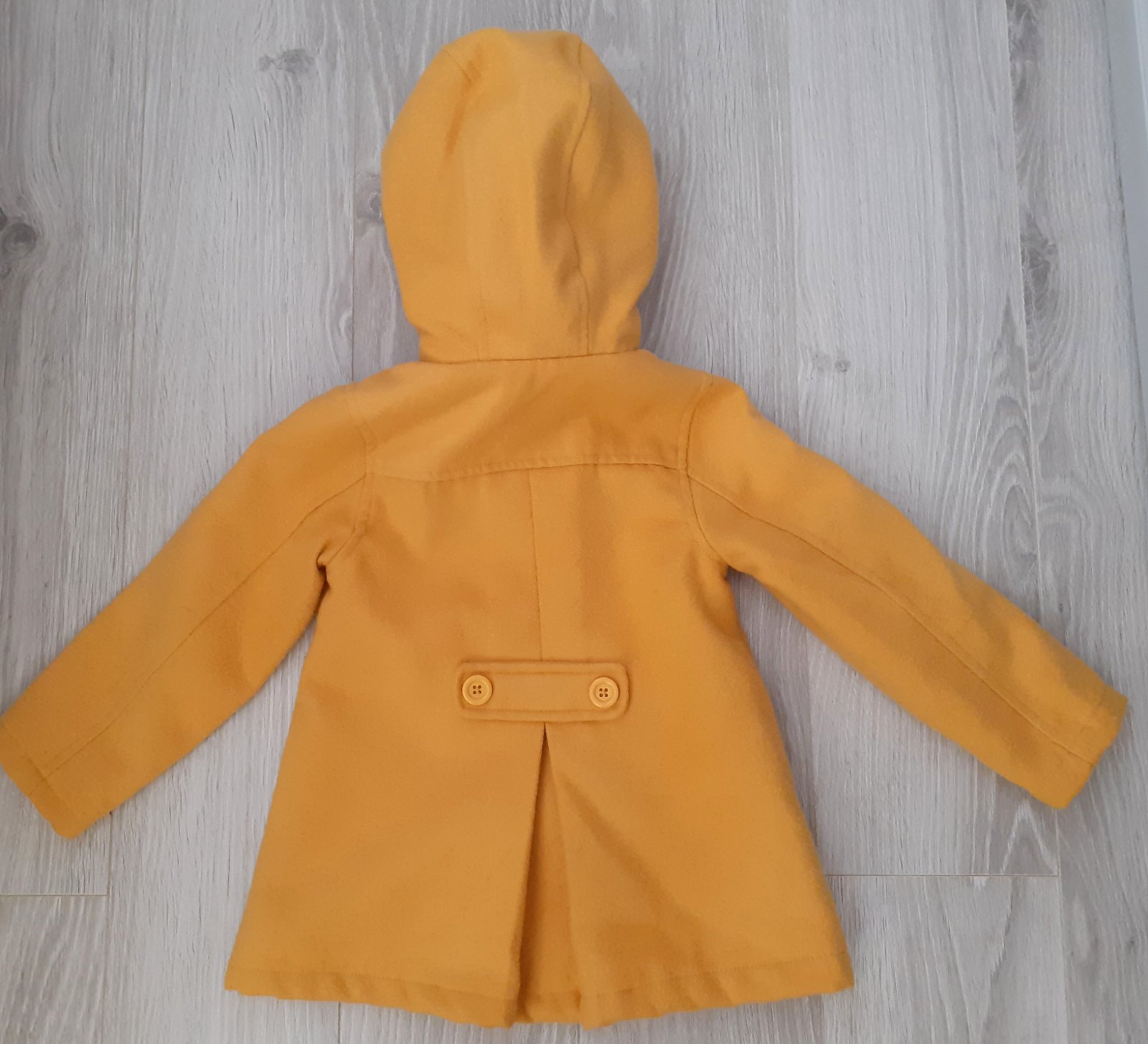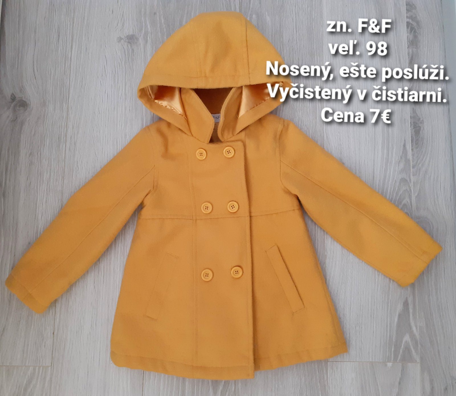 Horčicový kabátik zn. F&F, veľ. 98. Nosený, ale ešte poslúži. Vyčistený v čistiarni. Zvnútra na podšívke sem-tam zatiahnutá niť (viď. foto).