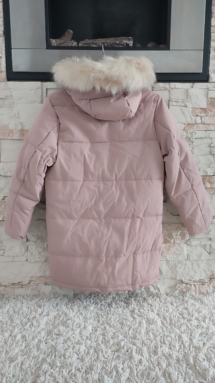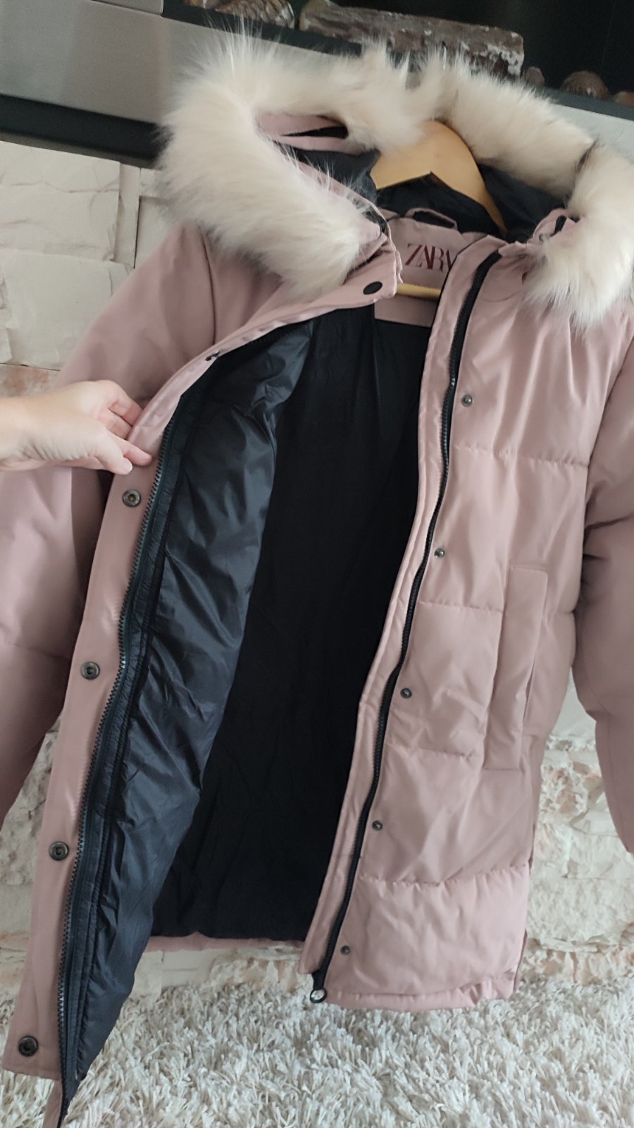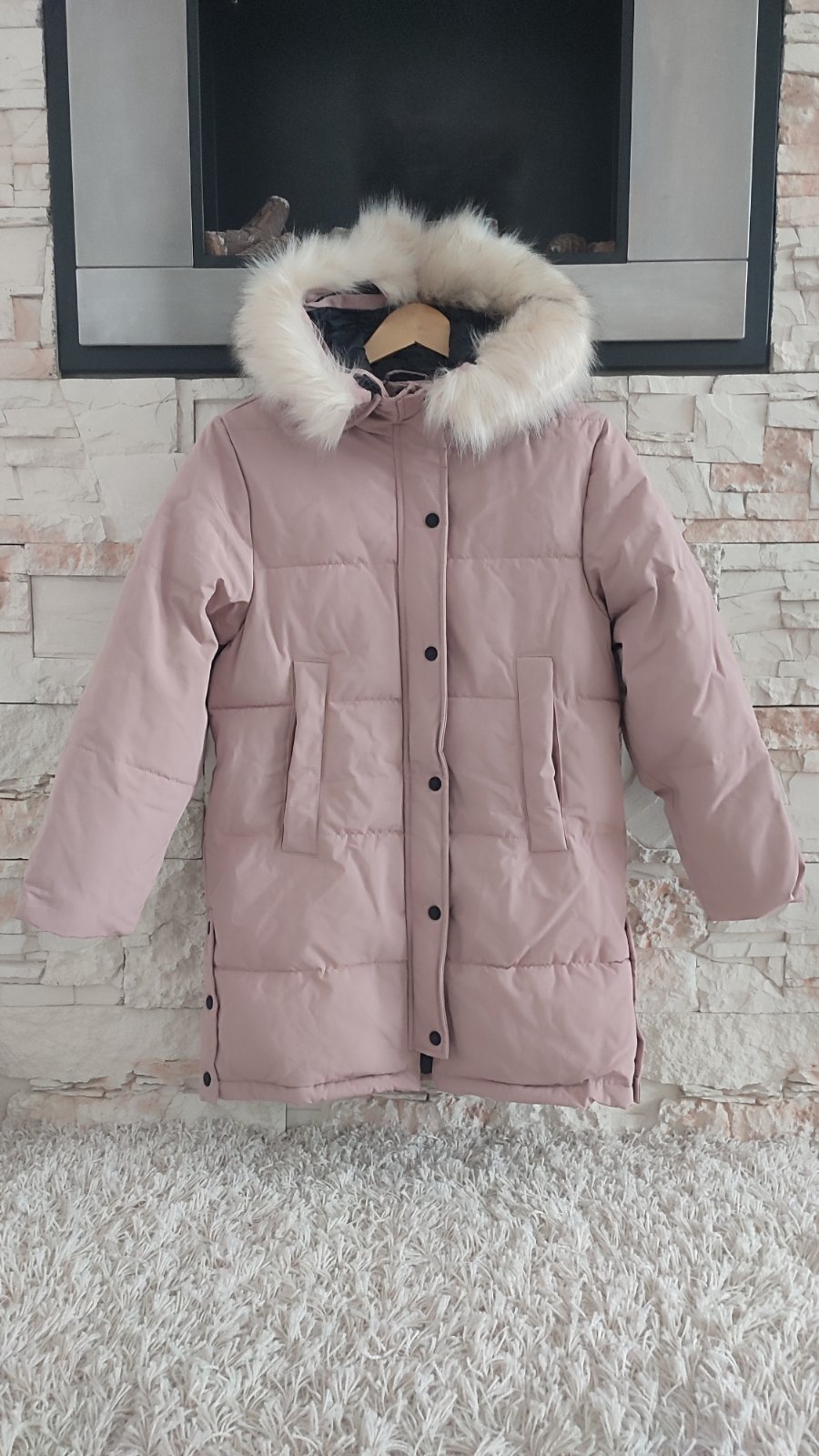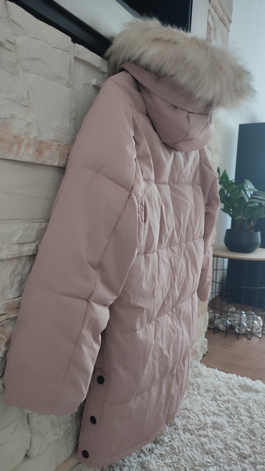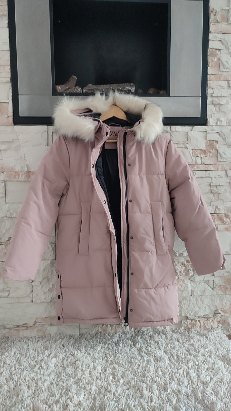 Ponukam presivanu , predlzenu, ciernu , púdrovo- ruzovu bundu. Vpredu na kazdej strane vrecko, zapínanie na zips + nity, po bokoch sa dá bunda rozopnúť, pre viac pohybu.Na lavom rukave tiez funkcne vrecko . Kapucka je napevno, kožušina hustá ,nadychana .