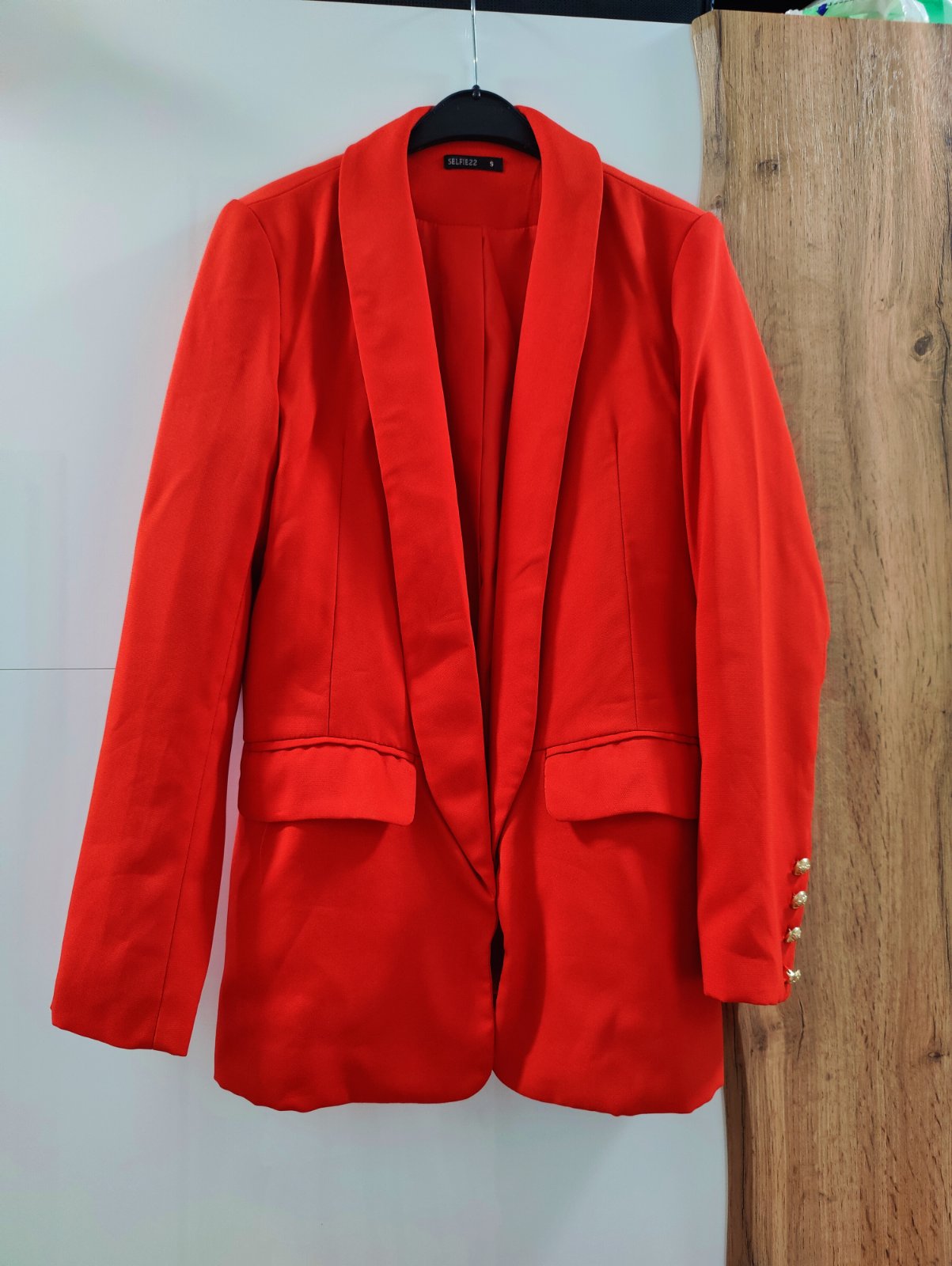 krásny jarník jasnej červenej farby s lesklými gombíkmi málo nosený veľ.XS-S