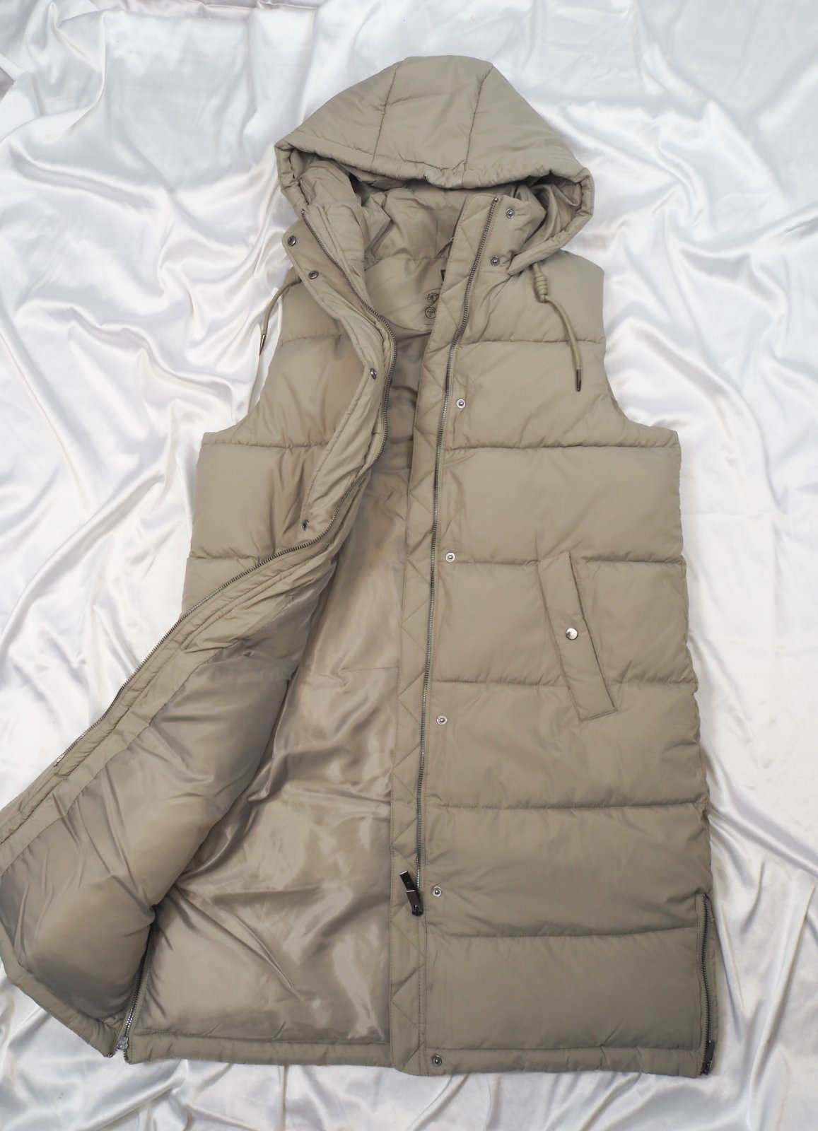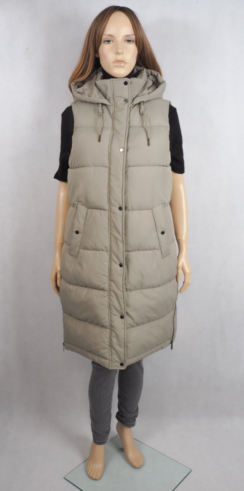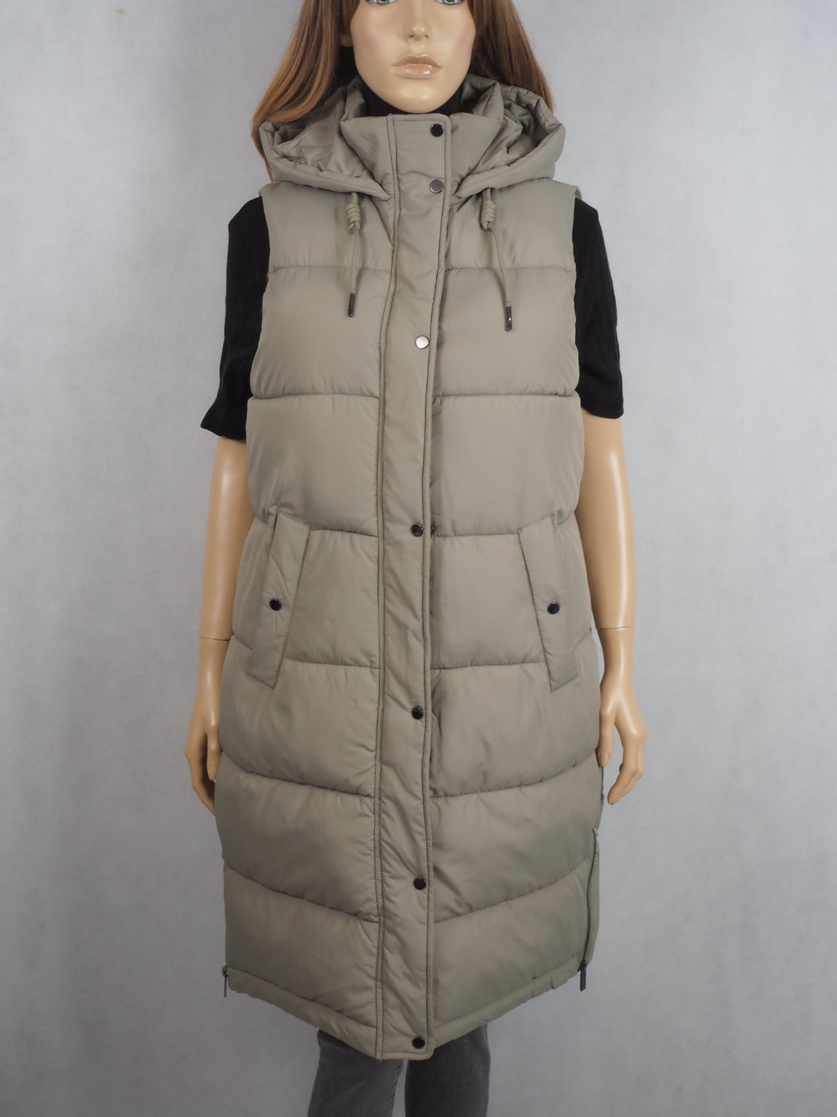 Kvalitná zimná vesta, zapínanie na zips a légu s cvočkami, vpredu vrecká, bočné zipsy, nová s visačkou....farba bledozelená, ako originálna fotka trička.