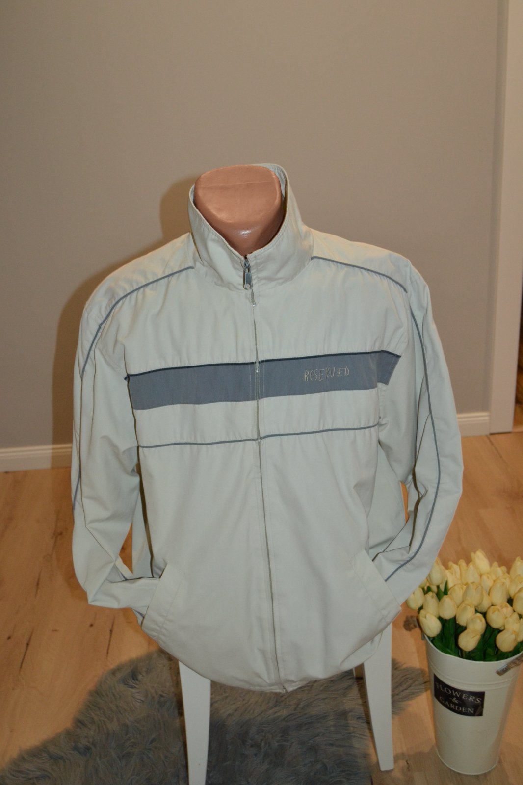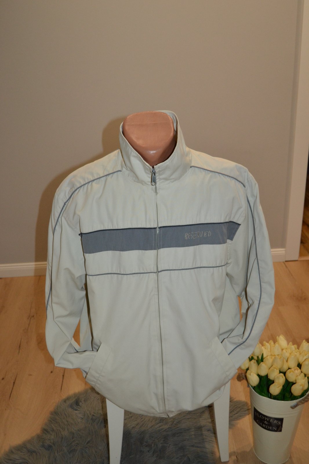 Pánska sivá bunda, veľkosť XL, zn. Reserved, zapínanie na zips, má vnútorný vačok, obvod cez hrudník 128 cm, rukávy 60 cm, dĺžka bundy 76 cm.