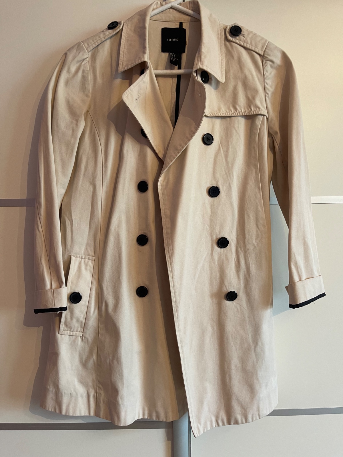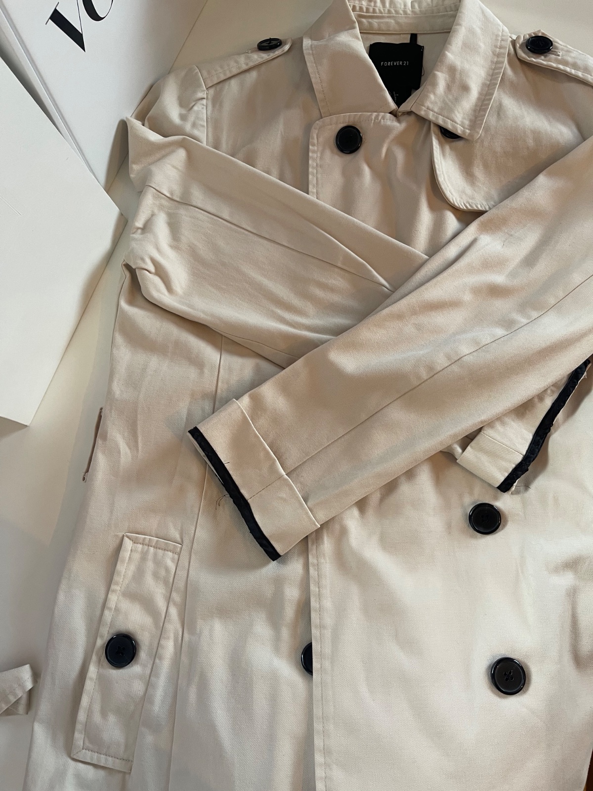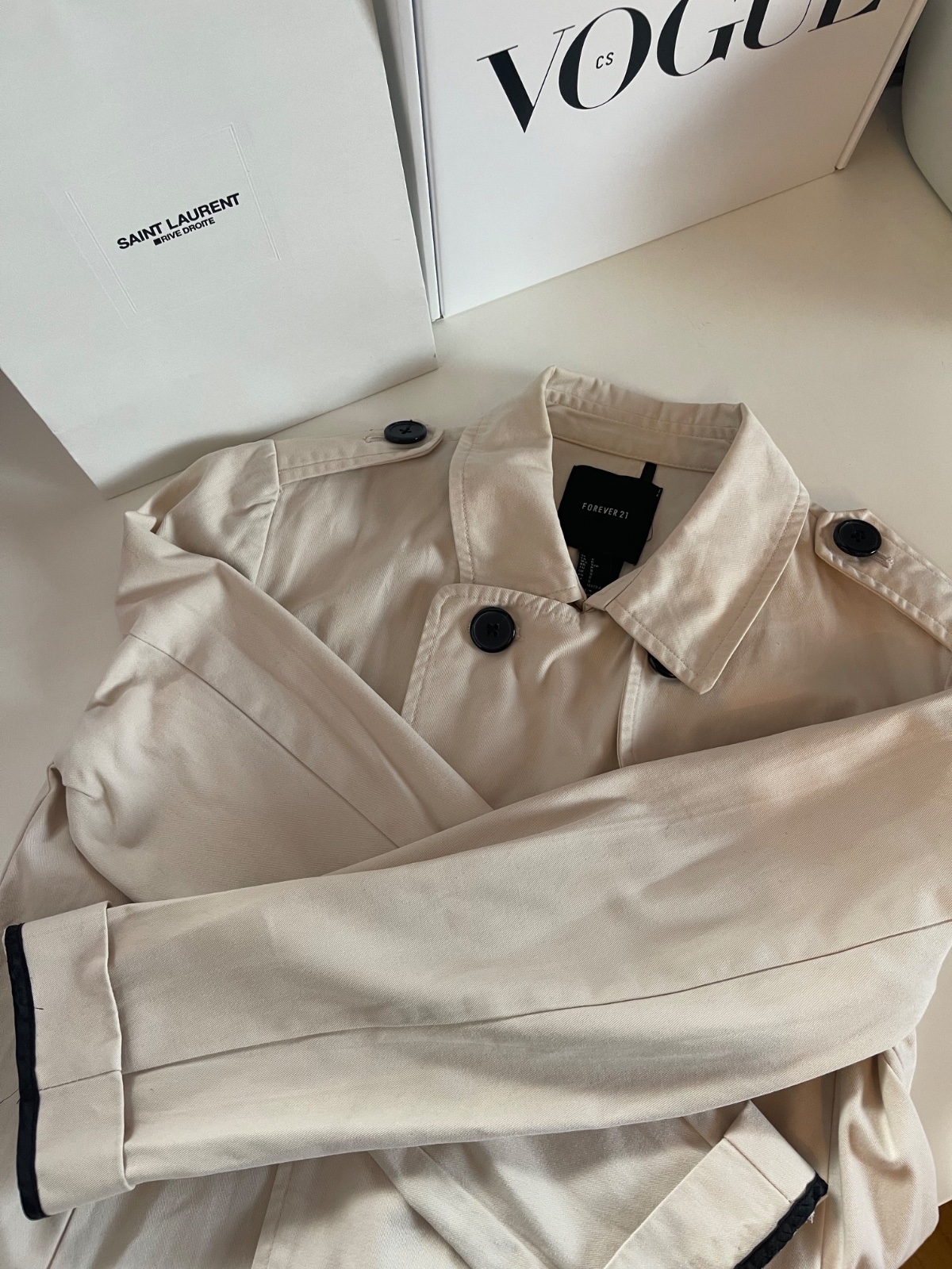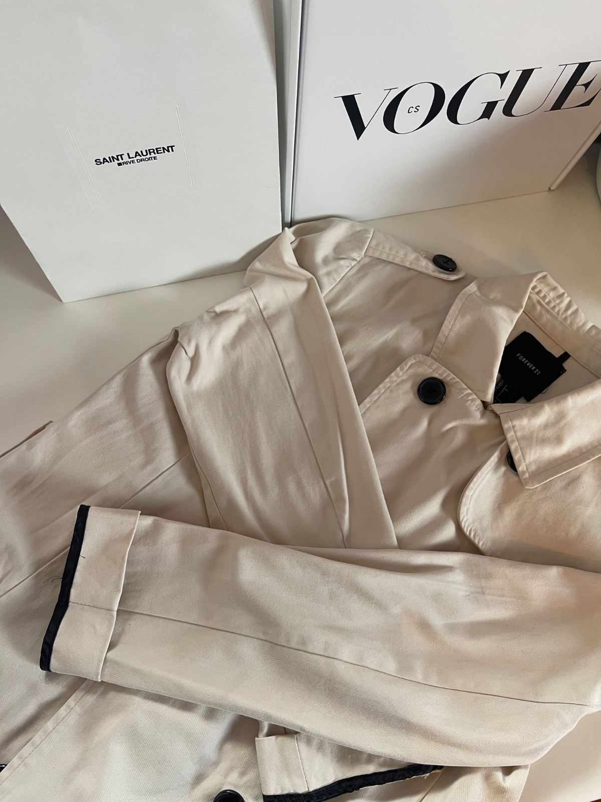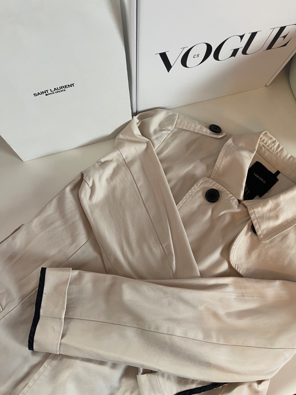 Dlhý béžový trenčkot s opaskom od značky Zara. Ide o ľahký prechodný model s klasickými prvkami, ako sú široké klopy a viazanie v páse Ideálny na vrstvenie. Veľkosť XS/S. Dĺžka 113 cm a prsia 56 cm.