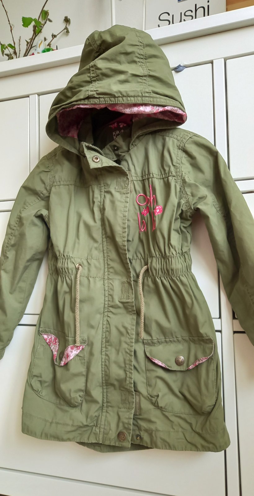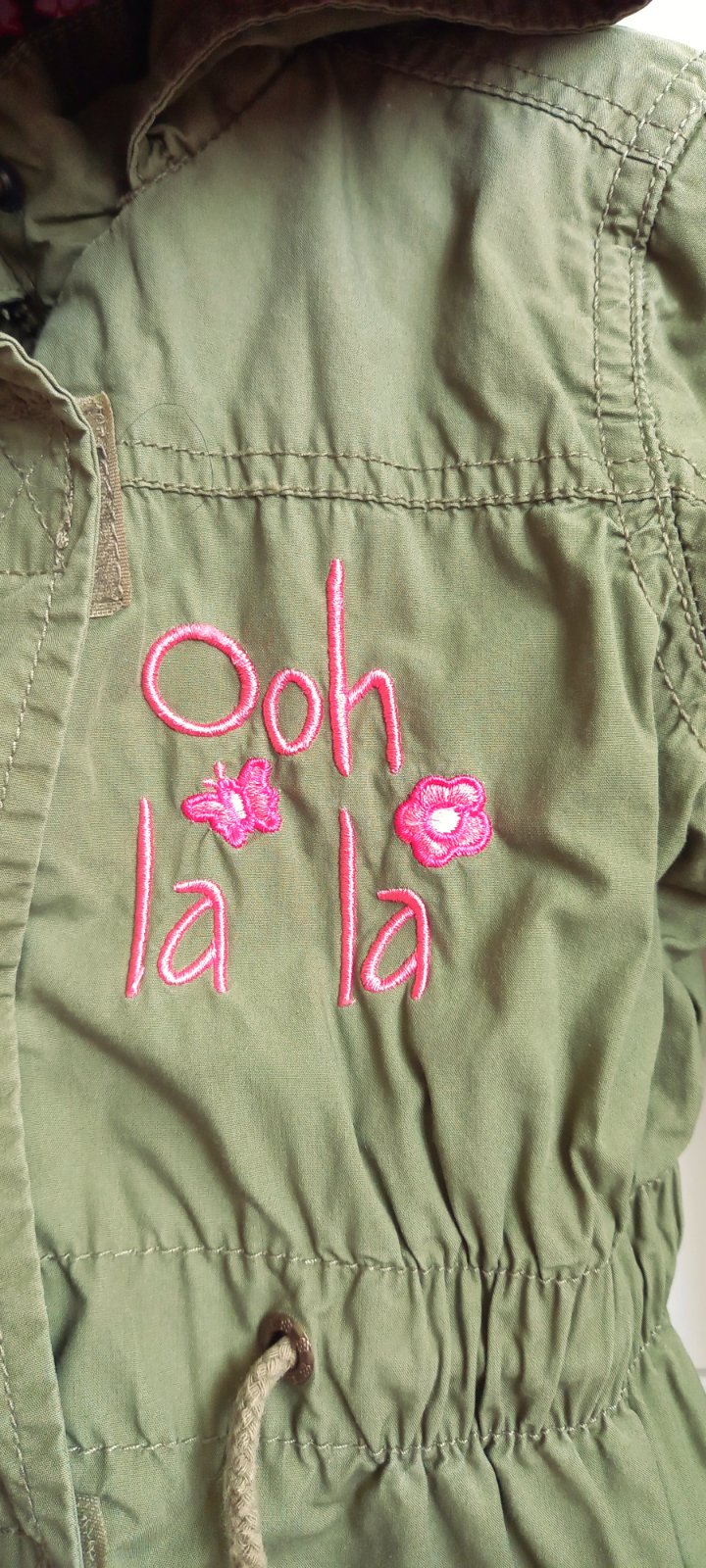 Skoro nenosená, tenšia bavlnená parka. Nariasená v páse. Olivová zelená kombinovaná s ružovou výšivkou a kvetovanou podšívkou na detailoch. Podšité celé aj rukávy.