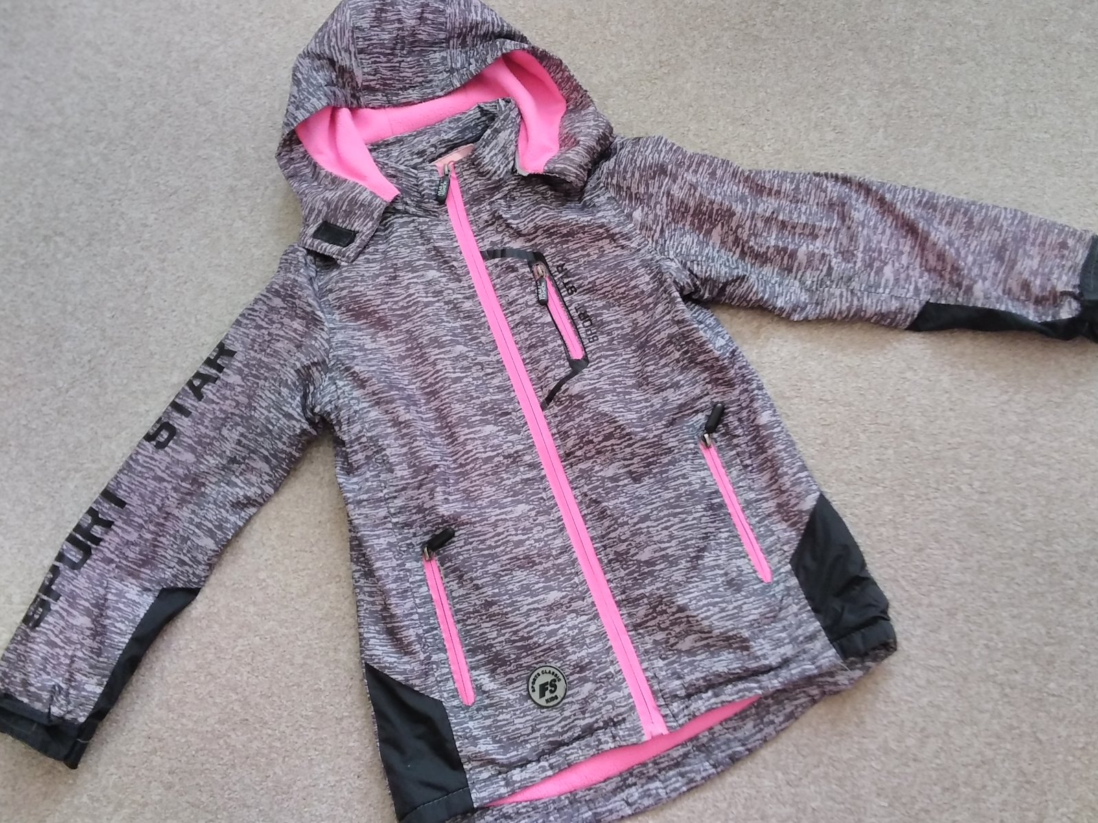 Sofhshelova bunda, hrzbsia, zateplena zvnutra flisovou podsivkou a je aj vyplnena teplou vložkou. Sirka 42, dlžka 61, rukav do krku 66cm. Odpadol hacik zipsu a je potrebne si ho vymenit ,na predno...