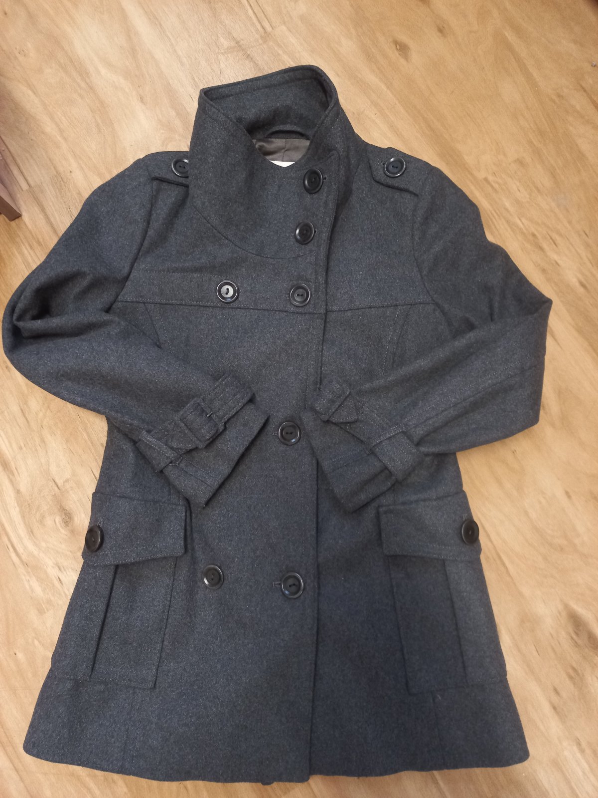 Dámsky kabátik s velkými vreckami. Vysoký golier. Dĺžka 80 cm, šírka prsia 52 cm, cez pás 46 cm. Treba sa zmerať. Aj pre M možno sedí . Kto ako má rád, či volnejšie, či obtiahnutejsie. . Materiál je ako na zimné kabáty, no nie hrubý na tuhú zimu. ZN: KACKPOT
