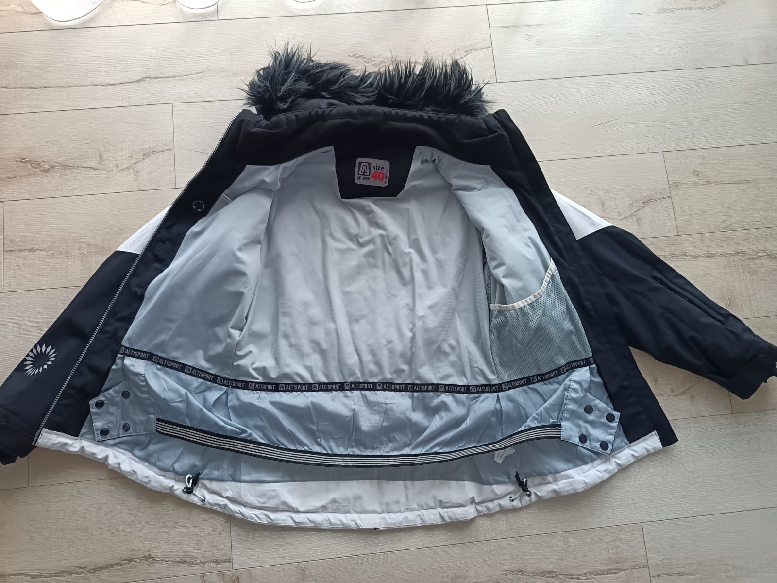 Čierno biela lyžiarska, zimná bunda, zn. Altisport, technológia Spartex 10 0000 TX Strech, nepremokavá, kapucňa sa dá odzipsovať, tak isto aj kožušina na kapucni je na zips, vo vnútri sieťované vrecko,a vrecko na boku na suchý zips, a tiež pas proti snehu na cviky. Spodná časť a časť okolo krku sa dá stiahnuť v prípade potreby. Pod pazuchami sú tiež zipsy. Časť pod pazuchami je elastická, takže sa pekne prispôsobí postave. Na ľavom rukáve vrecko na zips, na patentoch na rukávoch suchý zips, takže si viete okolo rukavíc utiahnuť podľa potreby. Veľkosť sedí. Bunda bez poškodenia