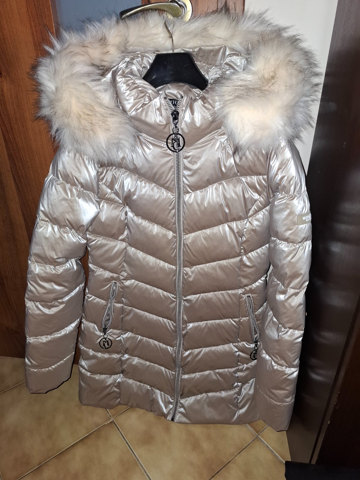 Prekrásna, minimálne vzatá, lesklý materiál, biela veľká(umelá) kožušina, veľkostne M/L.