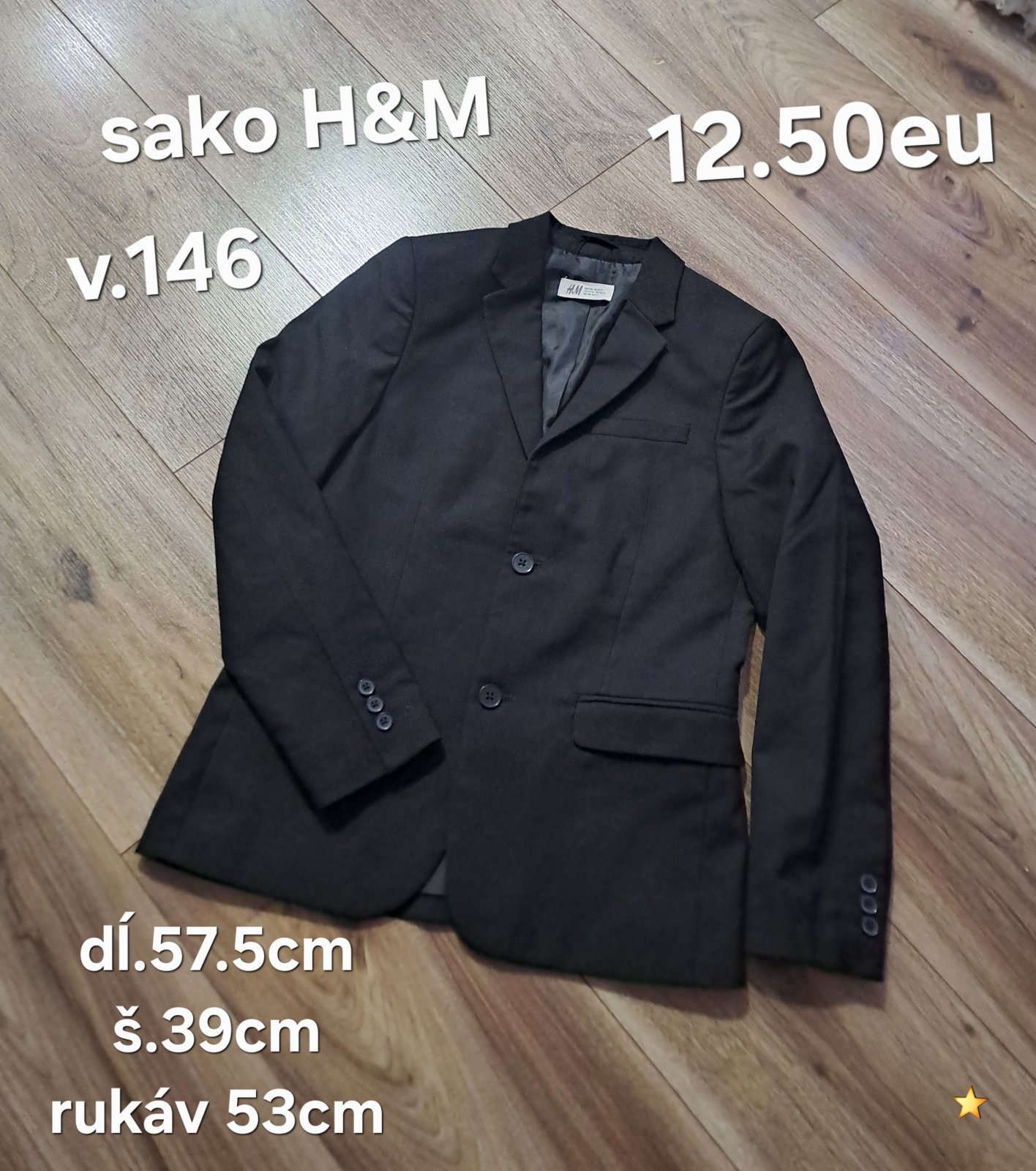 Pekné čierne , jediná chybička gombík na rukáve treba prešit . Dĺžka rukáva od pleca 55 cm. Dĺžka saká 59 cm, šírka 42 cm