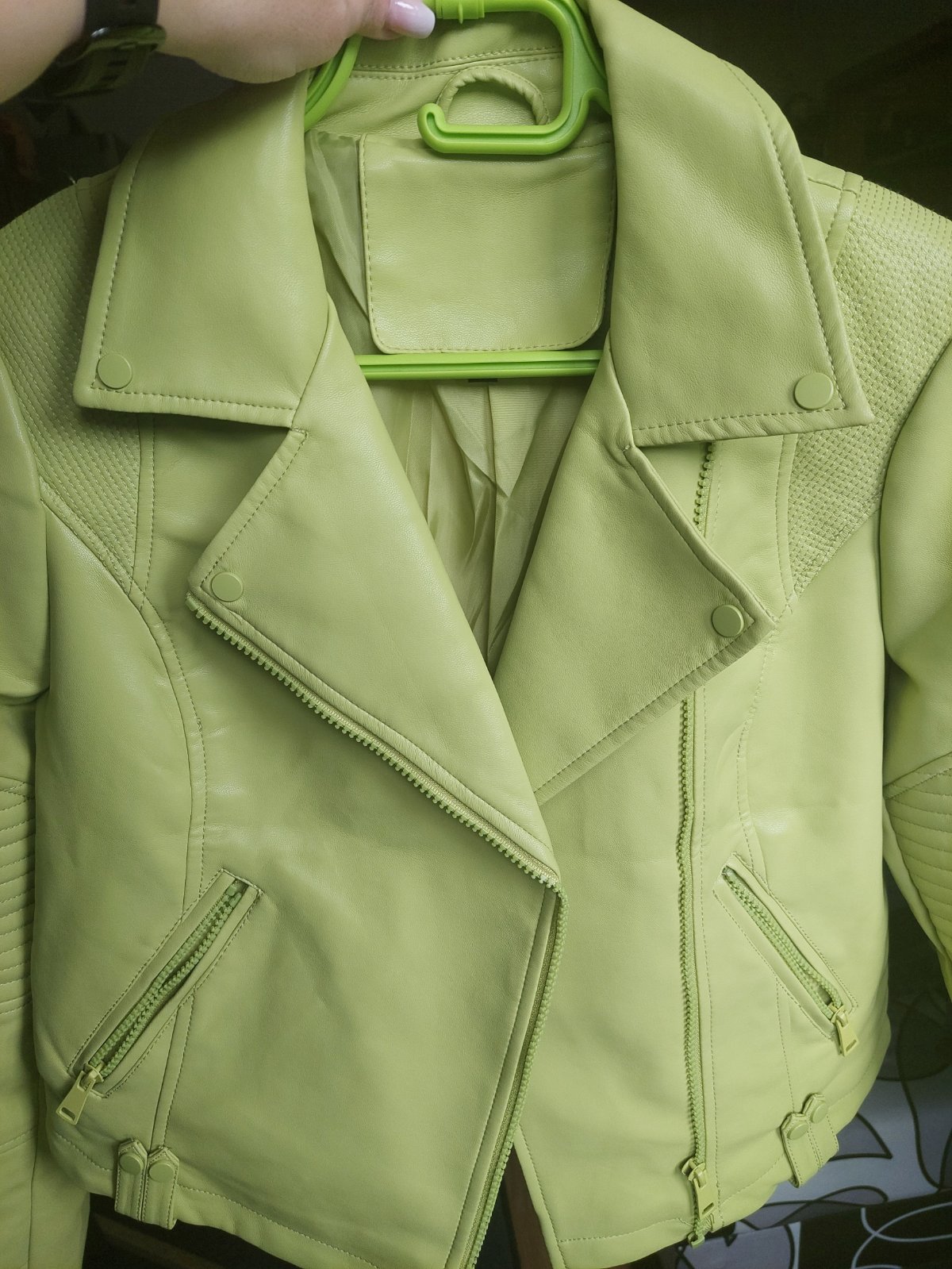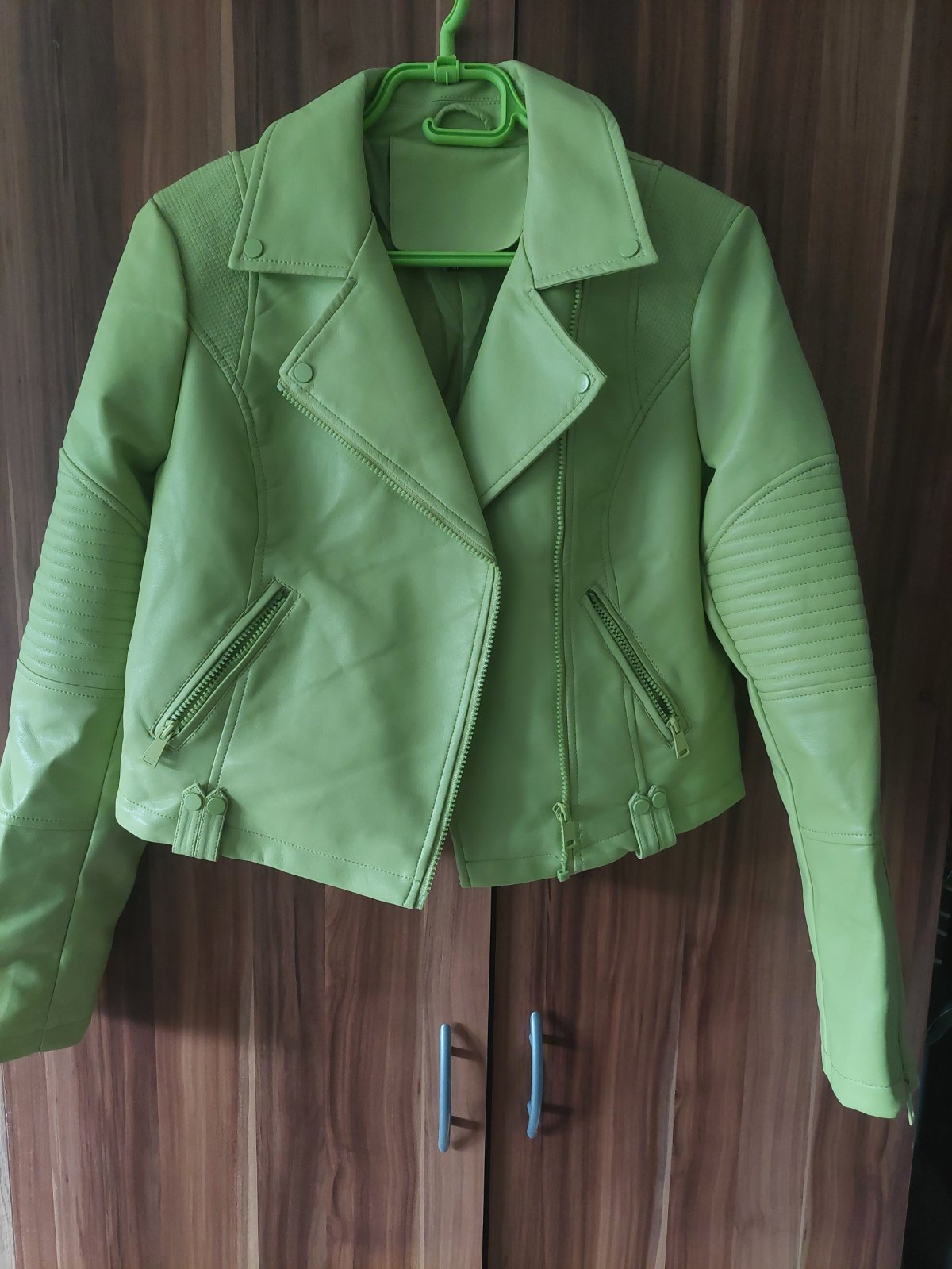Raz oblečená. Mám aj čiernu a tú nosím stále, preto túto posúvam ďalej. Pekná limetkova farba. Nejde ju dobre odfotit. Mäkká koženka. Veľmi príjemná. Cena s poštovným po prevode 15€. PC bola 45€