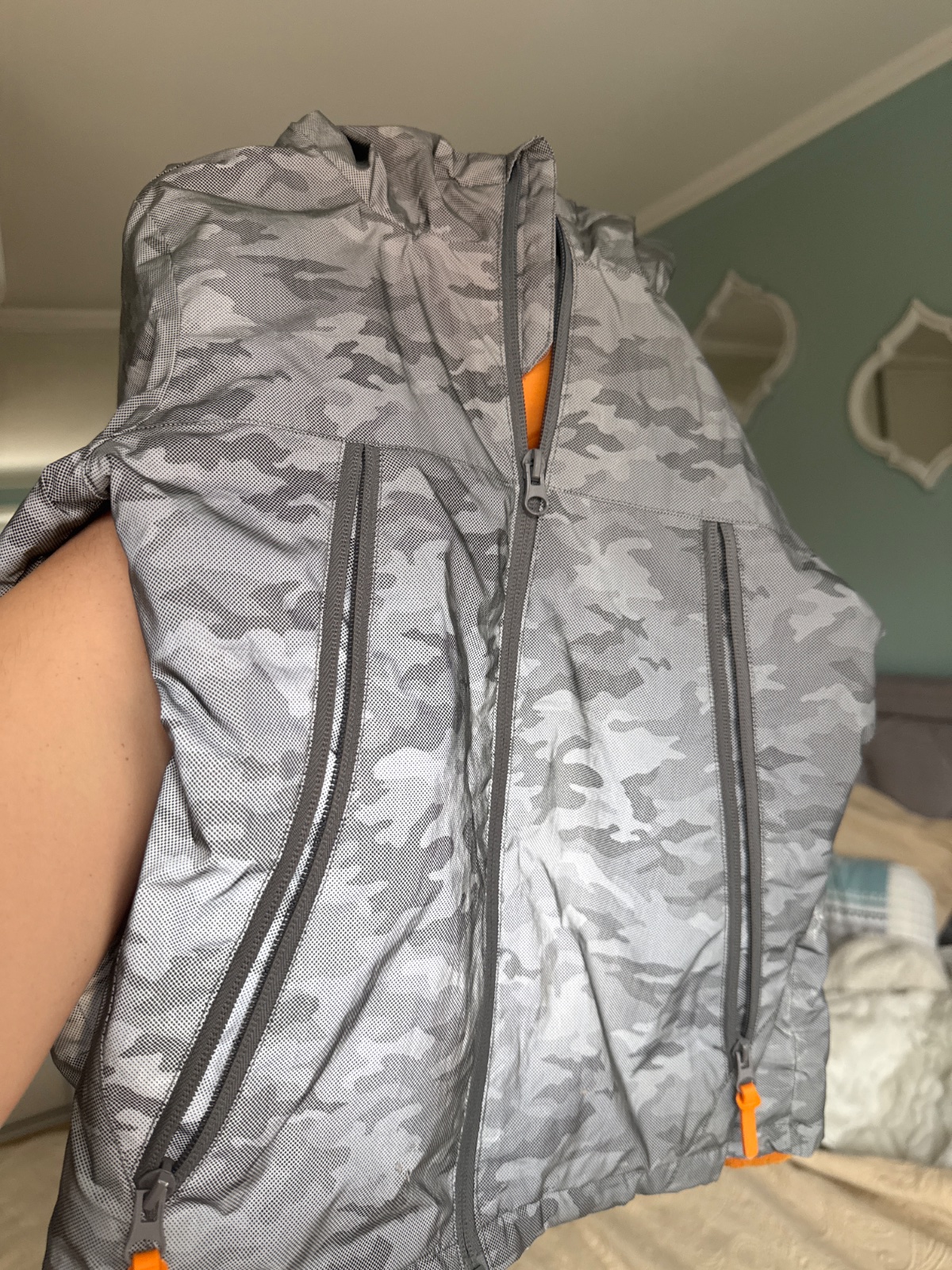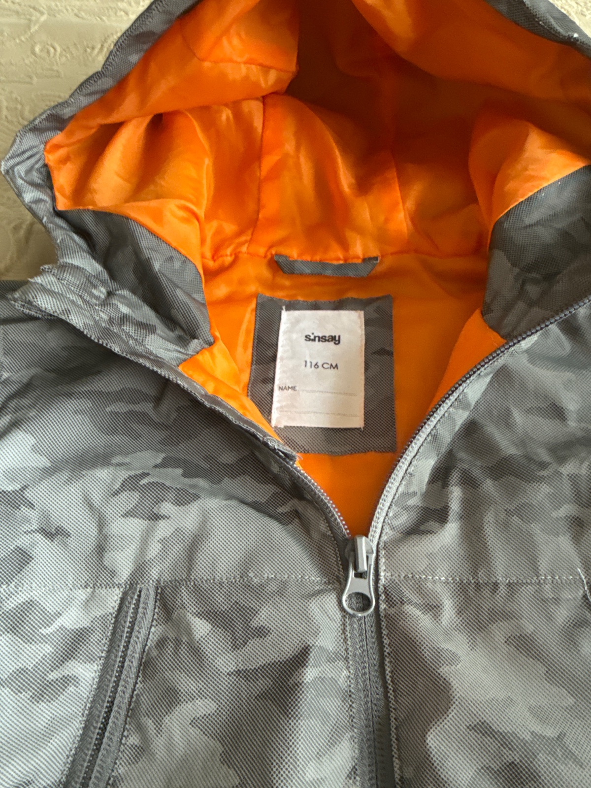 Cela reflexná prechodná bunda. Maskacovy vzor, keď zasvieti slnko je úplne svetlosiva. Syn nosil do veľkosti 122. Nepremokavá. Podsita tensym zateplením, super na jar a jeseň. S kapucňou. Mini ošúchané miesta vid foto premietam do ceny, ale je stále pekná a plne funkčná.