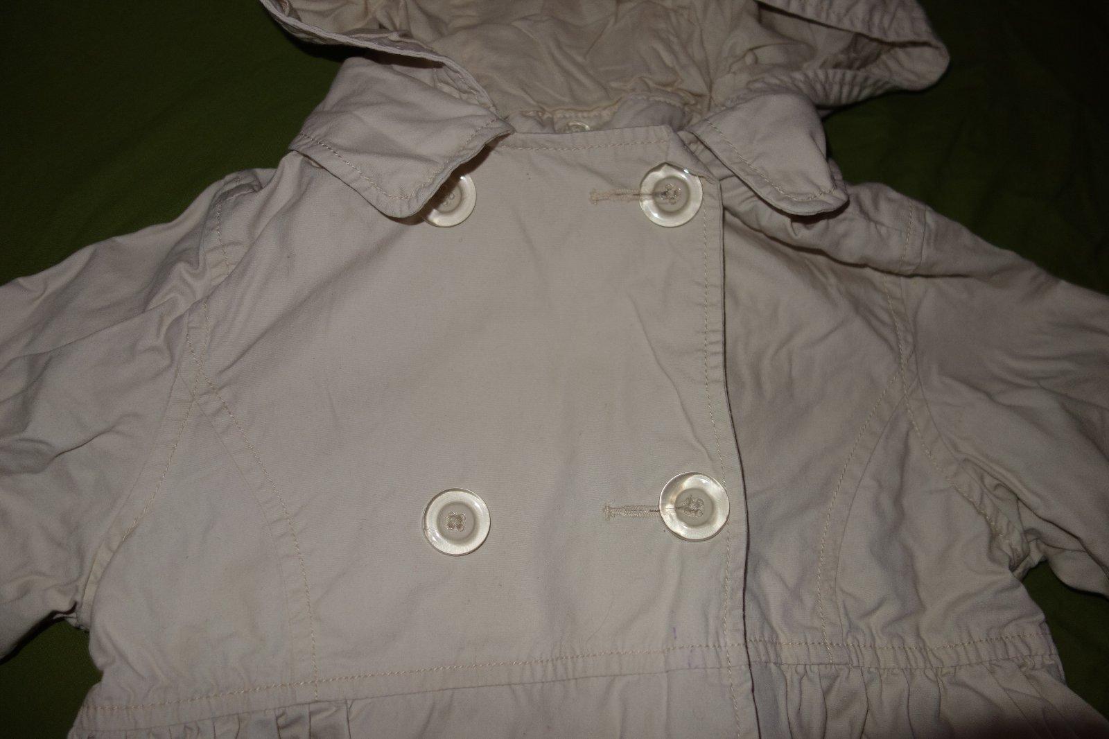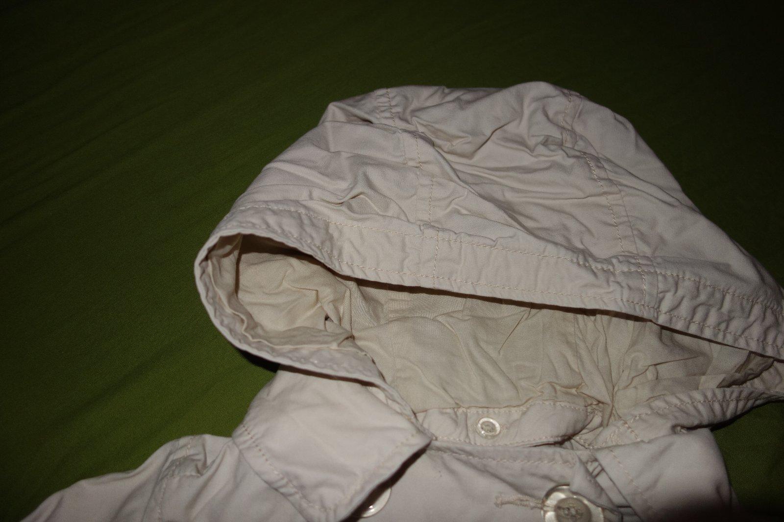Pekna bundicka vo velmi dobrom nosenom stave- avsak ma na sebe par drobnych fialovych fliacikov (jeden som nasla na rukave a par ich je vpredu pod druhym gombikom- trocha to vidno na druhej detailnej fotke). Kapucna sa da odopnut, je tenky, len podisty. Velkost je uvedena ako detsky L, co by malo zodpovedat 146-ke.