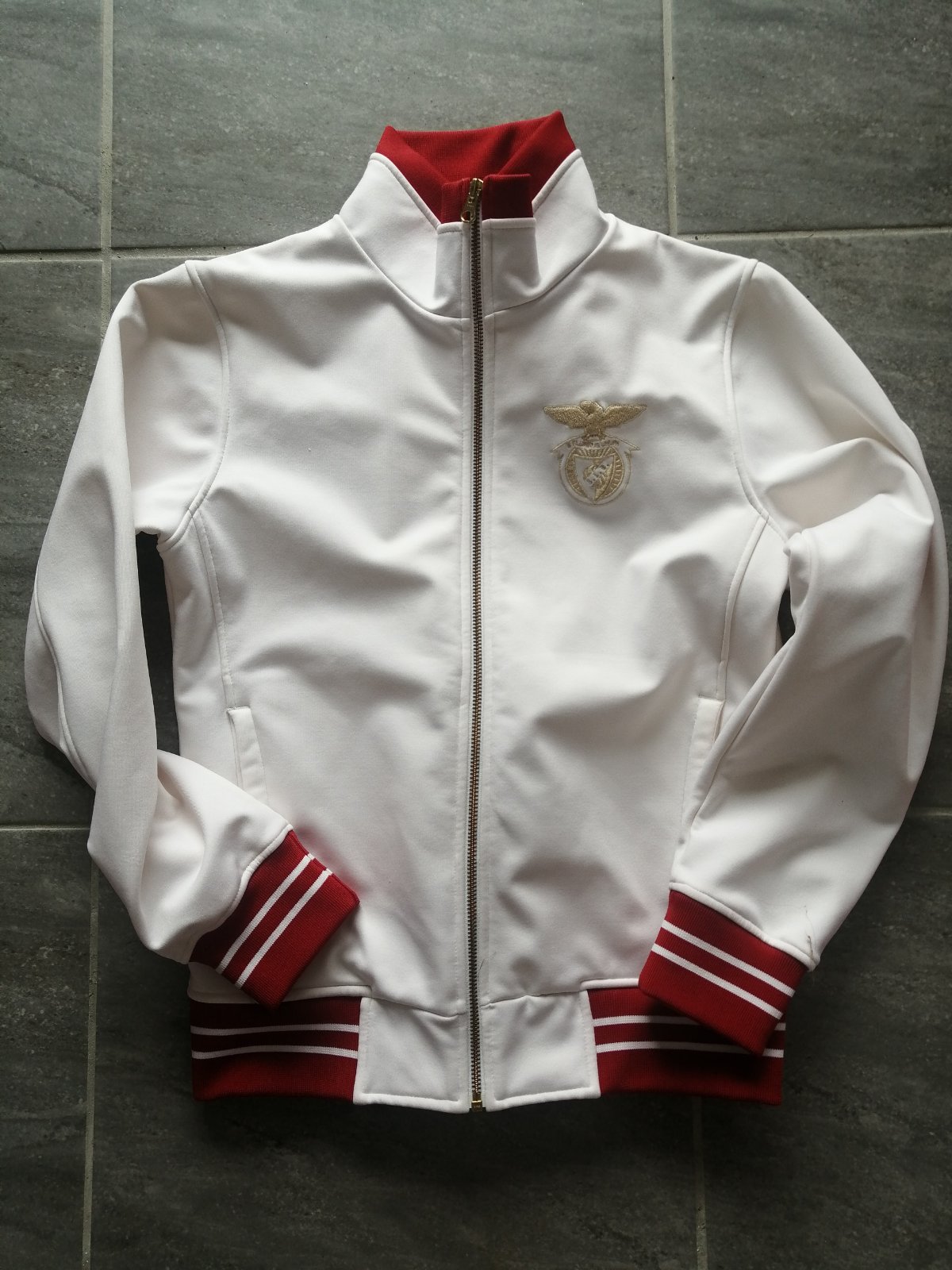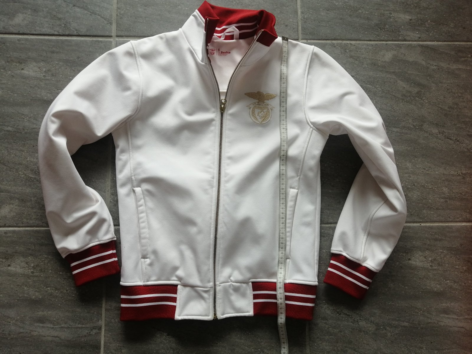 Výborná, kvalitná, merch bunda Benfica Lisabon, portugalská výroba, pevná, hustá látka z polyesteru, vnútri flís. Mužské Sko, rozmery na obrázku, vhodné však aj pre ženy. Kupujte podľa rozmerov na foto.