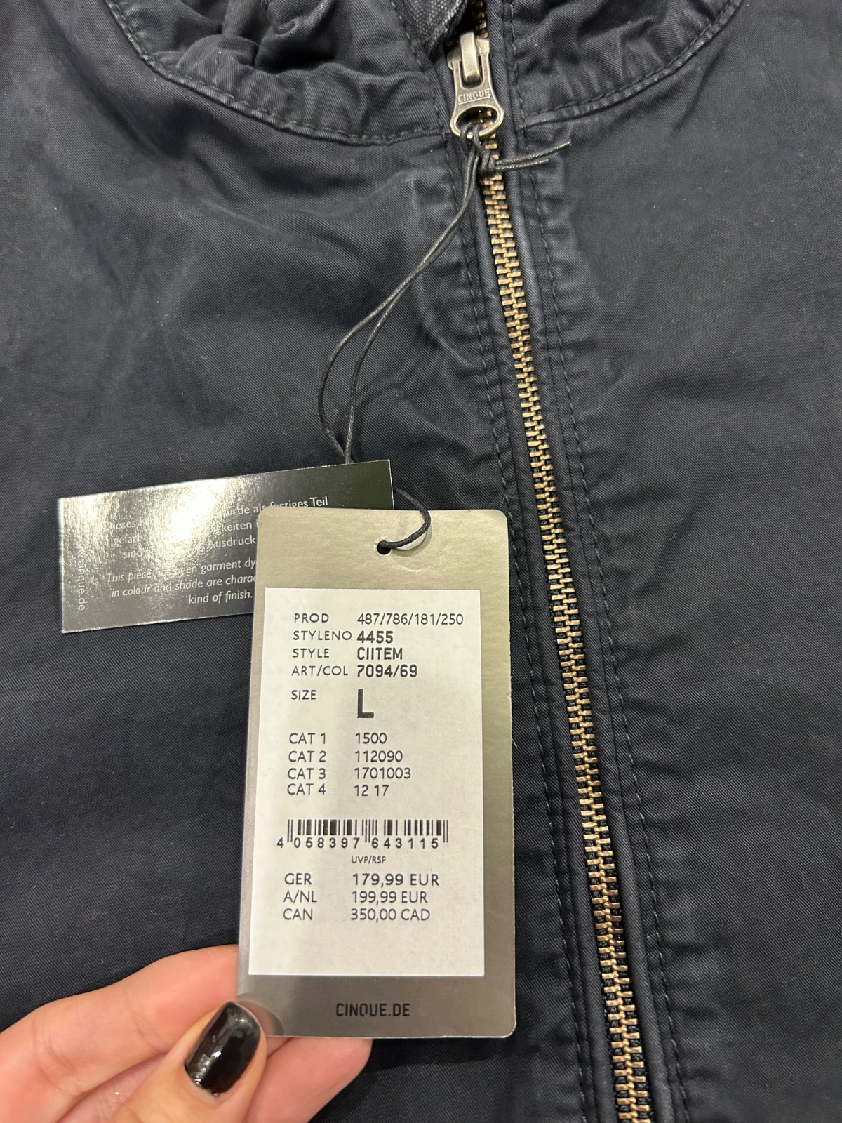 Cinque nova panska premakana prechodna vetrovka,s etiketou,PC 179 eur, velkost L,dlzka je 67cm,dlzka rukava od krku je 82cm a sirka v podpazusi je cca 56x2cm