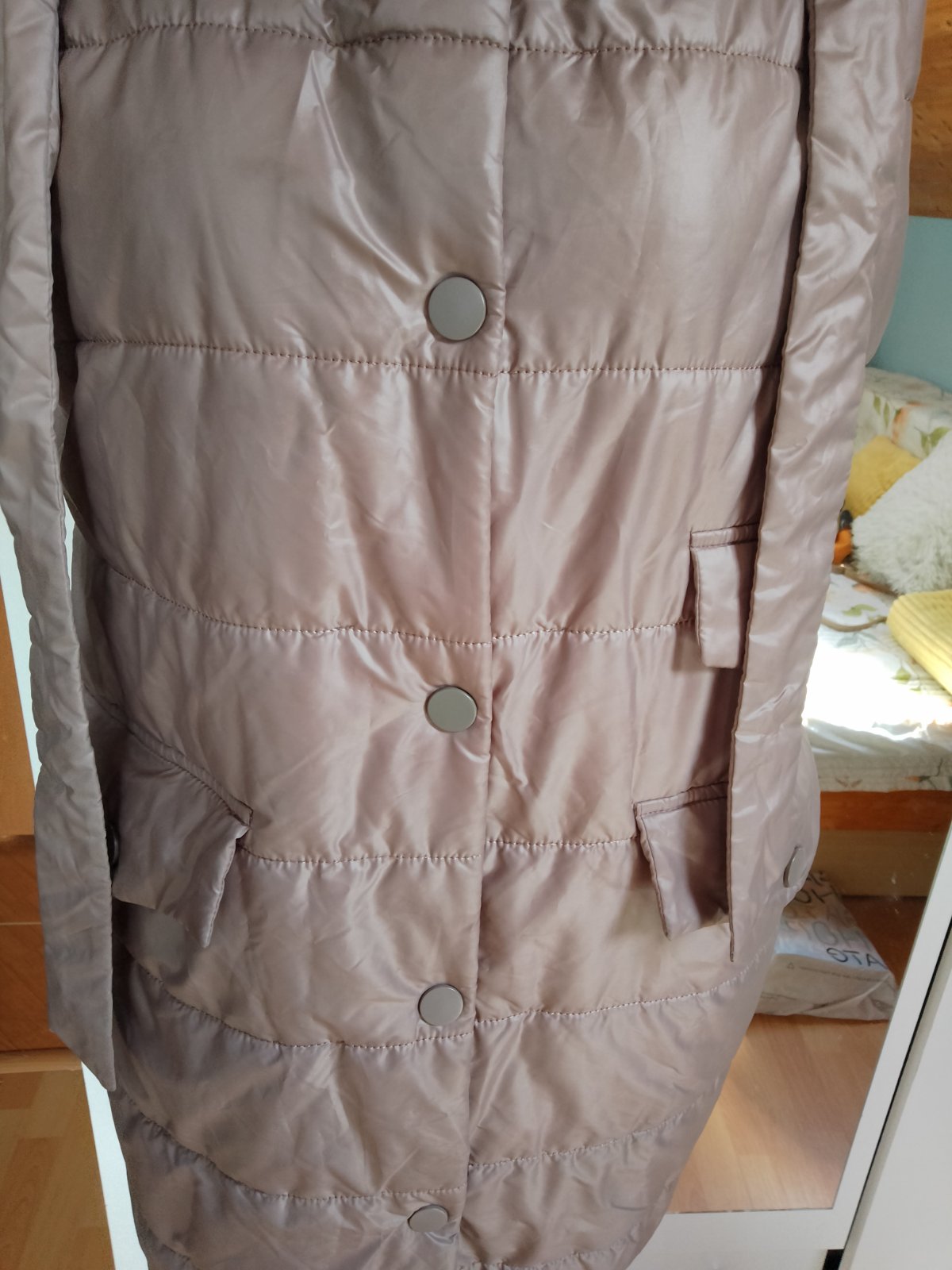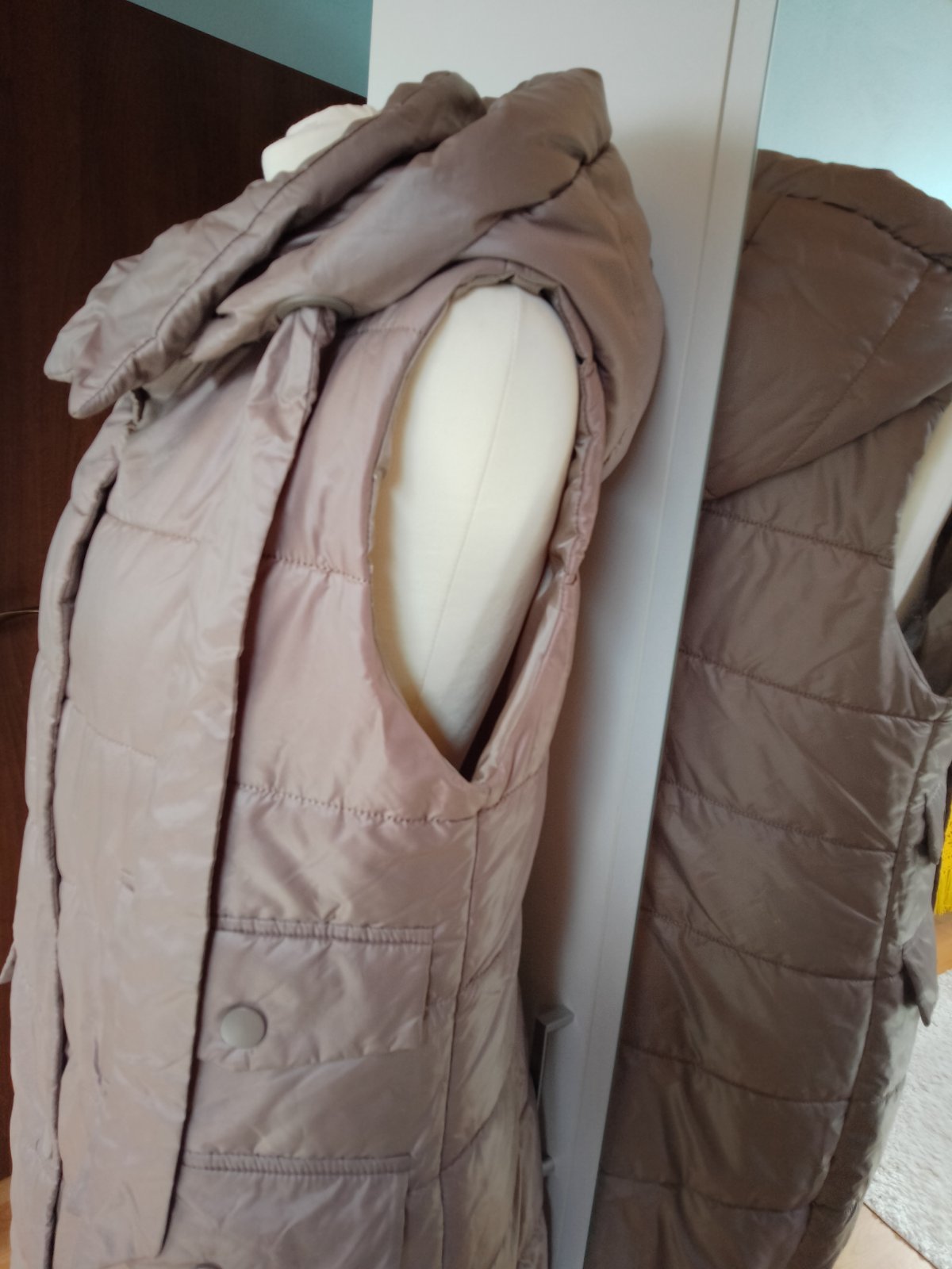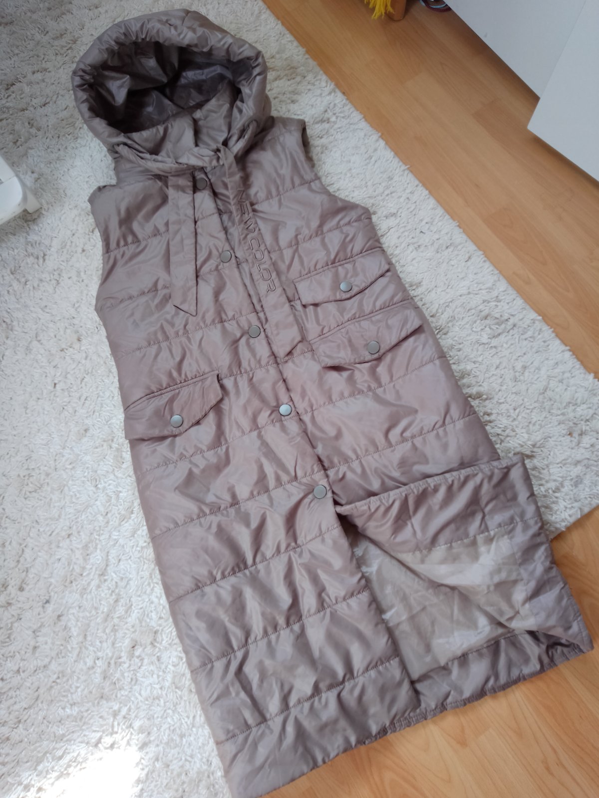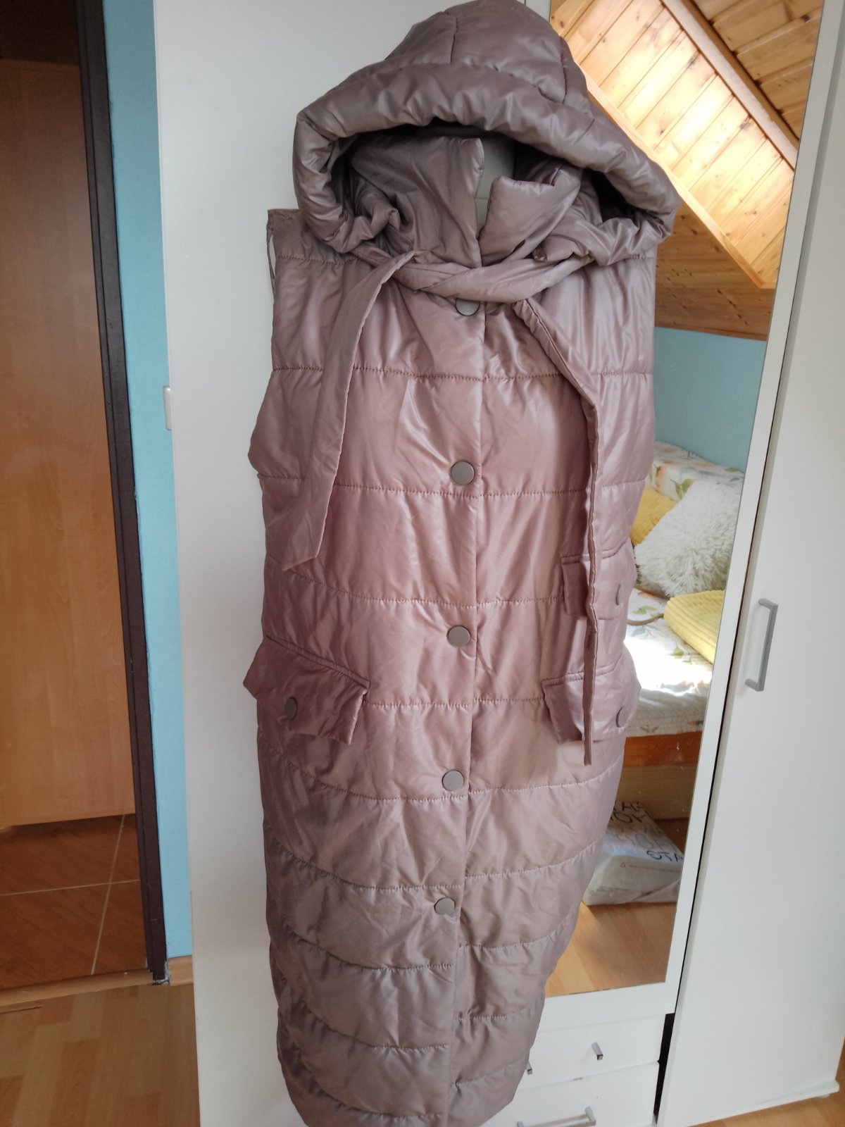 Vesta v dobrom stave kapucňa sa dá odzipsovat, zapína sa na cvoky, dva vrecká, malo nosené, napísané veľkosť S, ale tu je miera: obvod pod prsiami je 104 CM, dĺžka je 103 CM. Platba 12eur vopred, v cene je aj poštovné doporučene druhou triedou, na dobierku nie.Vesta je lahucká a tepla.