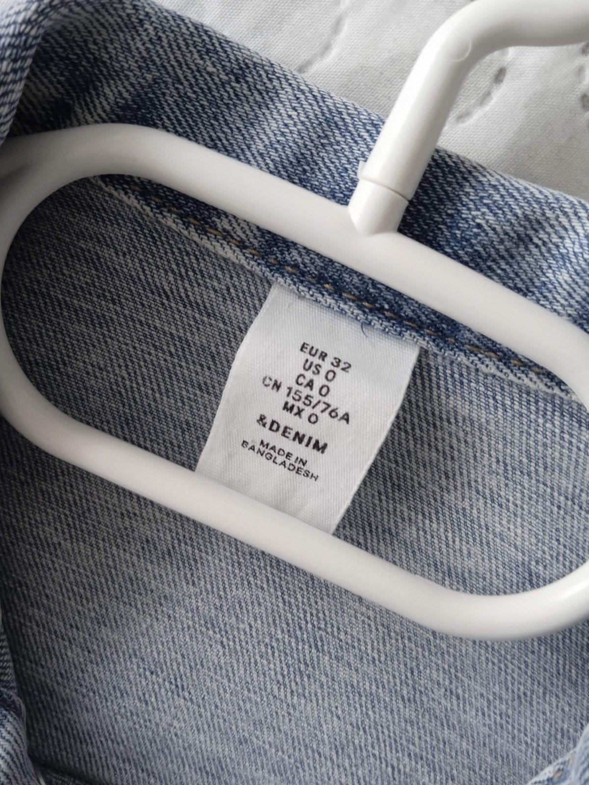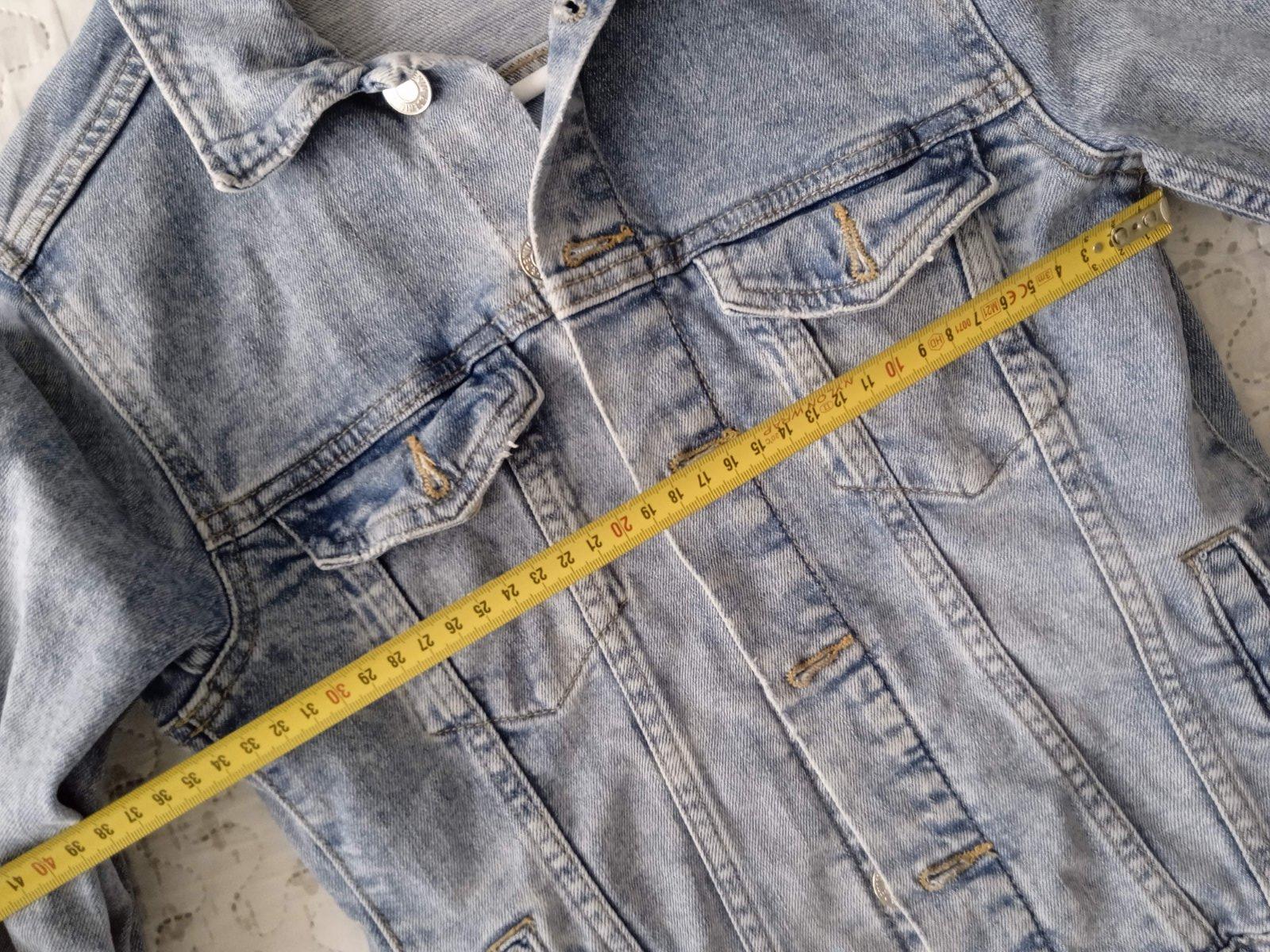 pekny noseny stav s beznymi znamkami pouzivania (vid. foto), velkost 32, vzdy aktualna trendy riflova / dzinsova bunda, 100% bavlna, rozmery (cca): dlzka 50 cm, sirka 2x41.5 cm (pod pazuchami) a 2x...