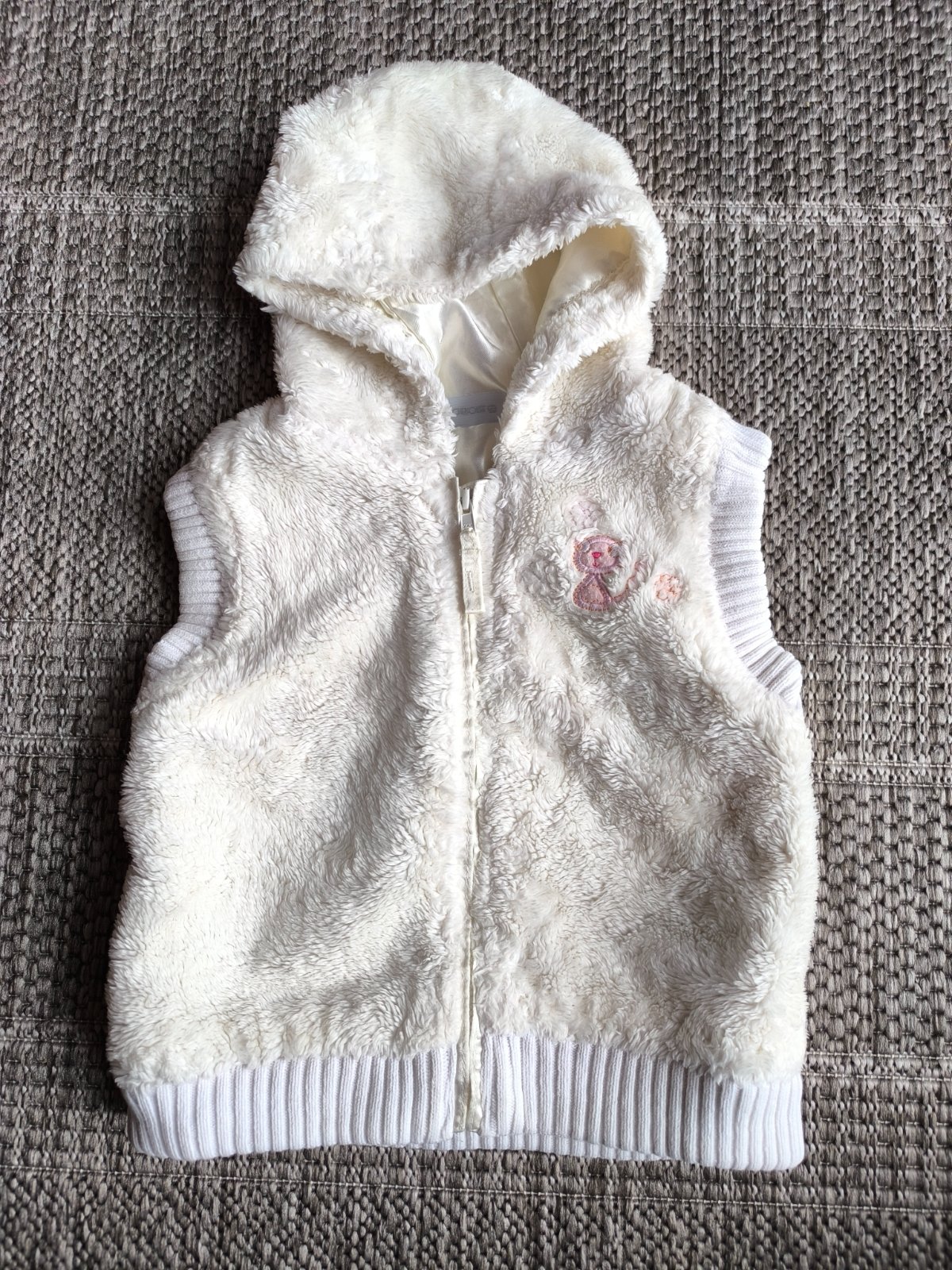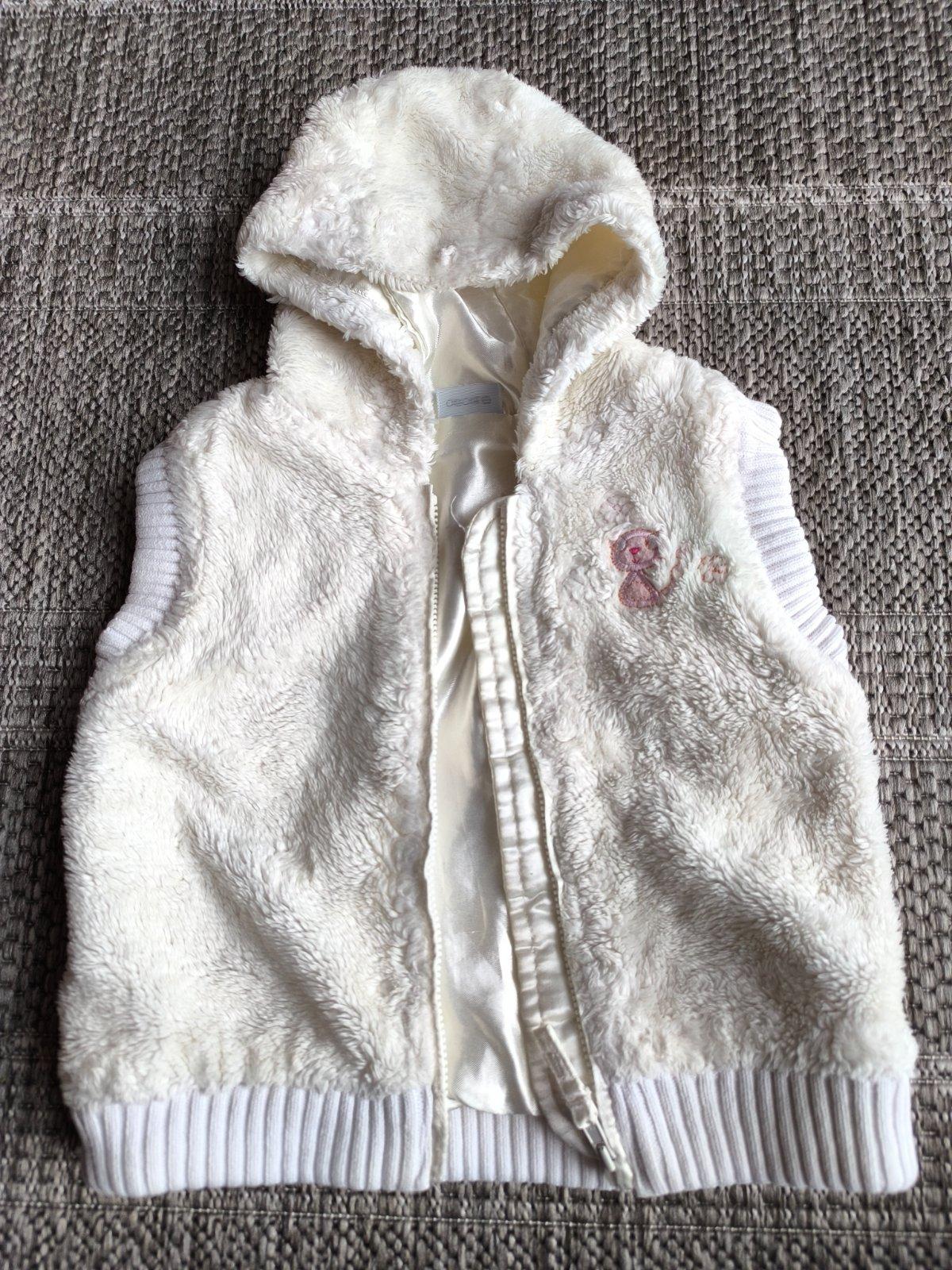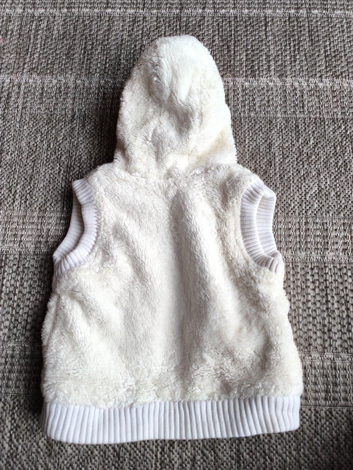Hrejivá chlpatá kožušinková vesta s kapucňou, podšitá. Veľkosť 86 = 12-18 mesiacov, dĺžka 32cm, šírka 28cm. Vo výbornom stave