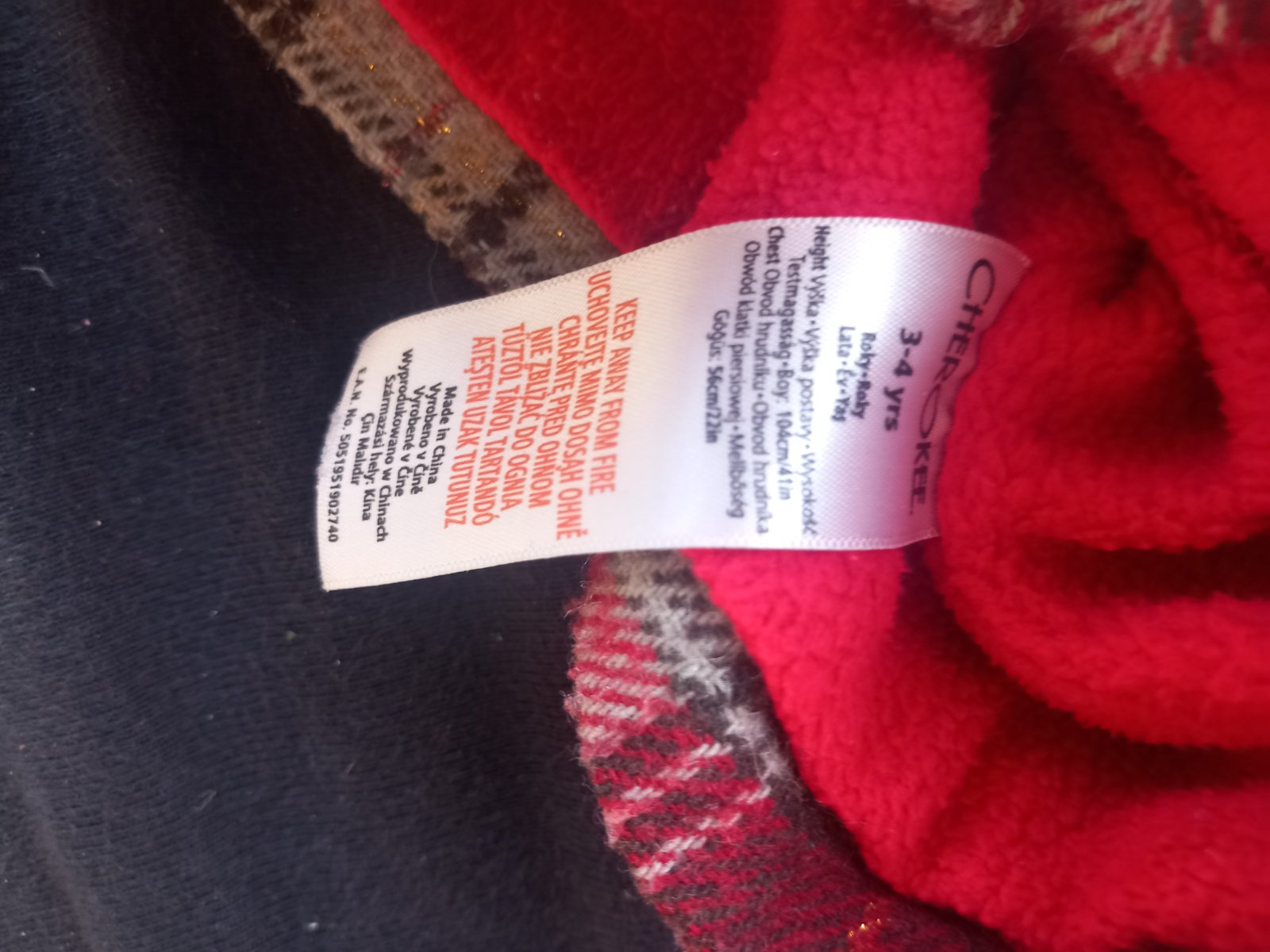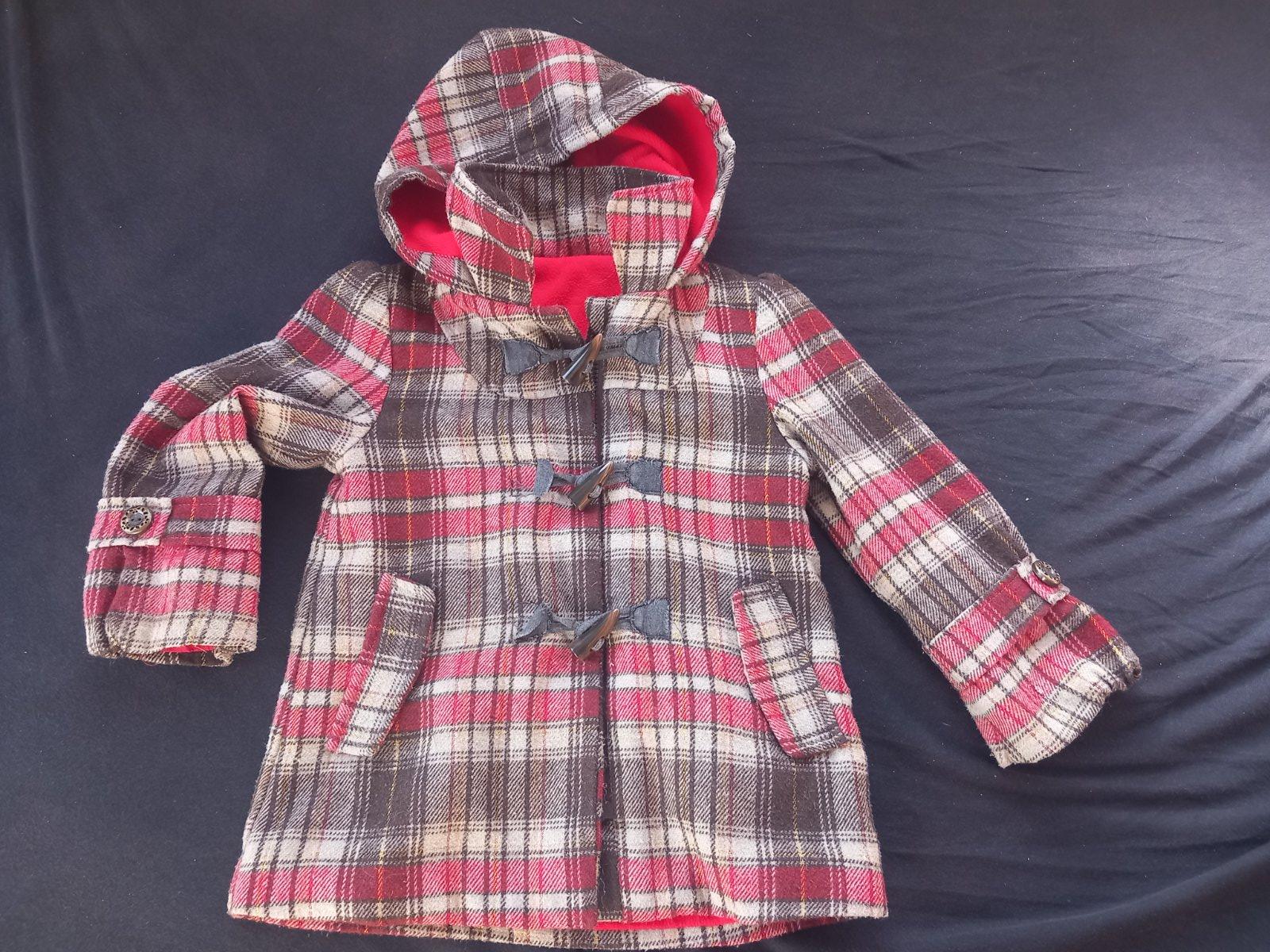 Krasny hnedo - cerveny so zlatym presivanim kabatik, zvnutra flis, na funkcny zips, s 3 ozdobnymi gombikmi, kapucnou, 2 vreckami, bez poskodenia, Cherokee, pise 3 - 4 roky.