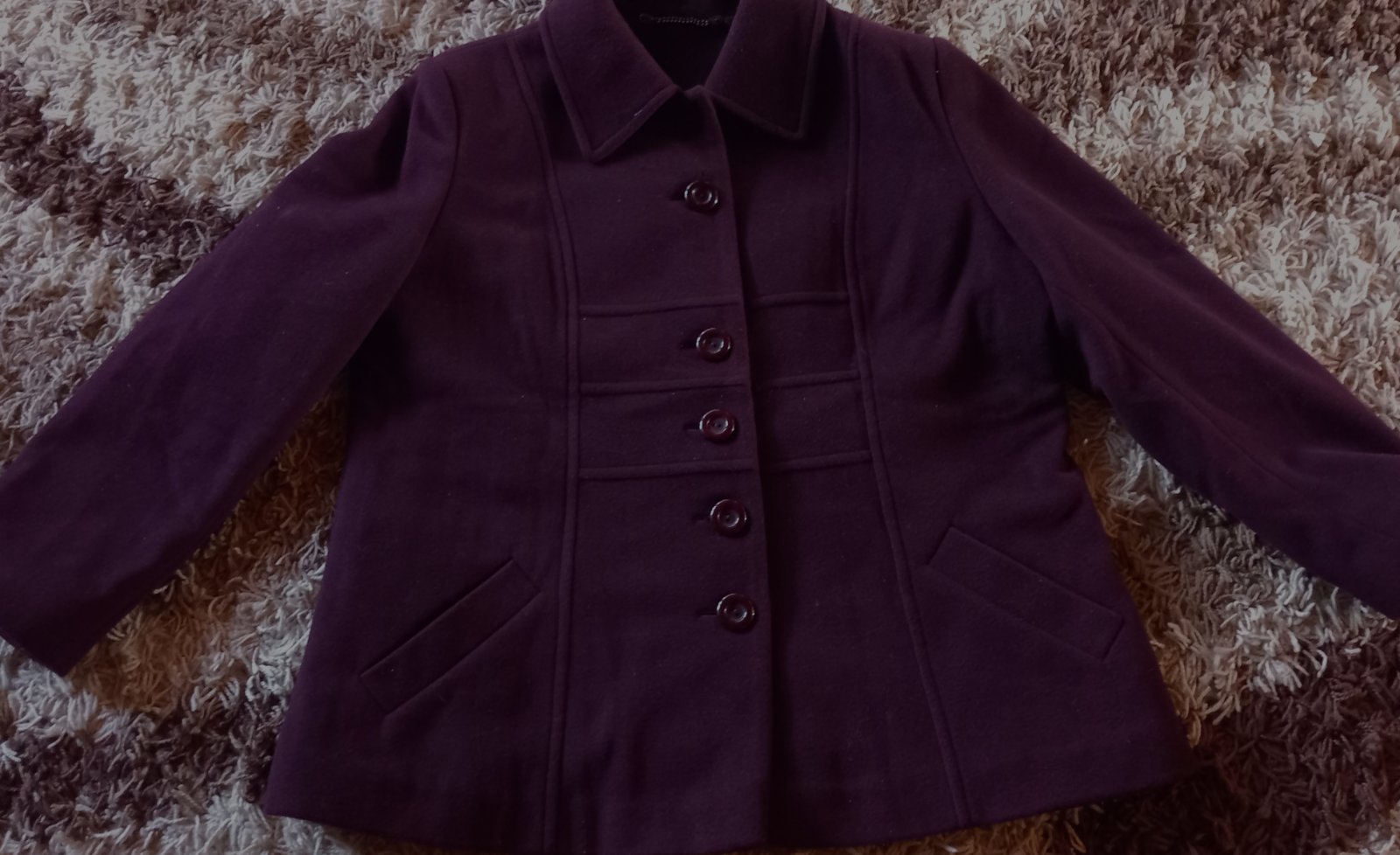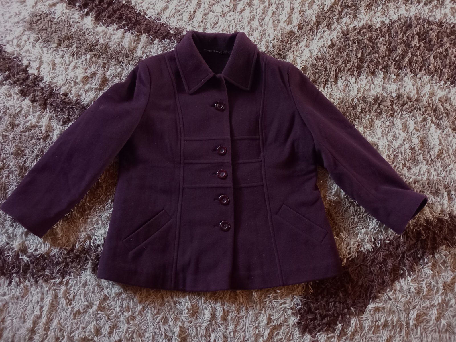 Farba tmavá akoby fialovo bordová, kabátik pekný nepoškodený oblečený zopár krát na veľkosti 3XL,šírka cez prsia 65cm,slovenský výrobca.