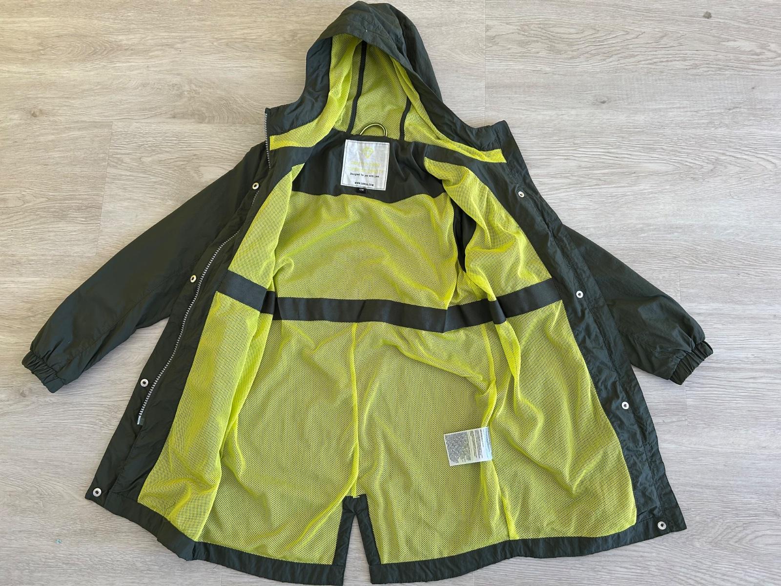 Pekná prechodná vetrovka, nosená bez poškodenia, sem tam sa po praní vytvorí na niektorých miestach tmavší akoby fliačik ale stále na inom mieste podľa toho ako schne vetrovka, bežným okom to nie j...