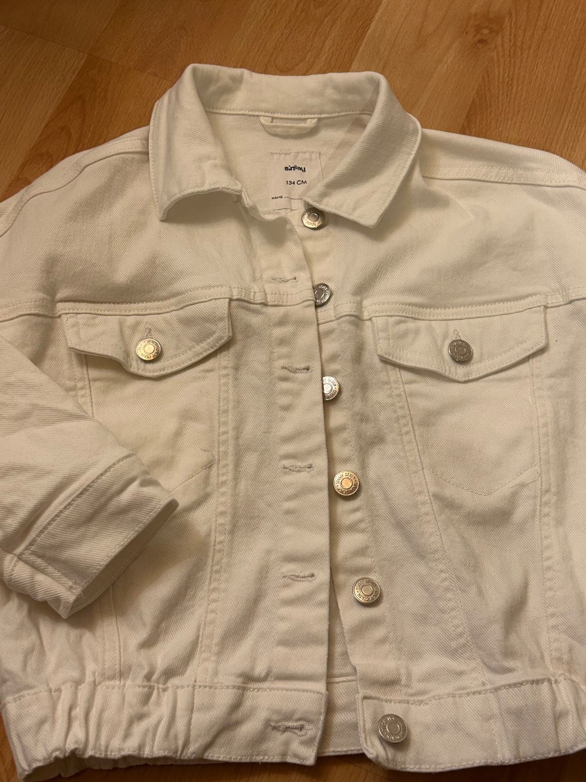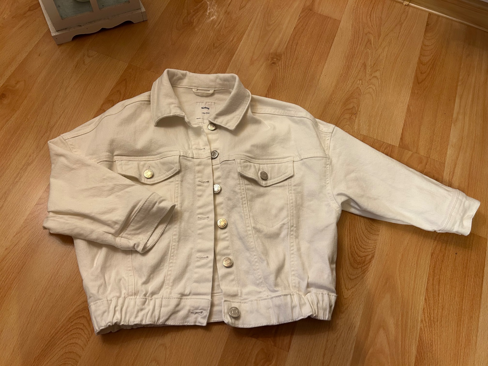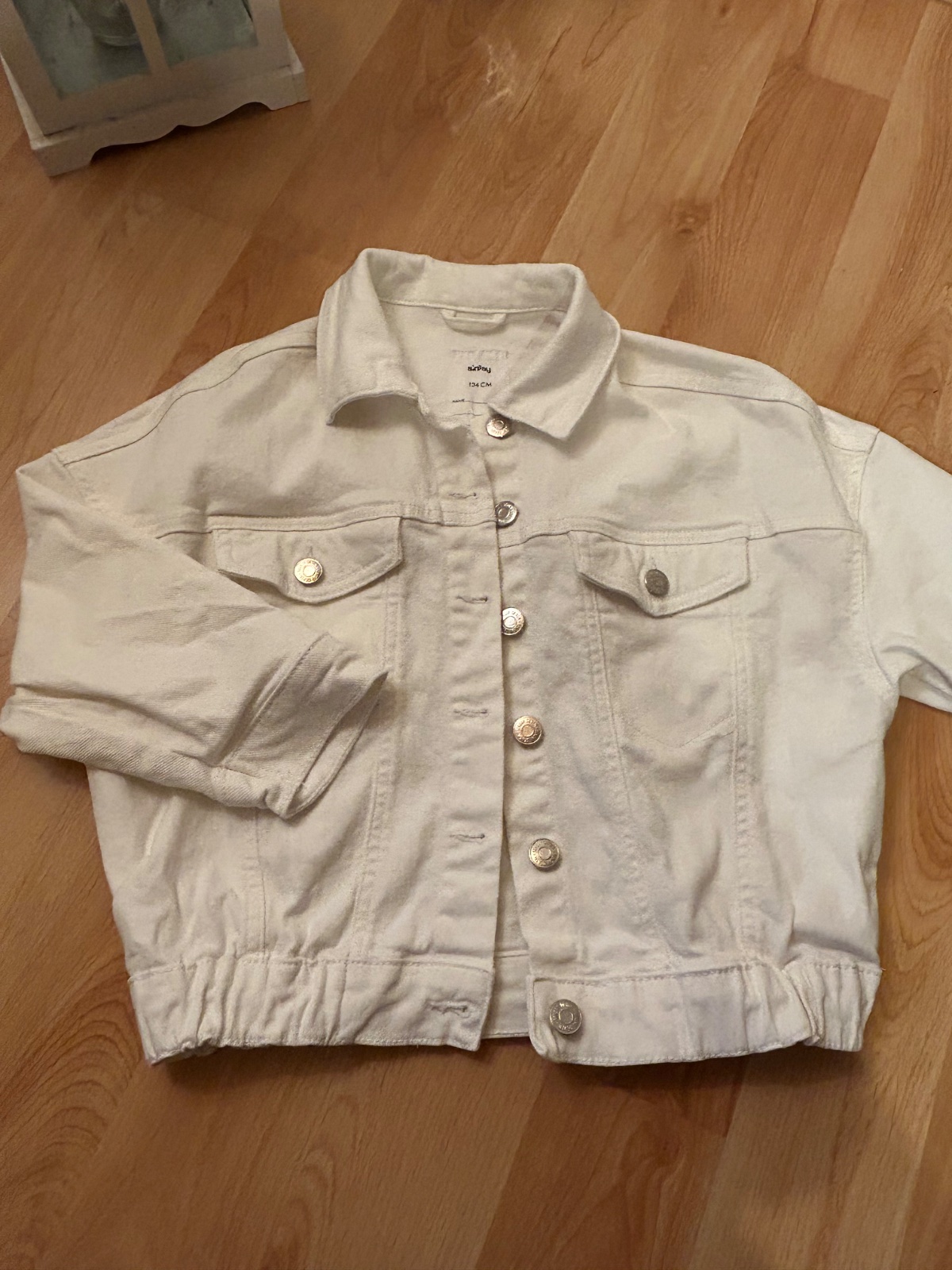 Dievčenská biela riflová bunda, veľ.134, Sinsay, 3/4rukáv, použitá asi dva krát, bez poškodenia, cena 6eur+poštovné
