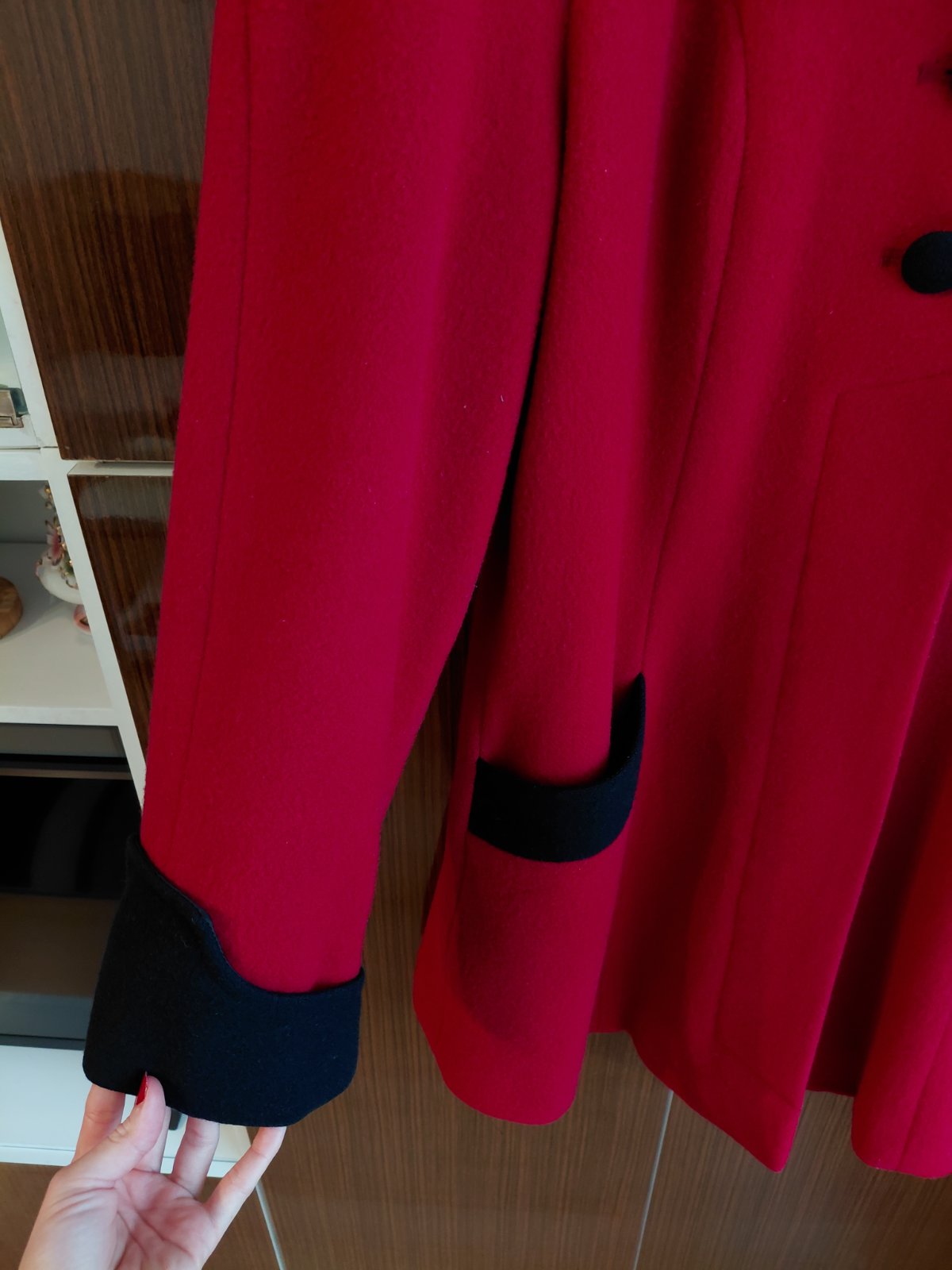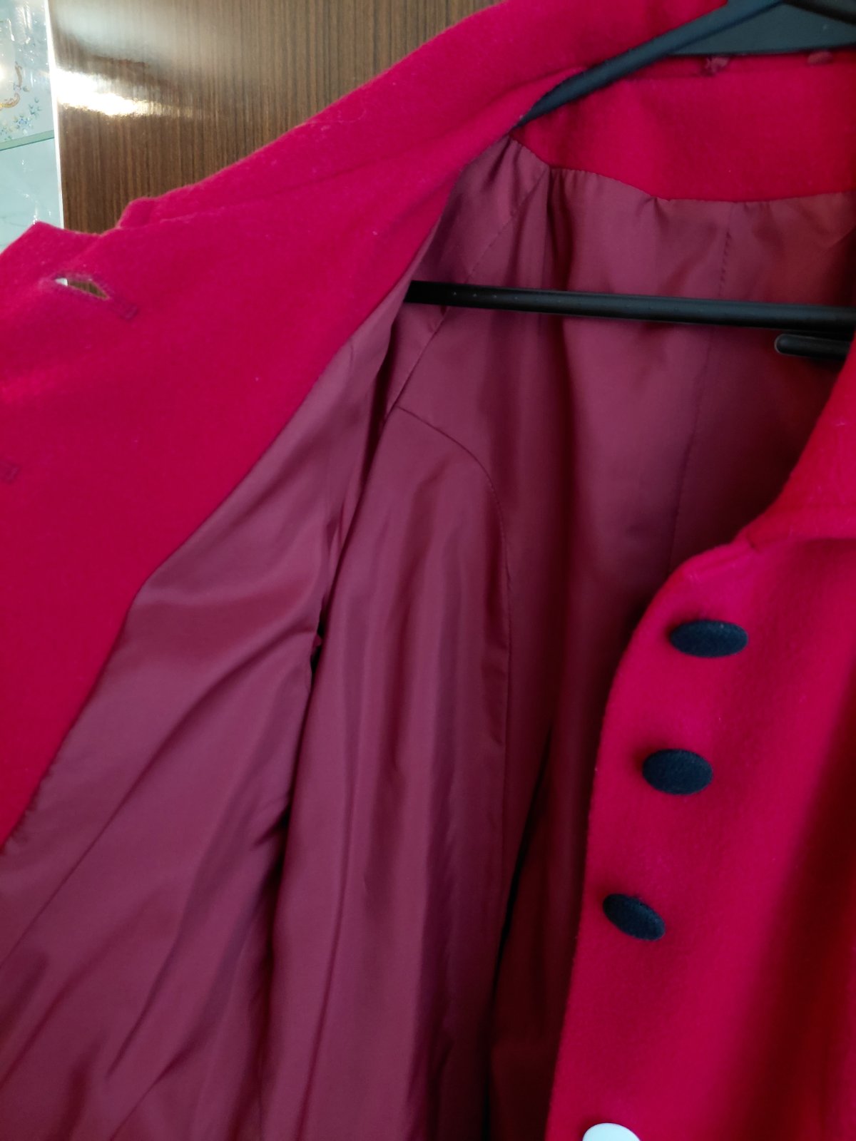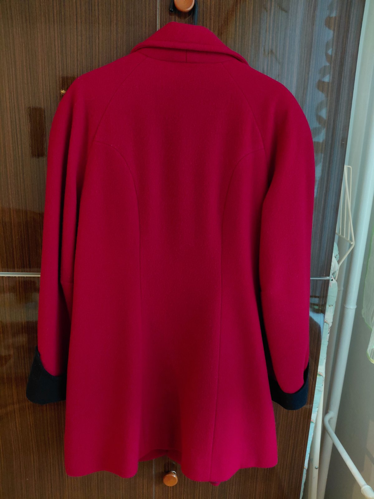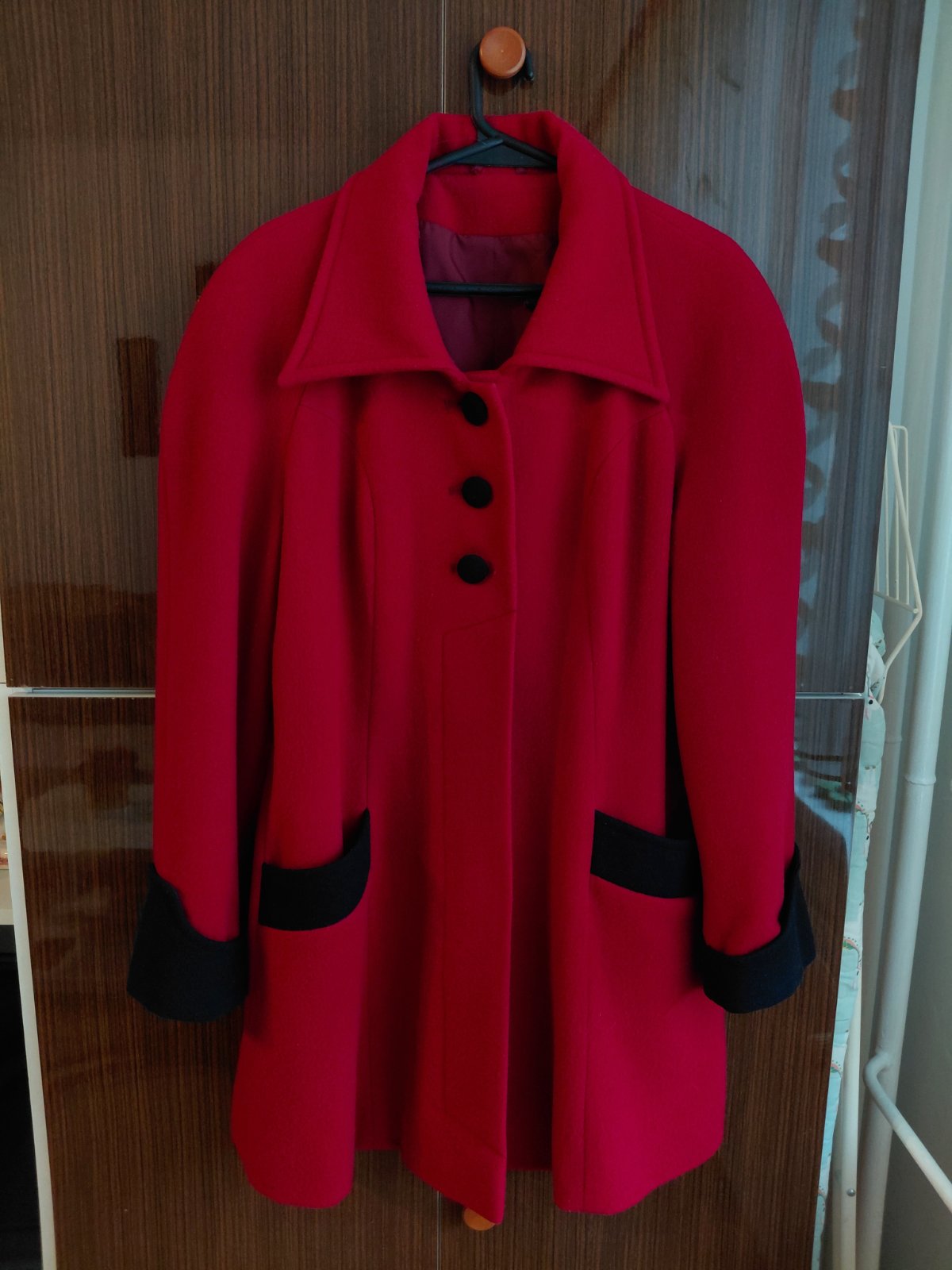 Dámsky dlhší, tmavší bordový kabát s golierom, cca po boky alebo pod zadok - závisí od výšky postavy