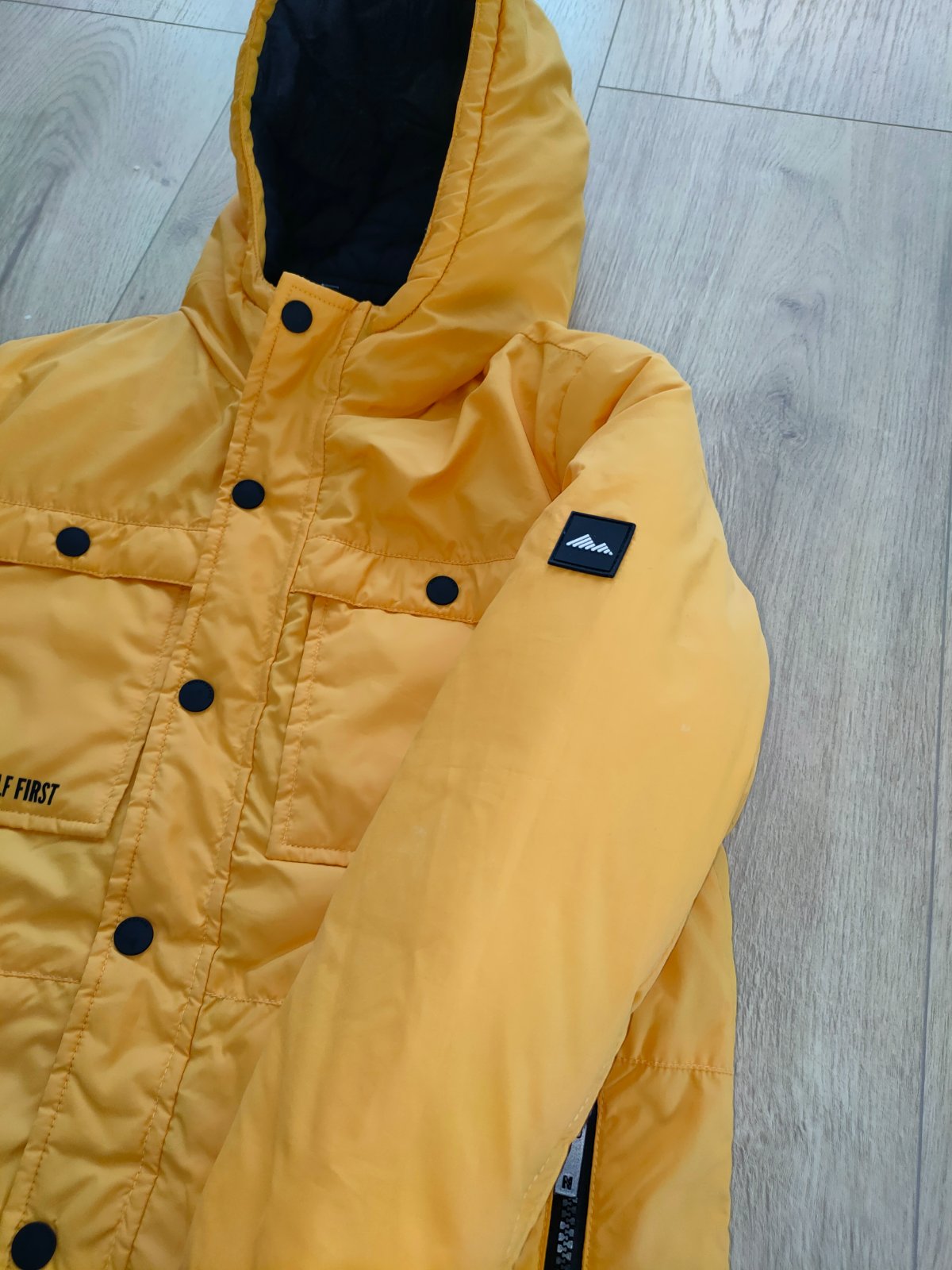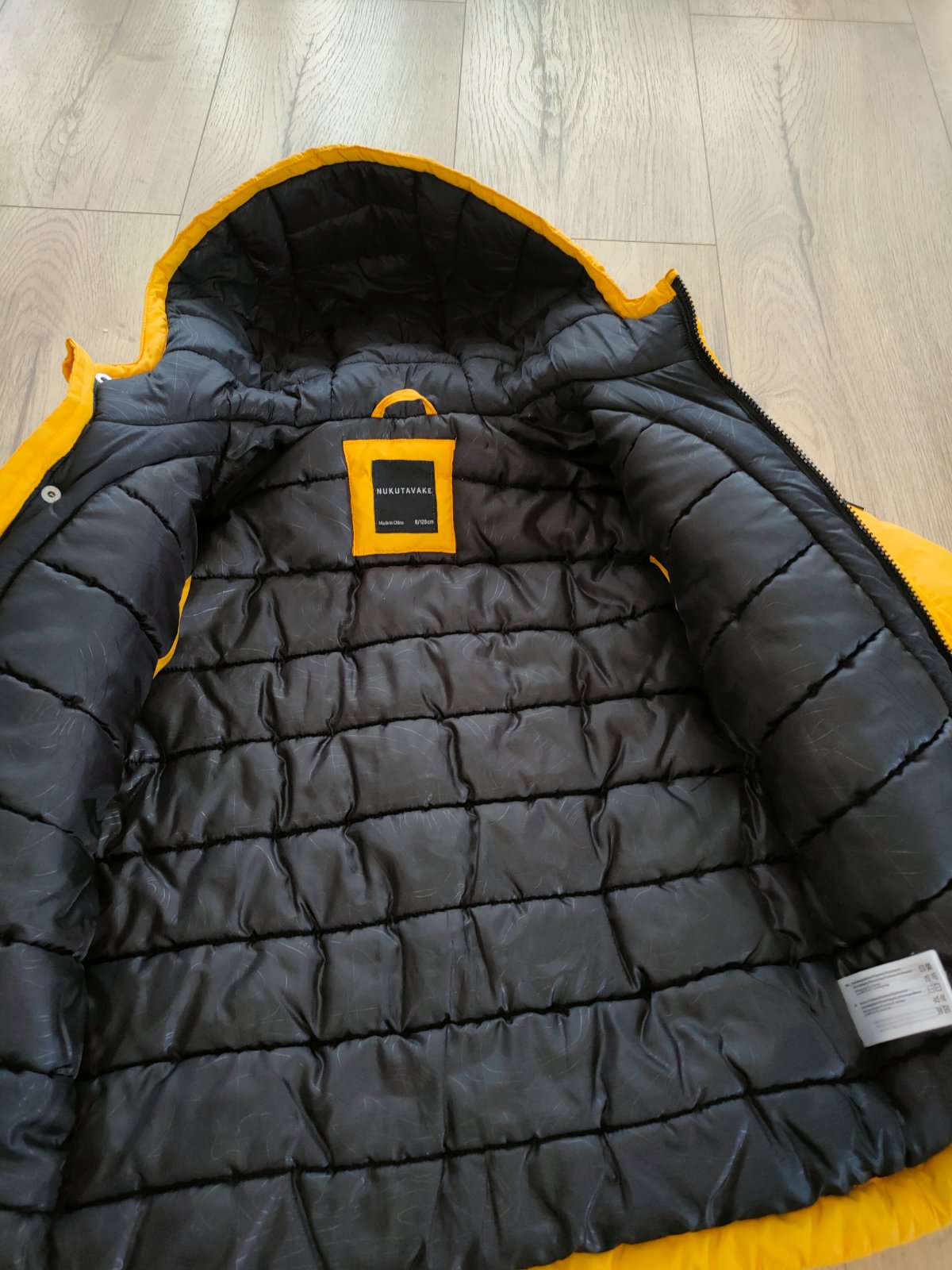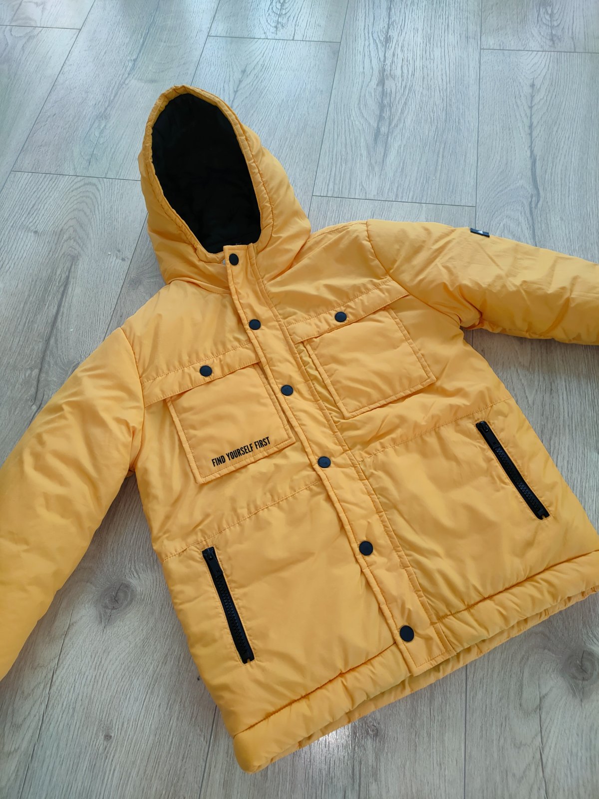 Chlapčenská zimná bunda s kapucňou so zapínaním na zips, Farba: žltá s kombinovaným patentom Veľkosť: 128 (8 rokov) Stav: výborný (bez poškodení)