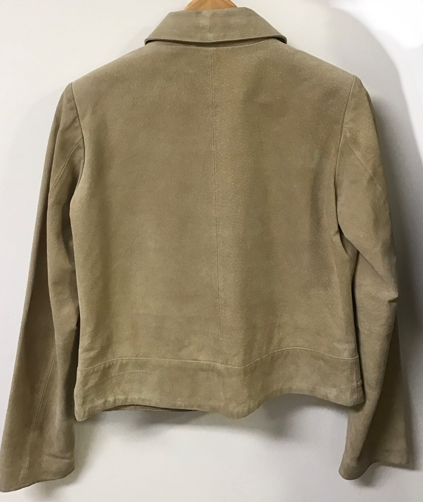 Predám krásnu svetlohnedú jelenicovú bundu kúpenú v Anglicku. Bundička je do pása a bez vreciek. Na saténovej podšívke je malá škvrnka - vidno na fotke.